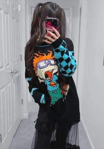 cuz you’re a kid at heart. This oversized sweater has an knit construction, a crew neckline, long sleeves, a ribbed trim, a Chuckie intarsia design on the front and checkered and striped sleeves.