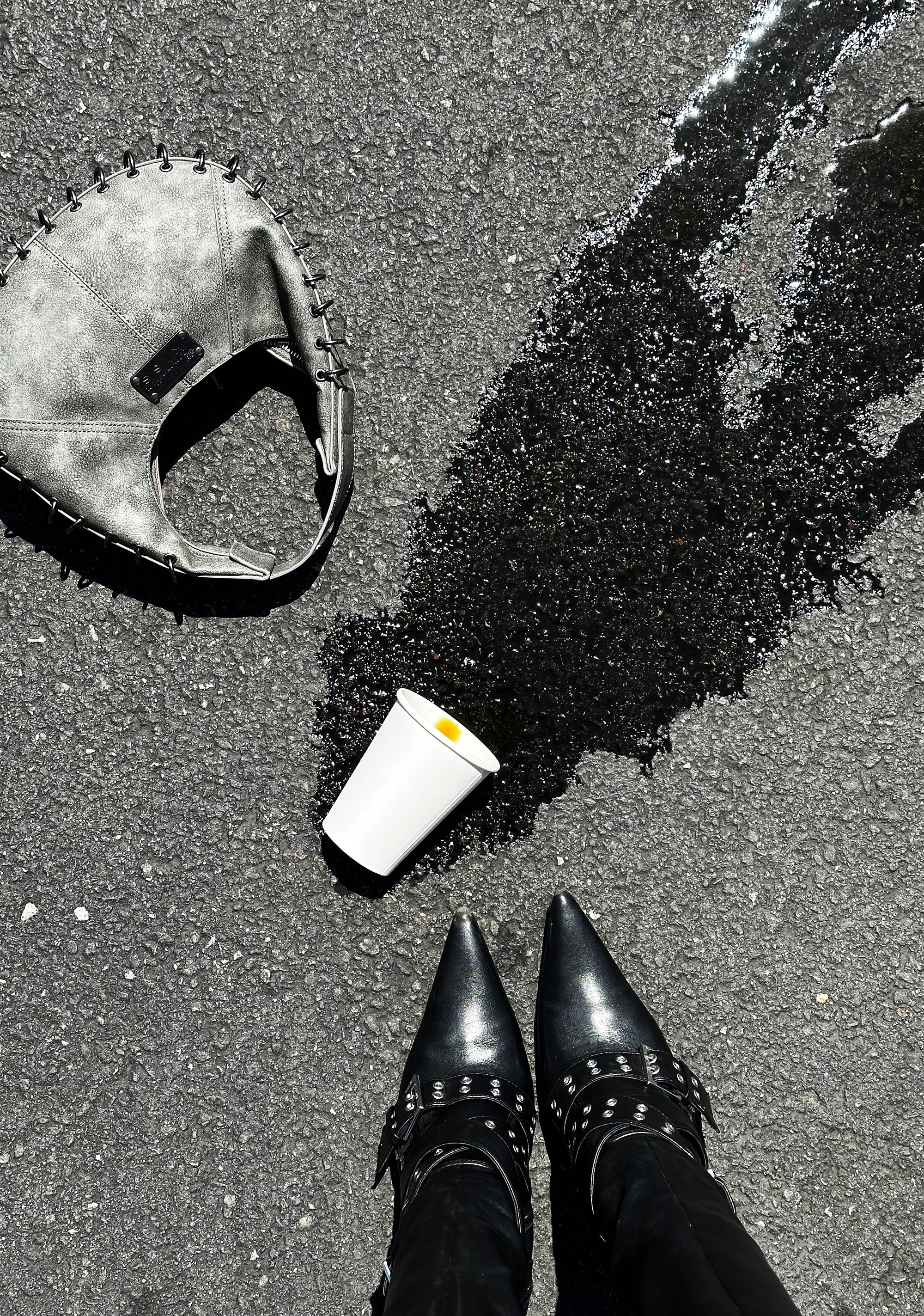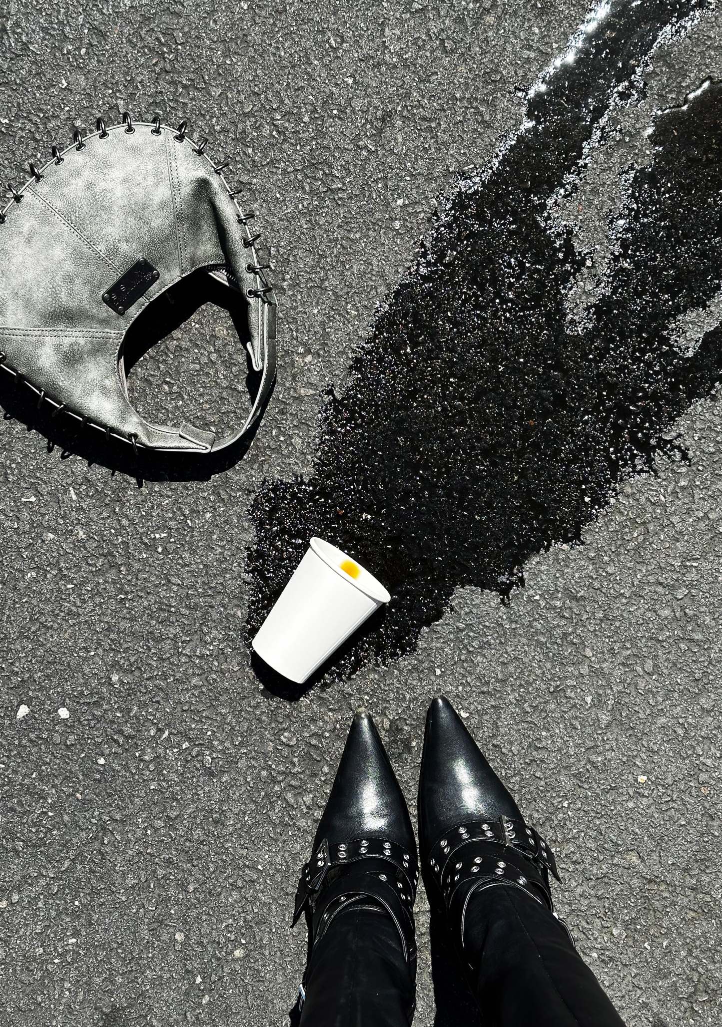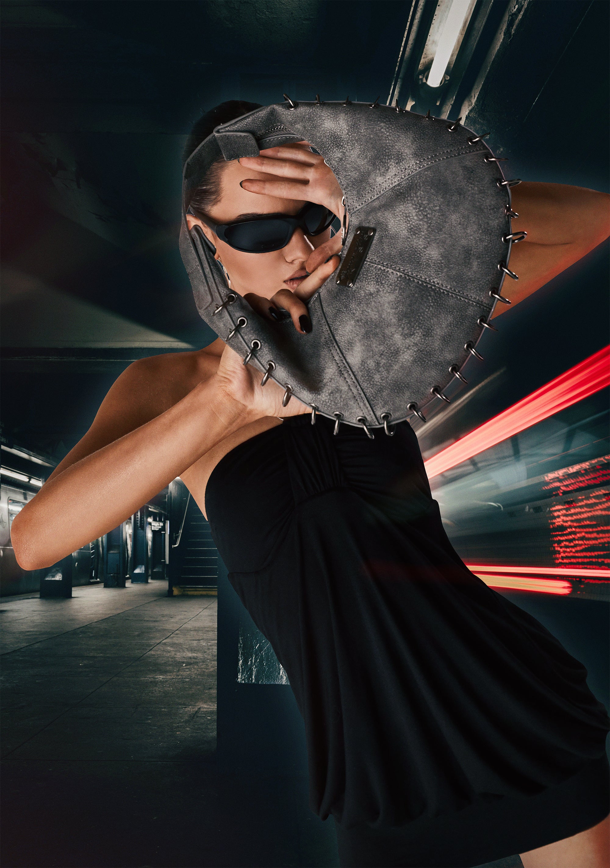 cuz you need that statement piece. This shoulder bag has a vegan leather construction with grommet and o-ring detailing, a handle, and a top zipper closure with brand logo rhinestone zipper pull.