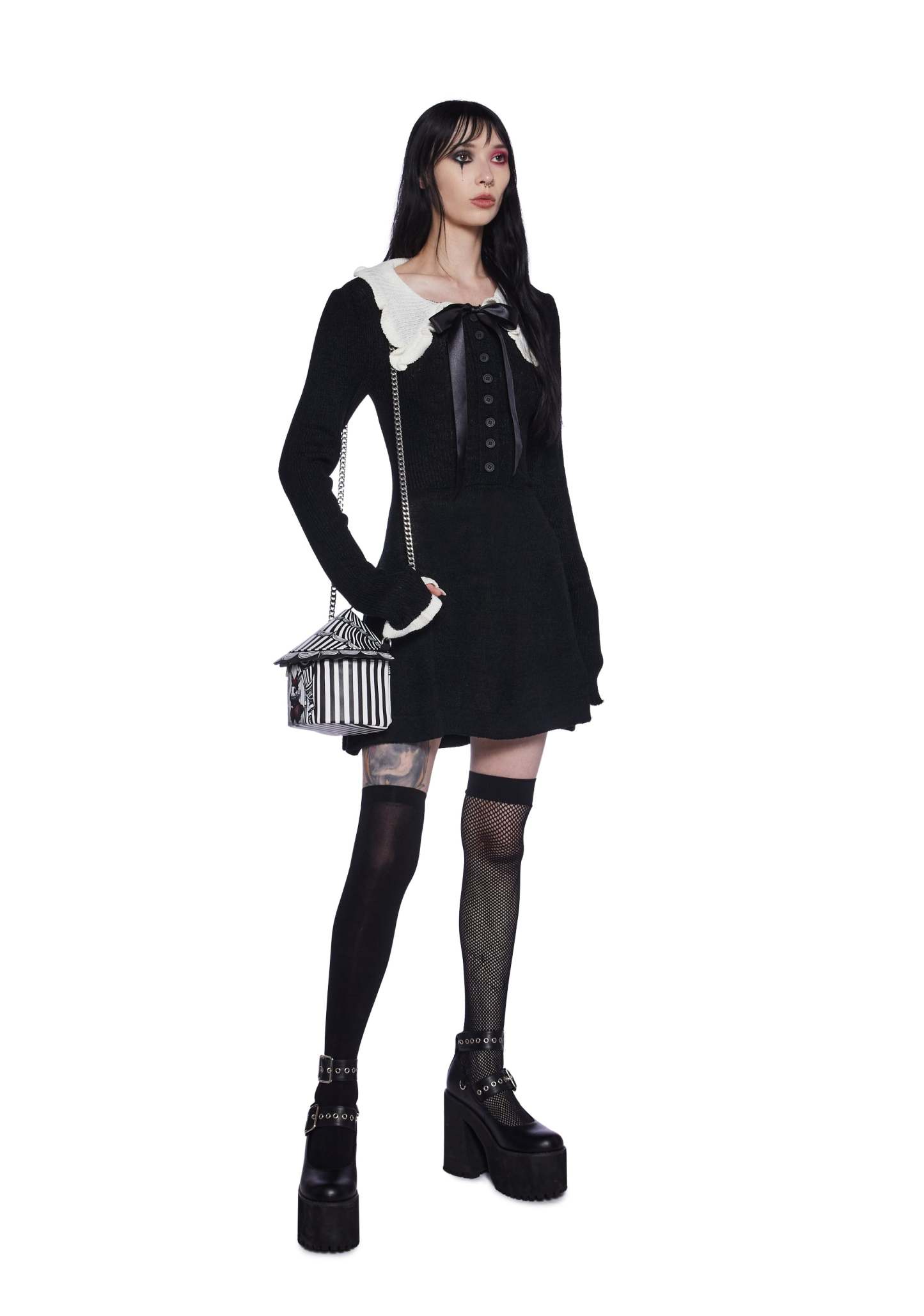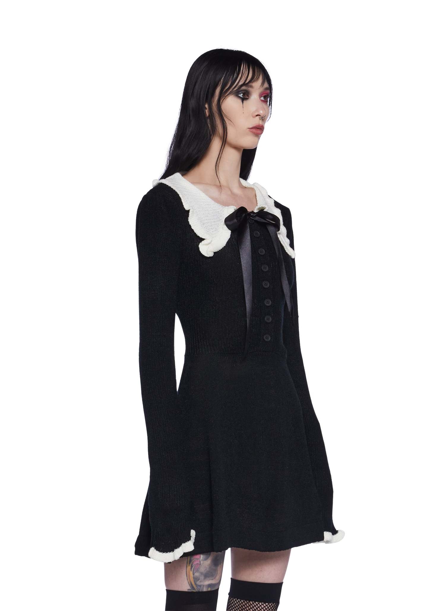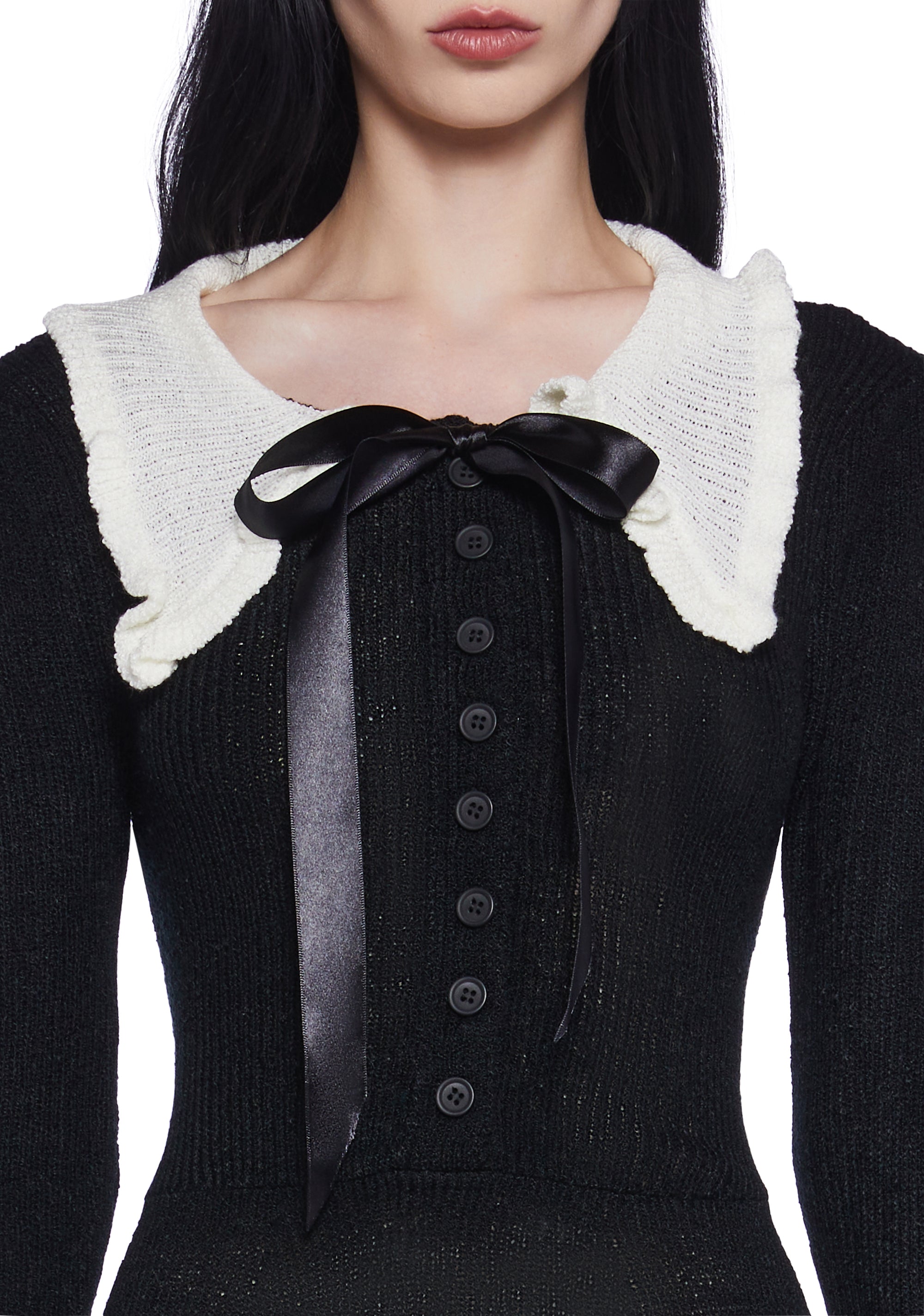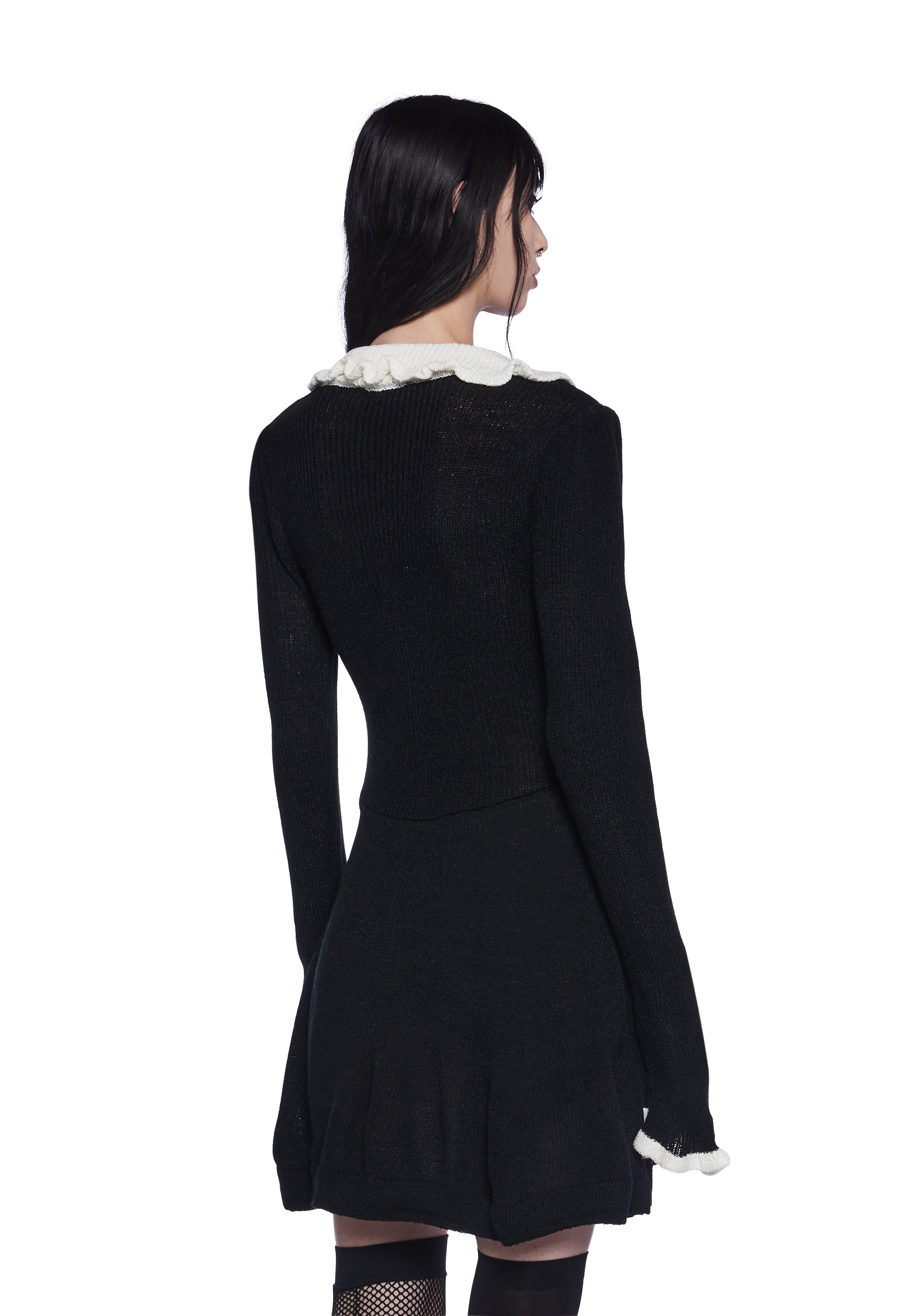 This mini dress has a stretchy sweater knit construction, a ruffled collar with a self-tie ribbon tie, contrast trim detailing, and front button closures.