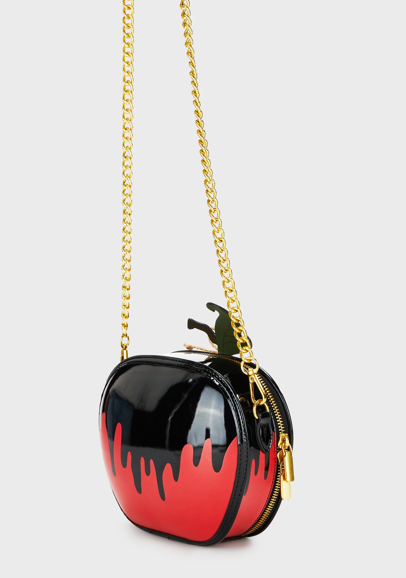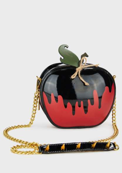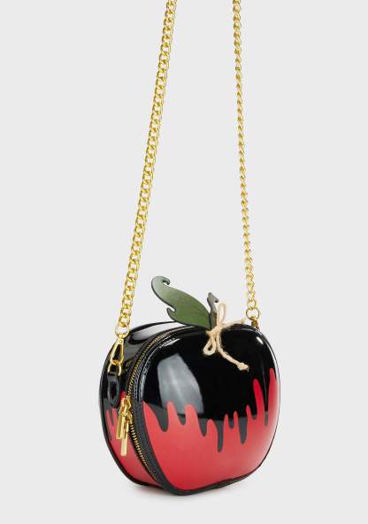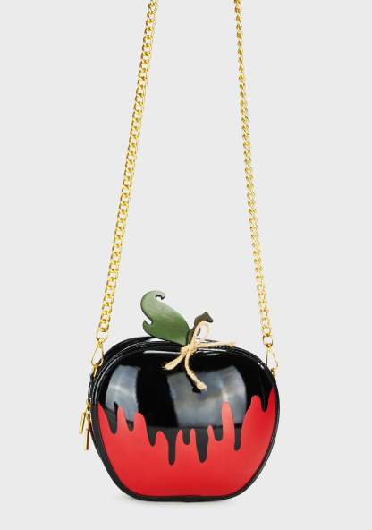 cuz first it's sweet. This crossbody bag has a vinyl construction, has a poisoned apple design, a detachable chain strap with spiked detailing, and an all around double zipper closure.
