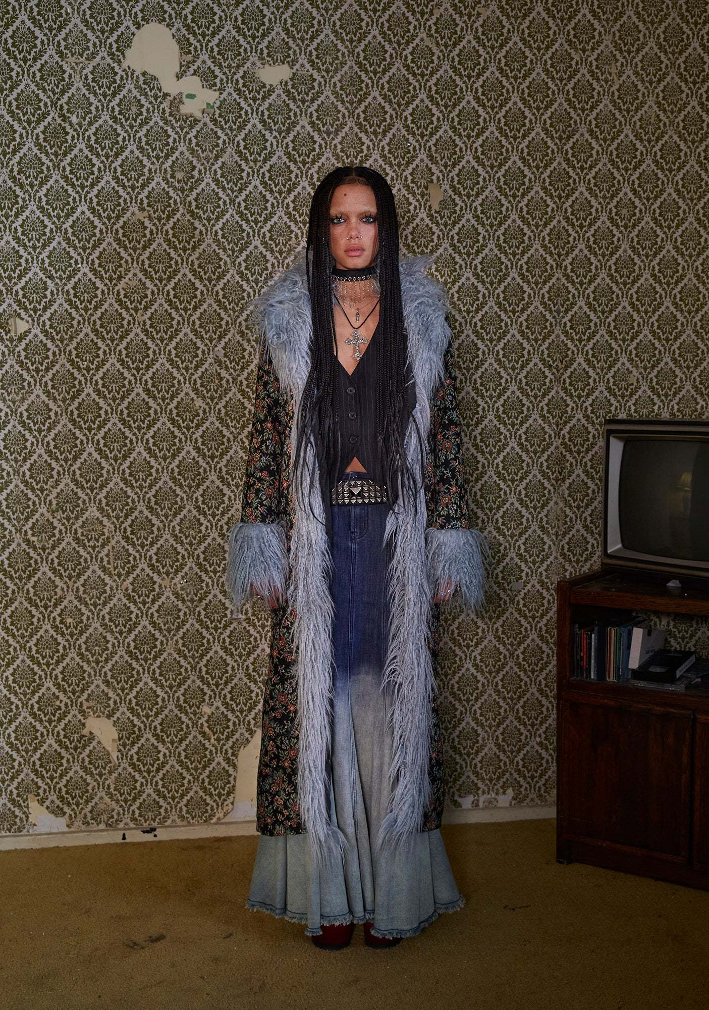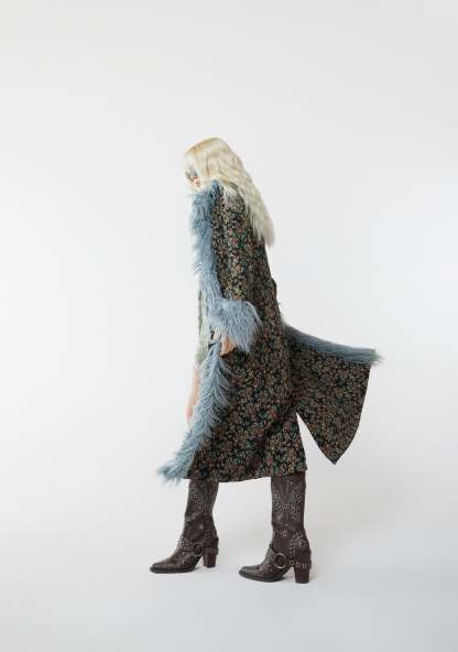 cuz give me bliss or nothing at all. This coat has a jacquard knit construction, a faux fur trim, a front hook and eye closure, and side pockets.