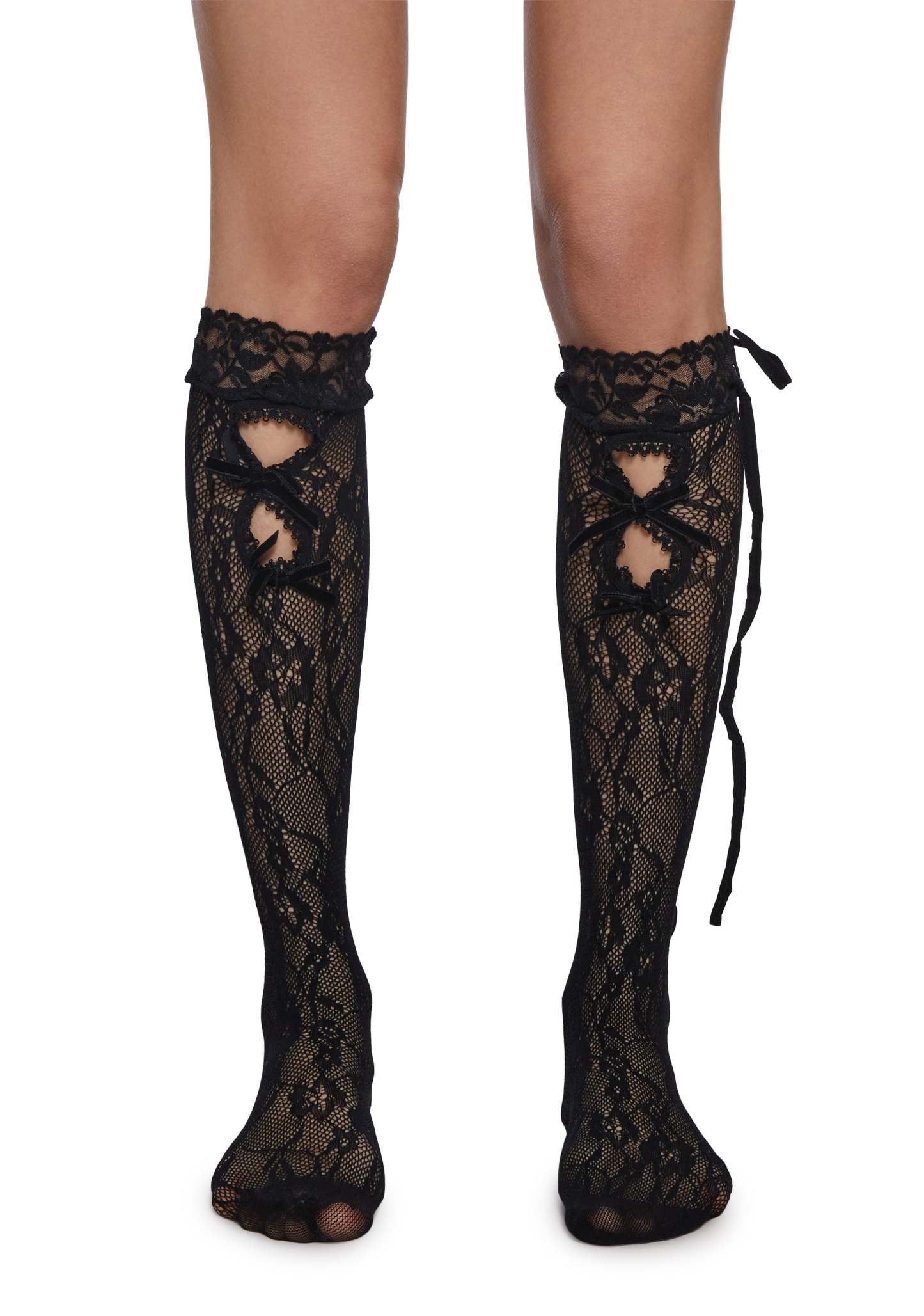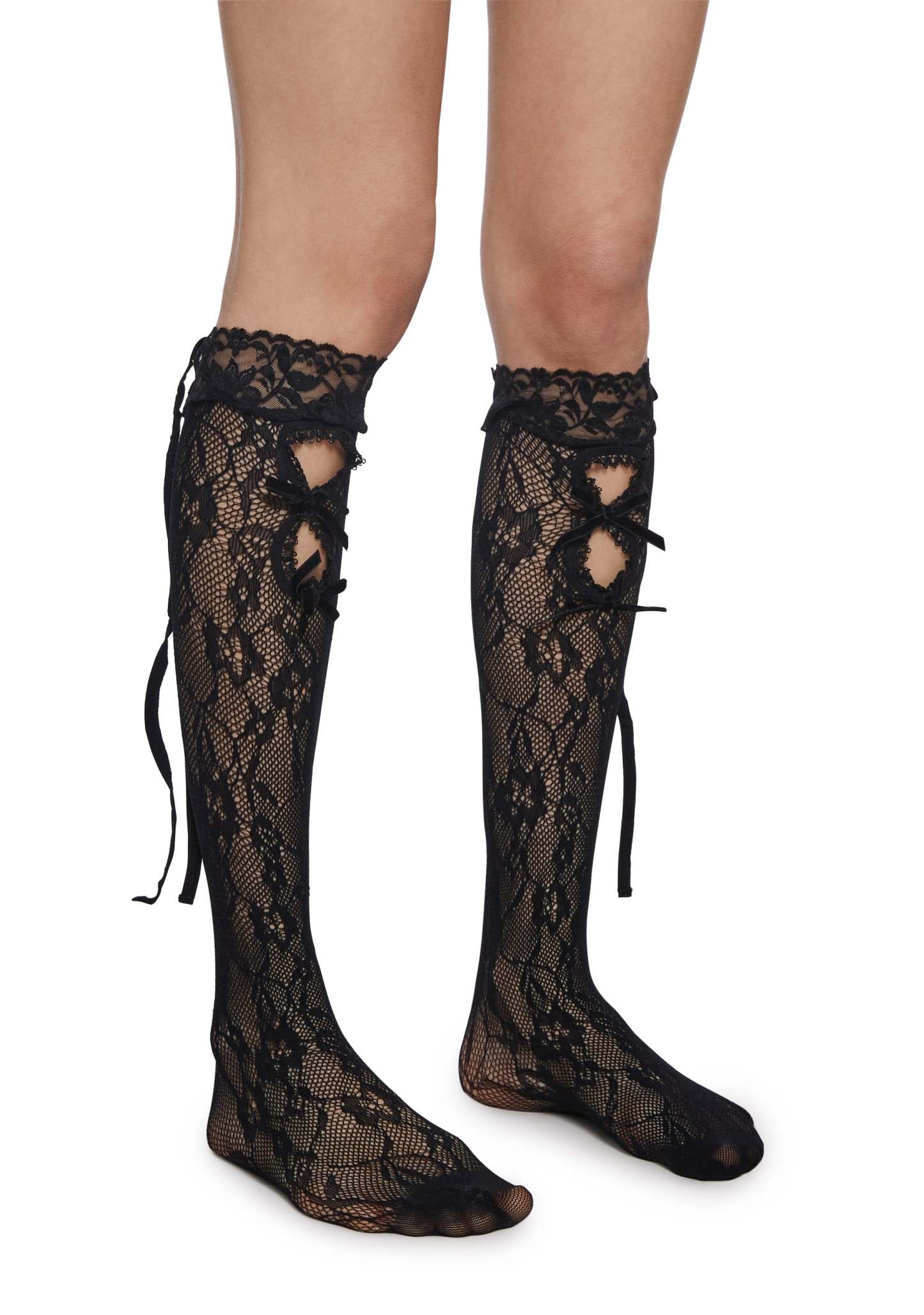 These socks have a sheer lace construction, decorative bows on the front, and adjustable lace up closures.