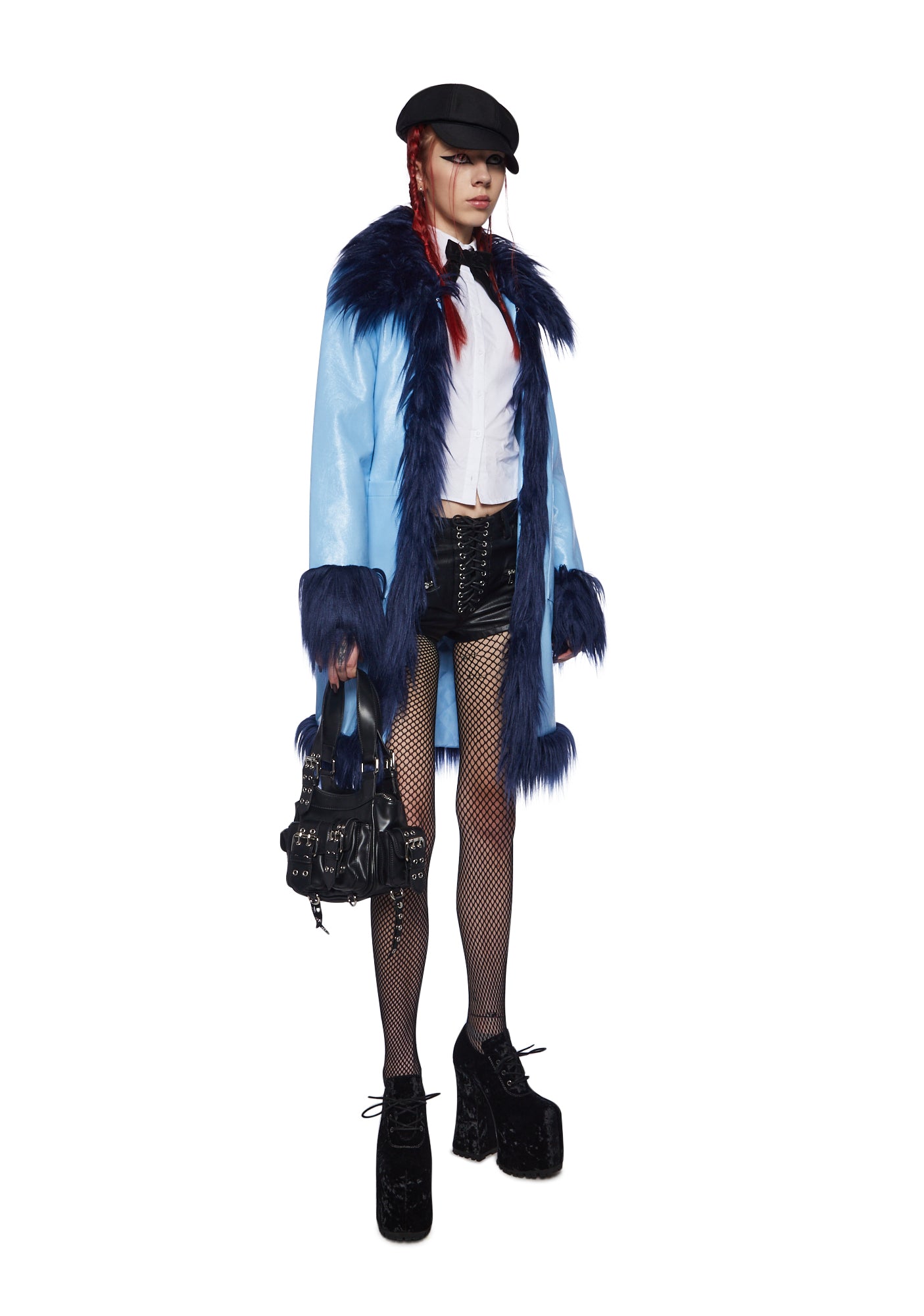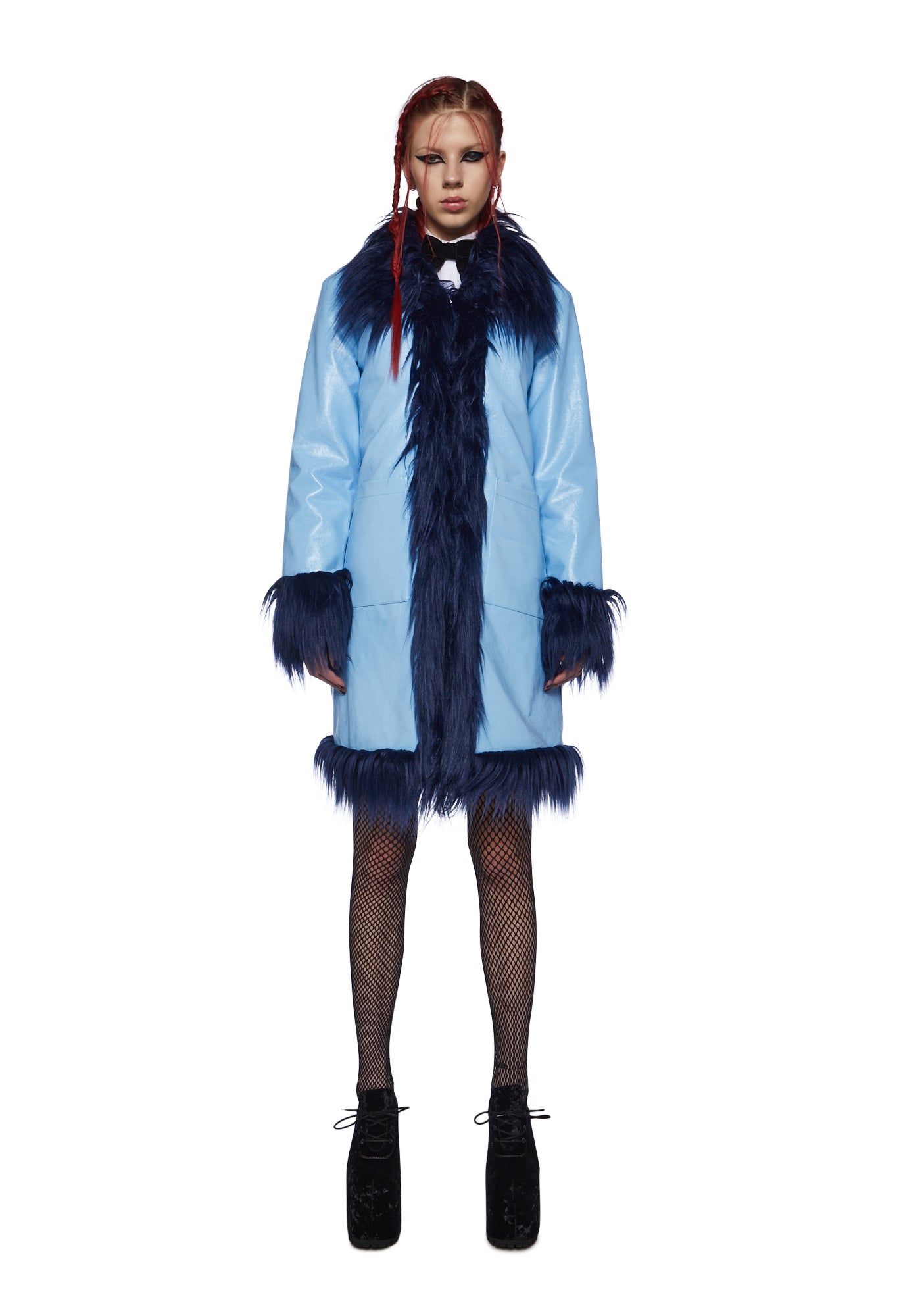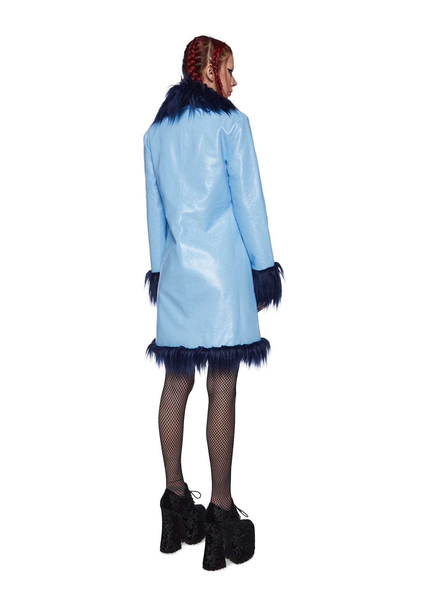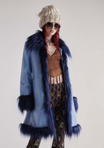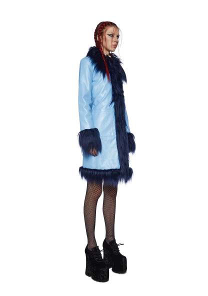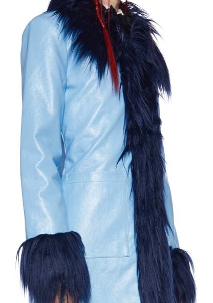 cuz you’re so artistic. This coat has a vegan leather construction, a glossy finish, a two-tone design, a faux fur trim, front pockets, and hook and eye front closure.