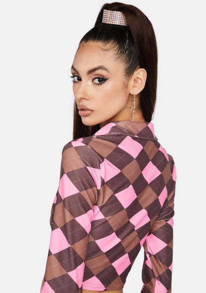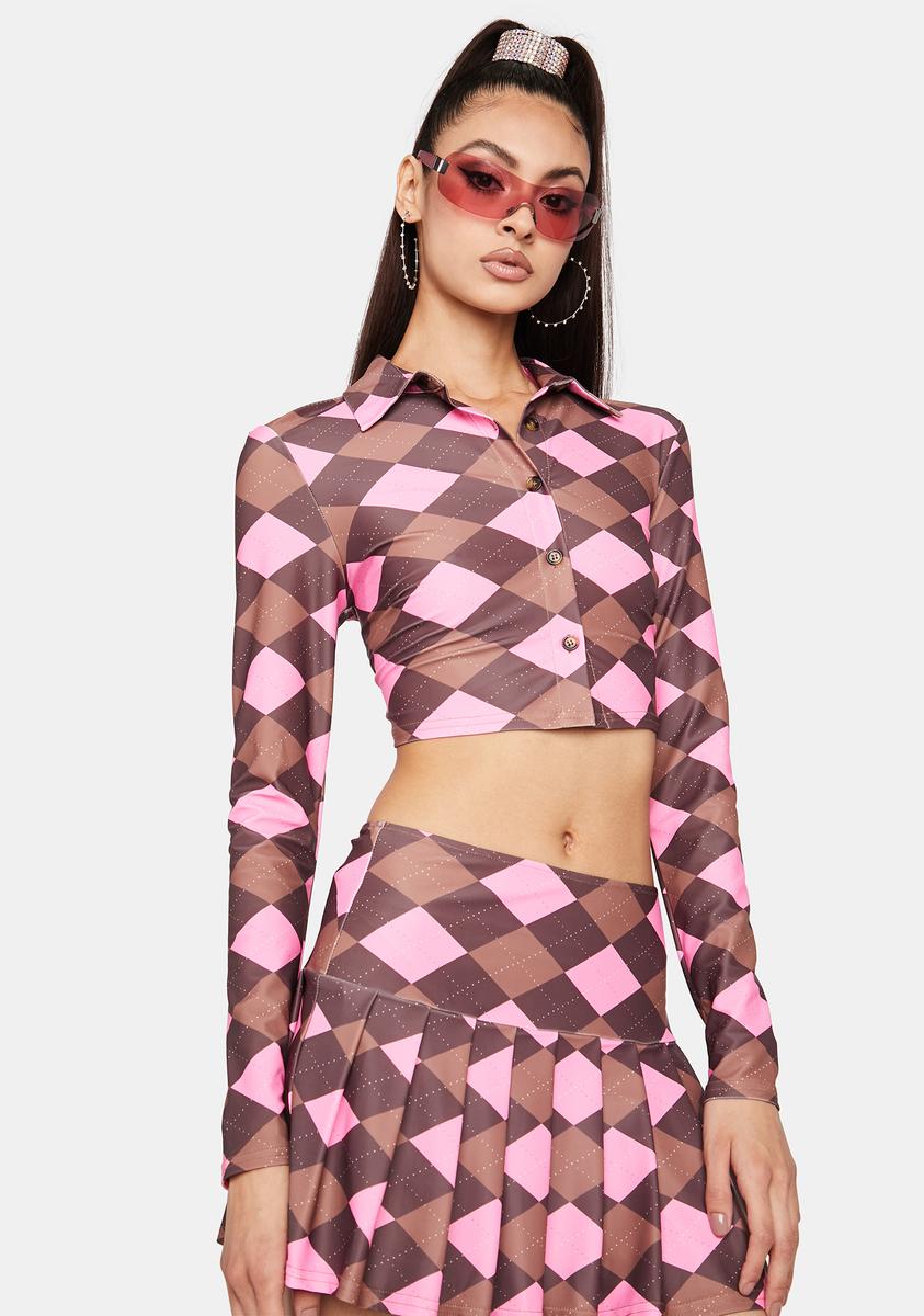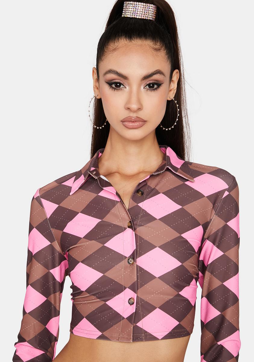 cuz you can't sit with us. This top has an all over argyle print, a collared neckline, long sleeves, a cropped fit, and a button down closure.