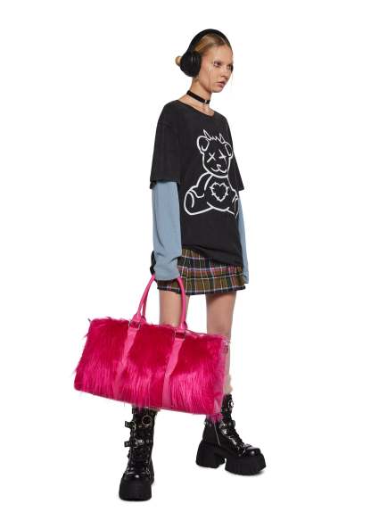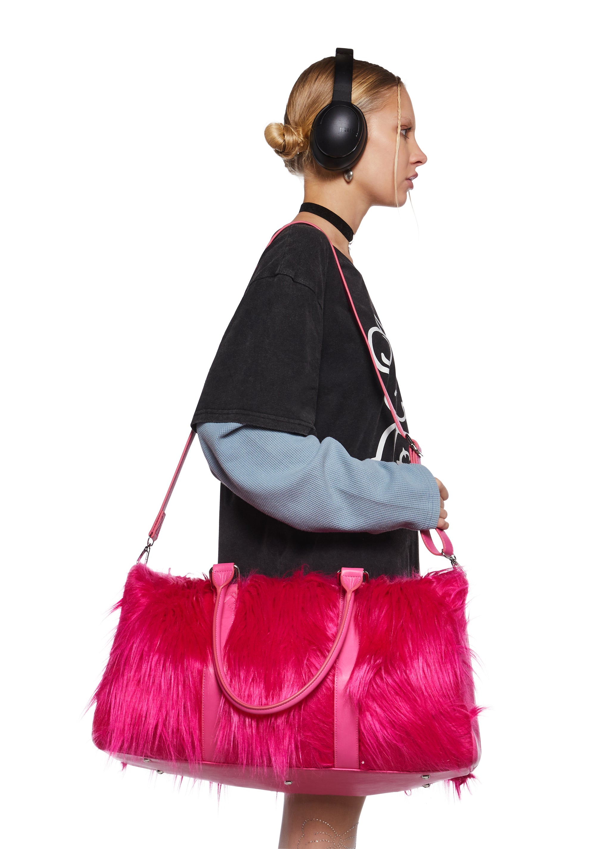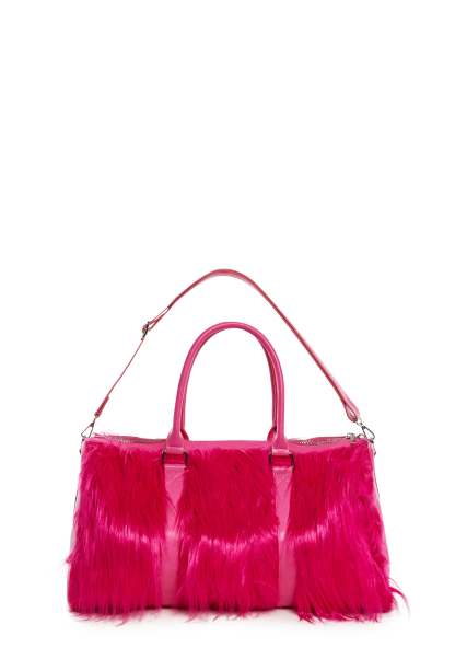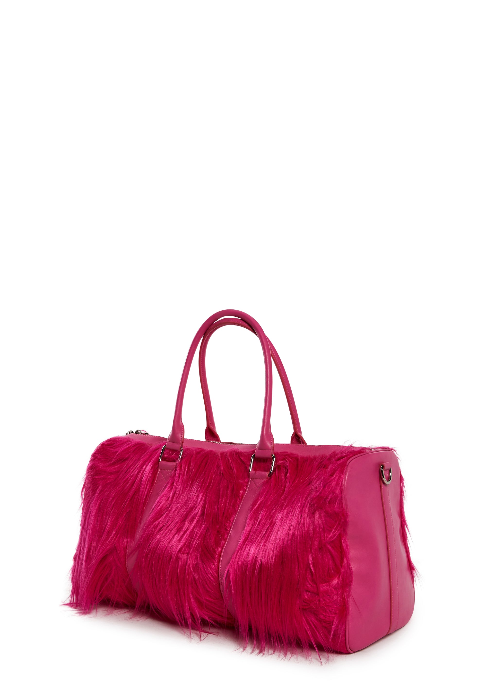 This weekender bag has a faux fur construction, a contrast vegan leather trim, a detachable adjustable shoulder strap, top handles, and a roomy interior with a top zip closure.