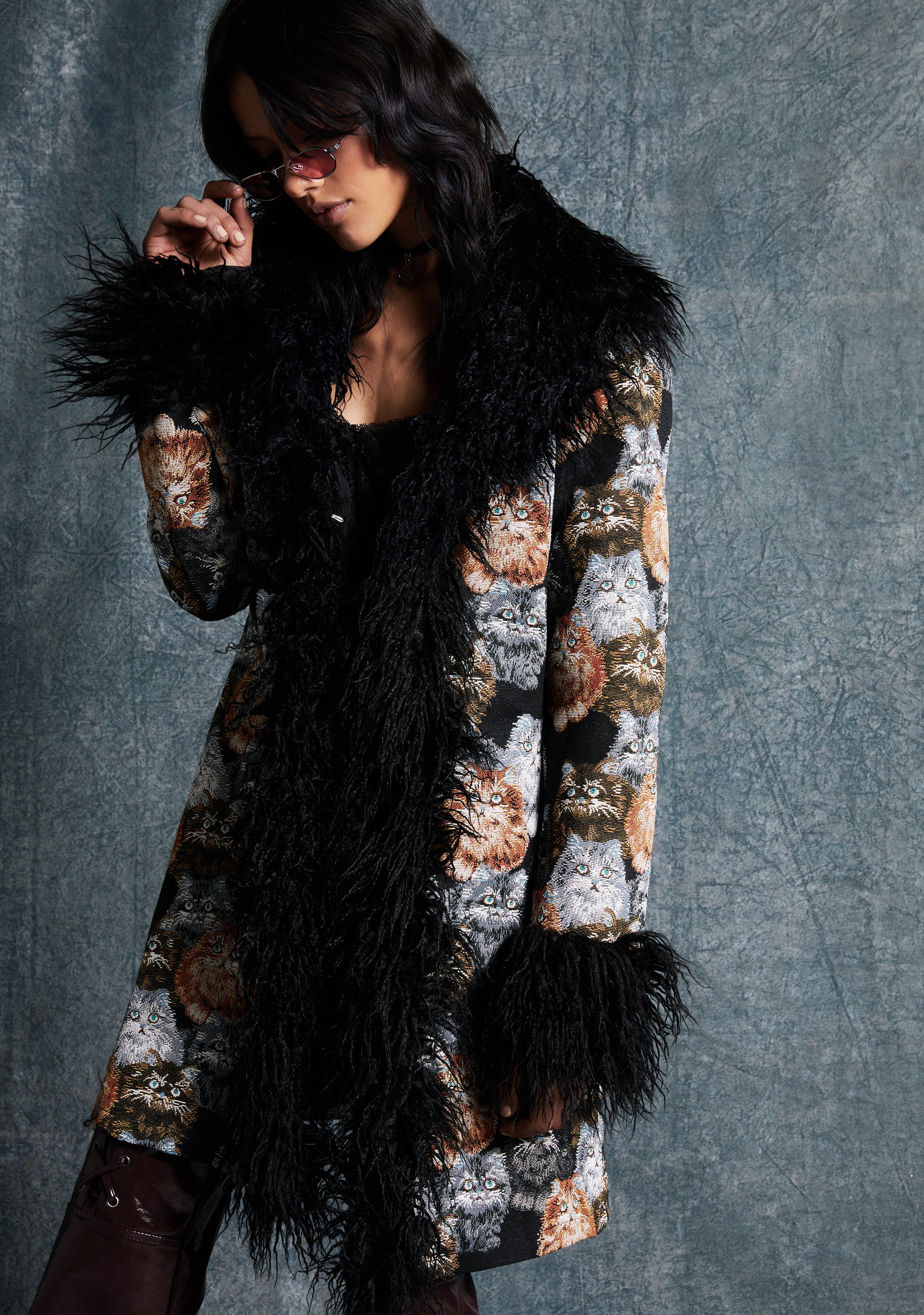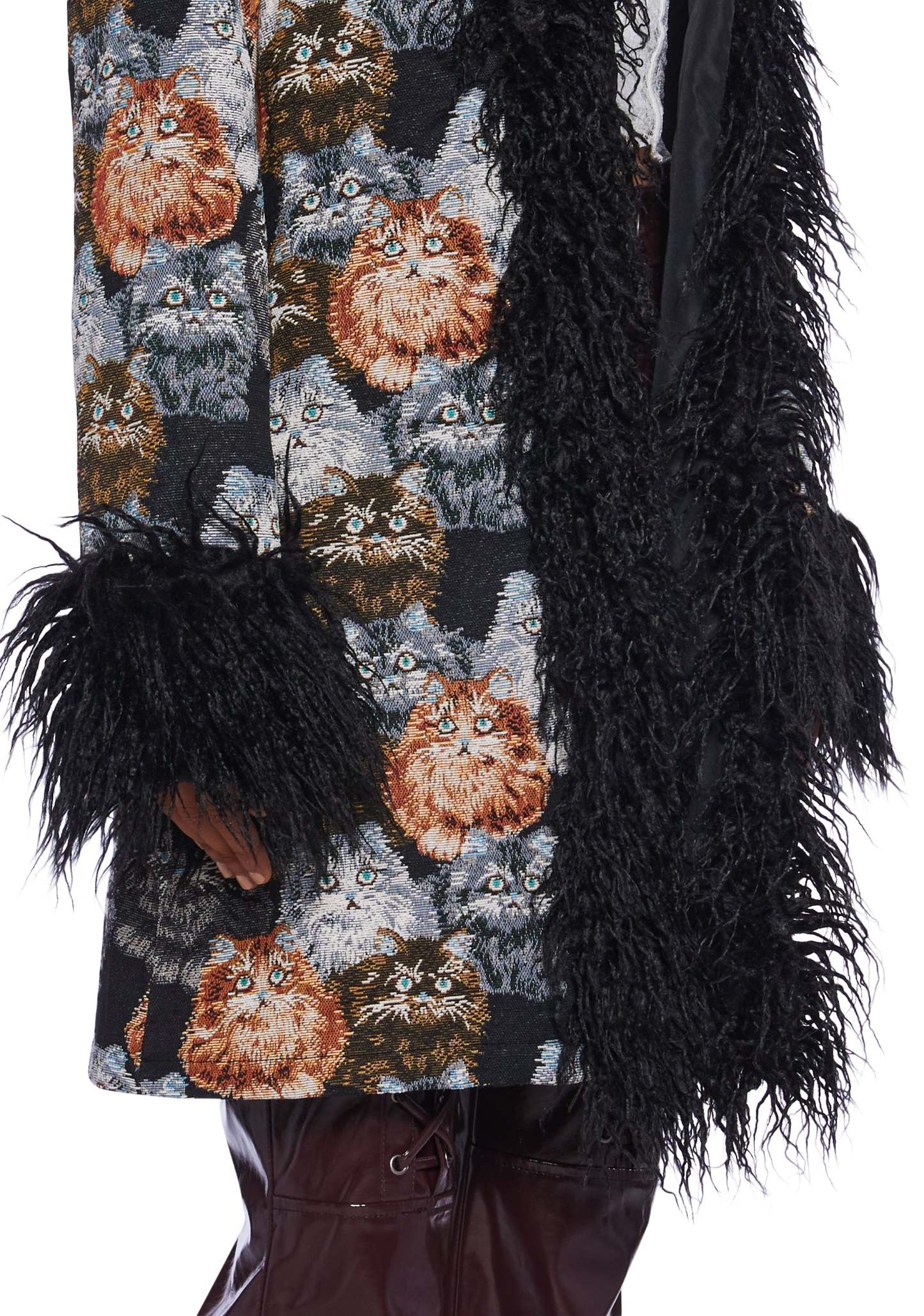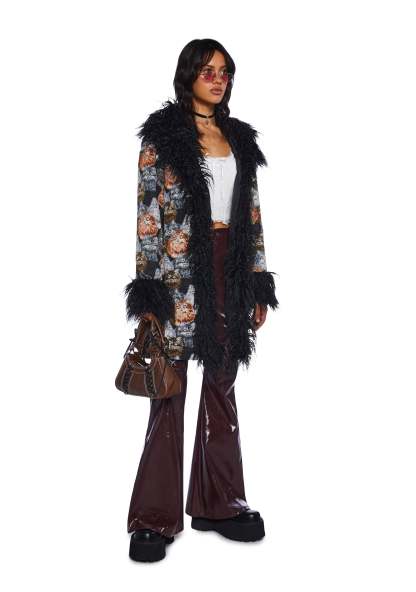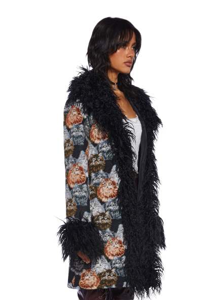 Aren’t cats the best? Show the world you love them and look purrfectly cute at the same time with this coat that has a tapestry fabric construction, an all over cat pattern, a long faux fur trim, long sleeves, side pockets, and a front hook closure.