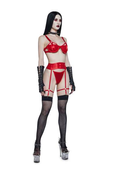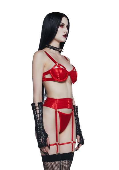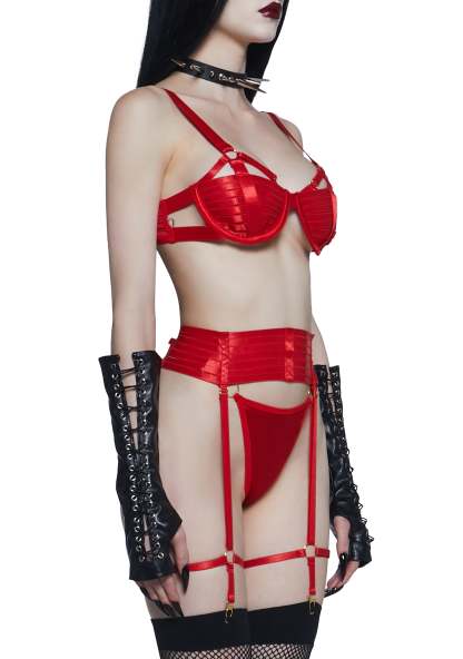 Your boudoir lover will be struck alive with this lingerie set that includes a bra top that has a satin construction, cut out detailing, an underwire bust, O-ring hardware, adjustable shoulder straps, a caged design, back hook and eye closures, and a matching thong and garter belt that comes with attached garters.
