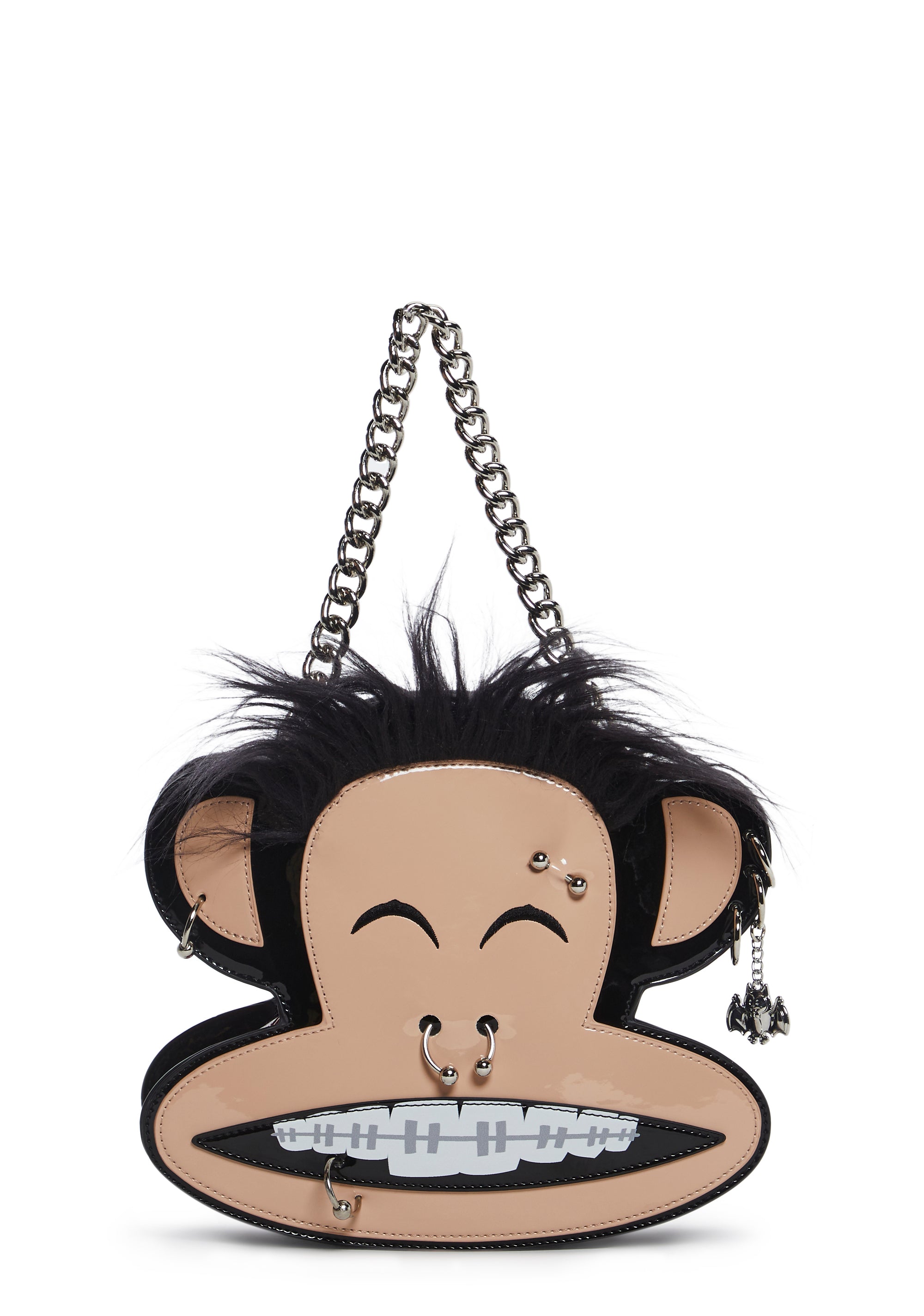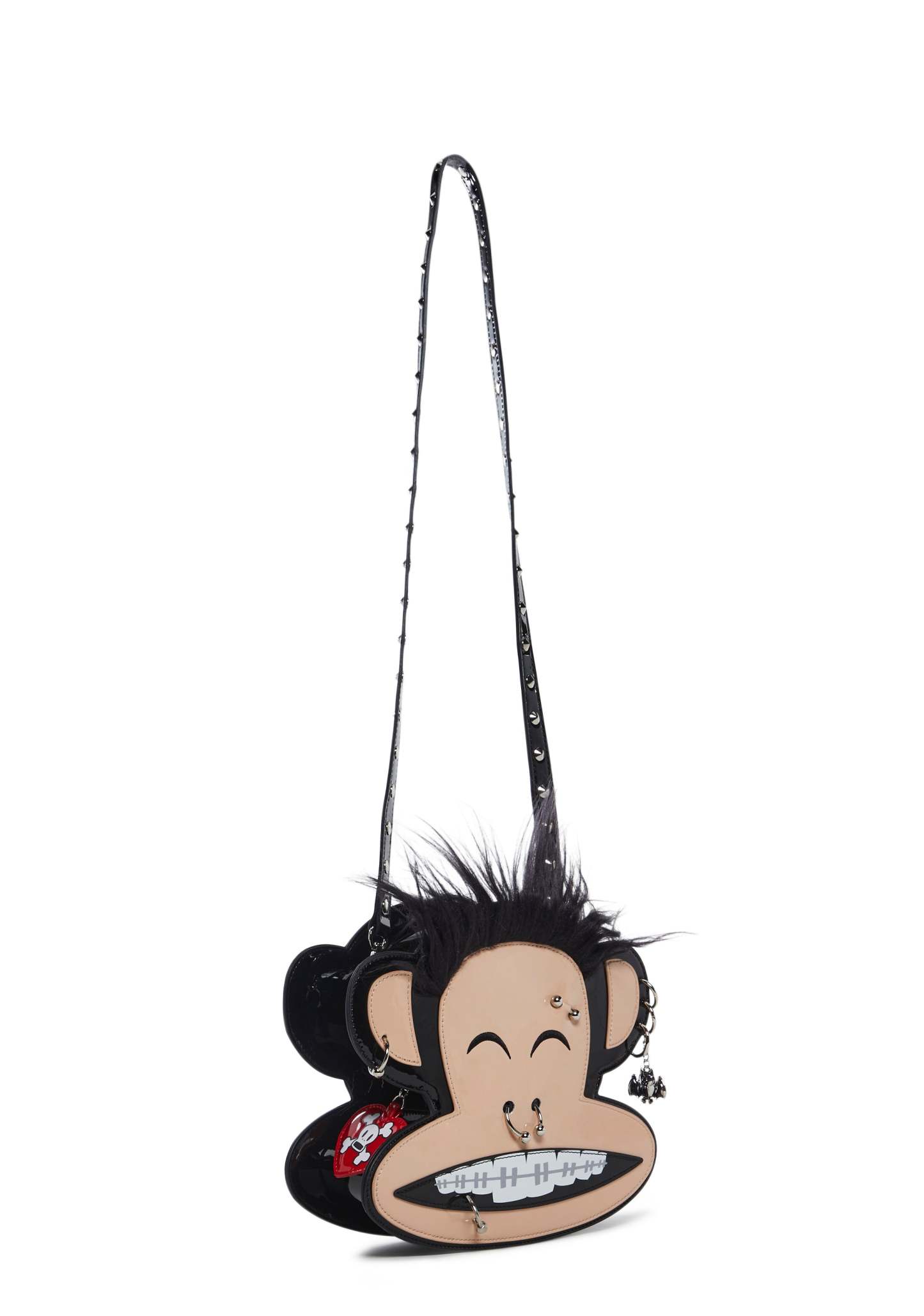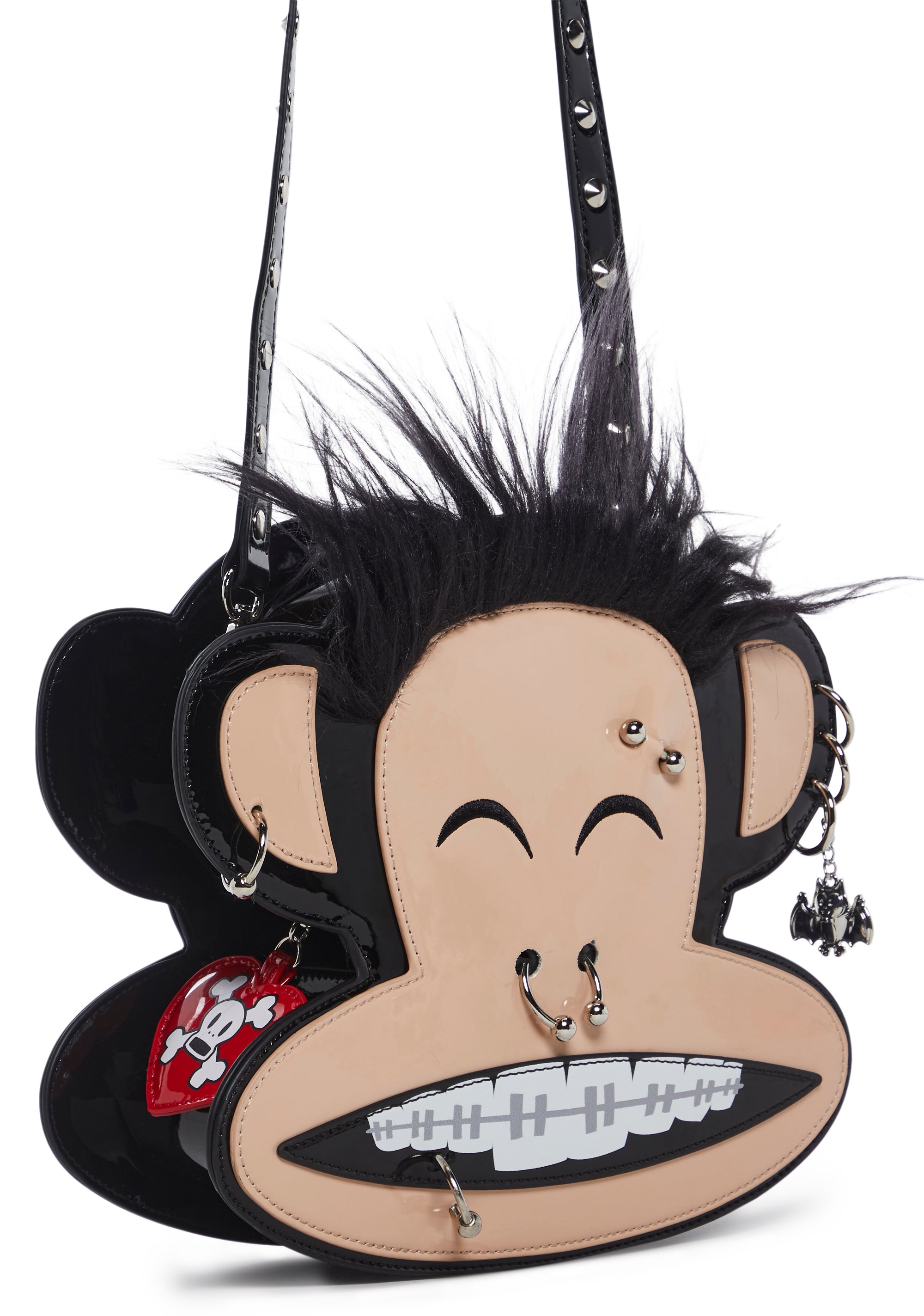 This Julius shaped bag has a patent vegan leather construction, embroidered face details, faux fur hair on top, pierced appliques, one ear has a metal bat charm, a checkered print lining, detachable chain link and studded top handles, and a top zipper closure with a vinyl heart shaped Skurvy skull graphic charm.