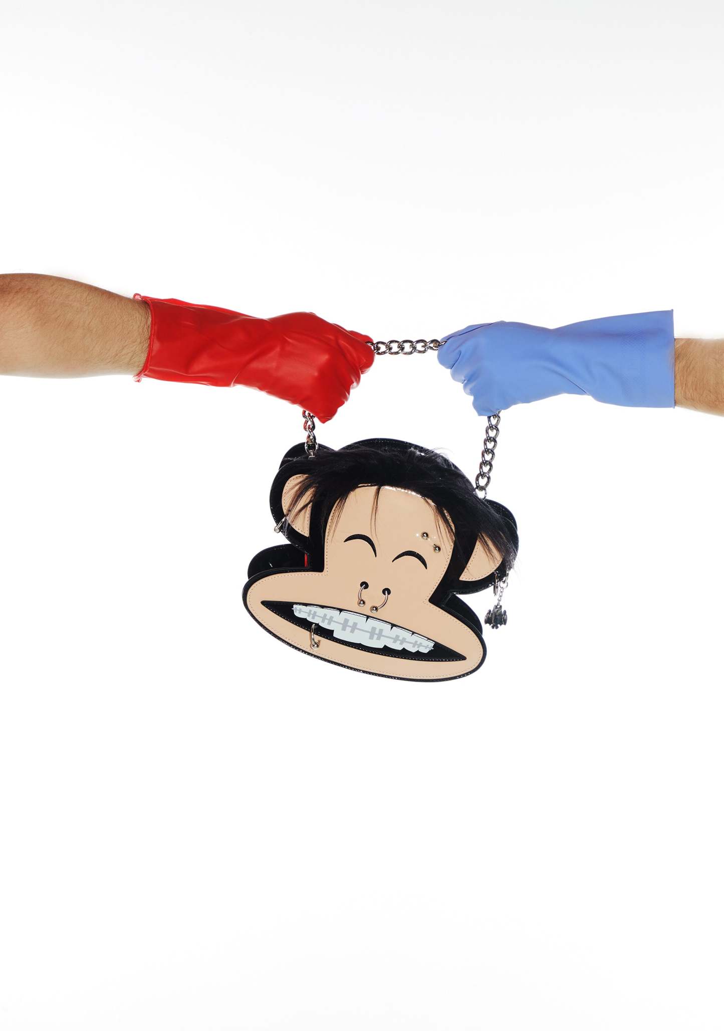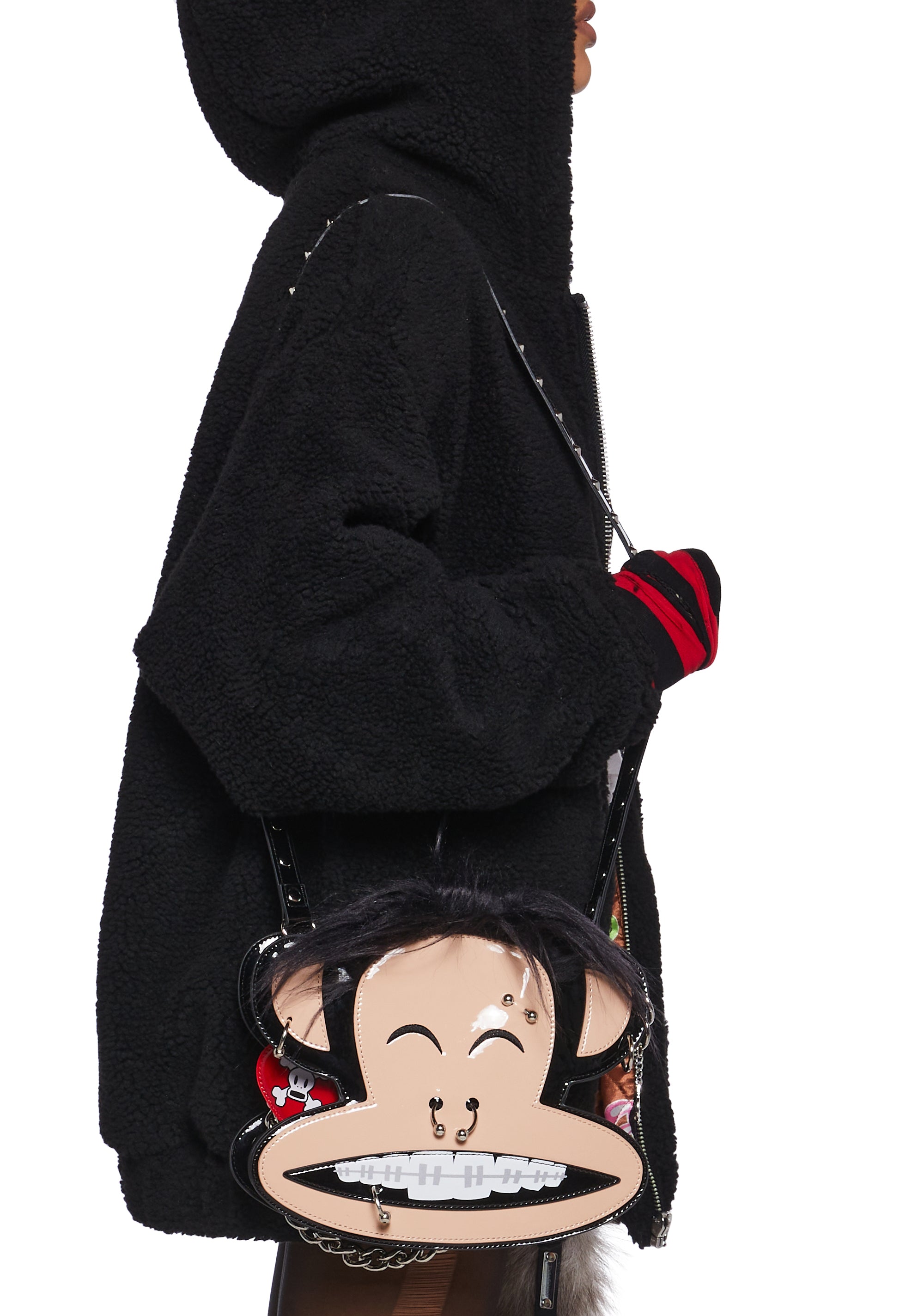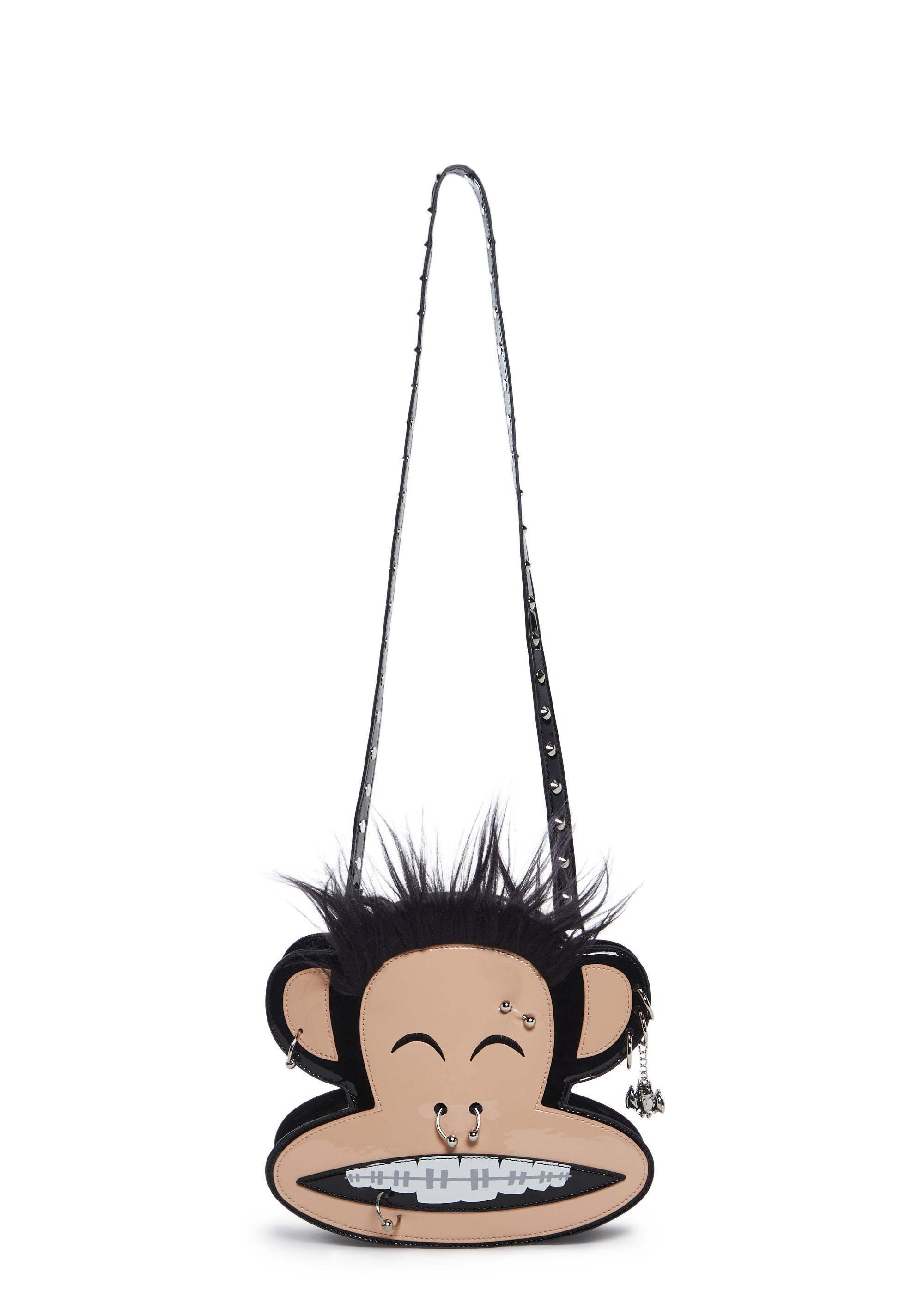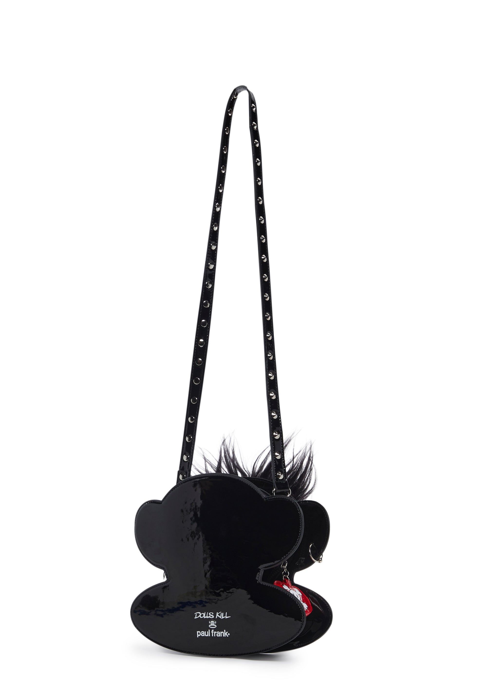 This Julius shaped bag has a patent vegan leather construction, embroidered face details, faux fur hair on top, pierced appliques, one ear has a metal bat charm, a checkered print lining, detachable chain link and studded top handles, and a top zipper closure with a vinyl heart shaped Skurvy skull graphic charm.