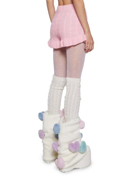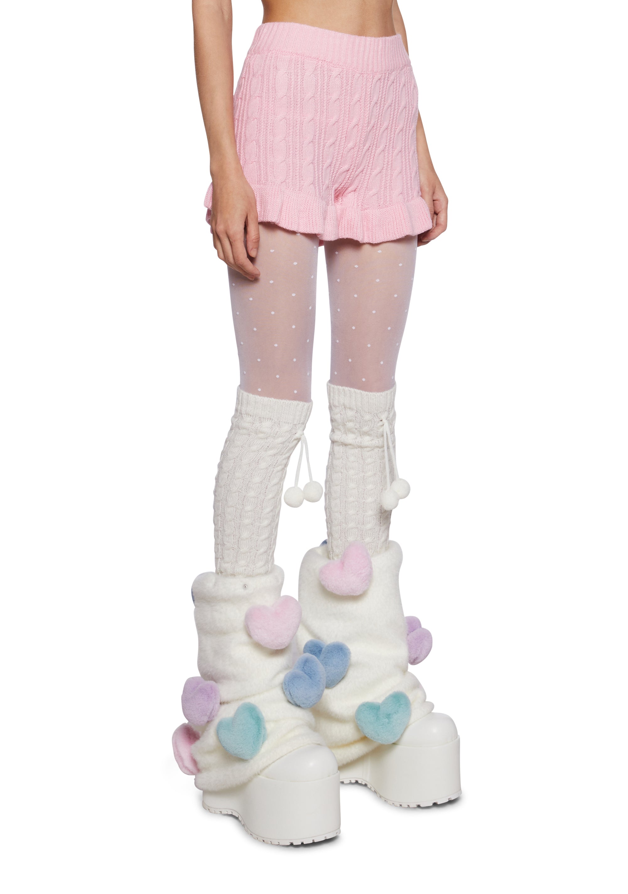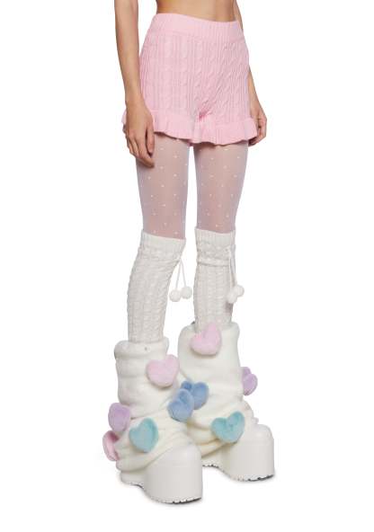 These shorts have an acrylic cable knit construction with a ruffled hem and an elastic waistband.