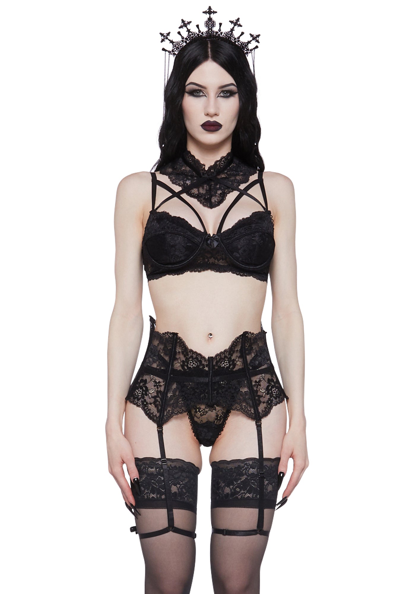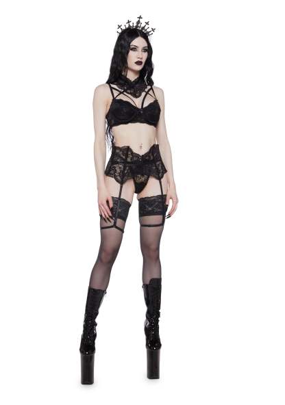 cuz unleash your true desires. This lingerie set has a lace construction, a strappy lace bra with hook and eye closures, a garter belt with structured boning, a choker with ribbon ties, and a matching panty.