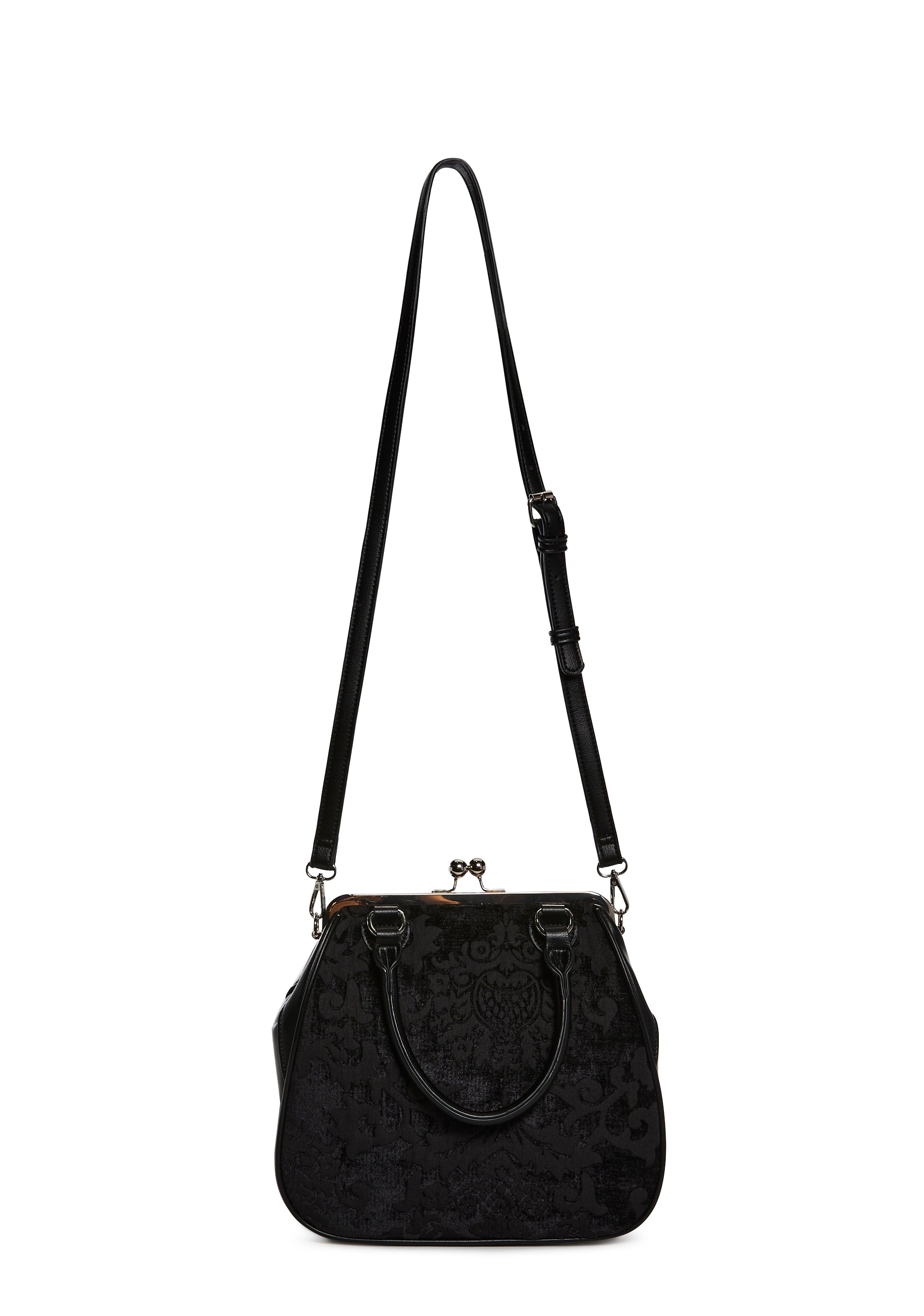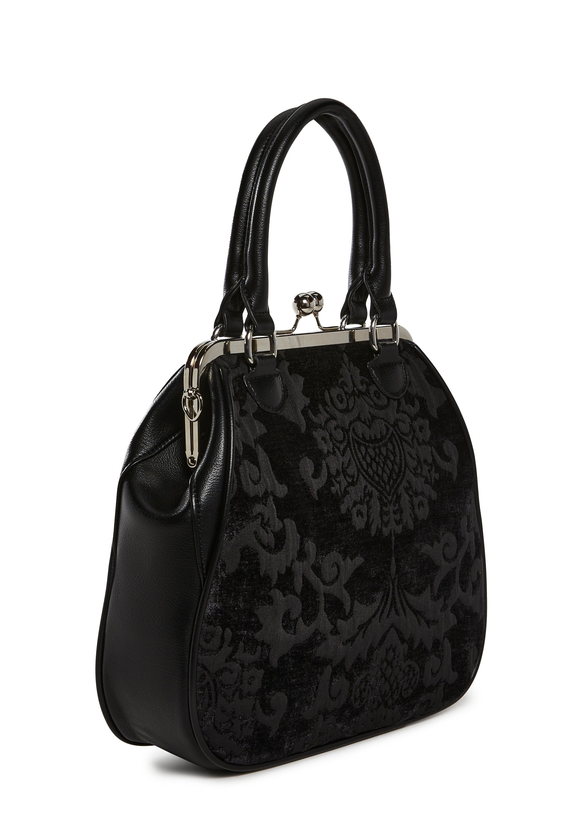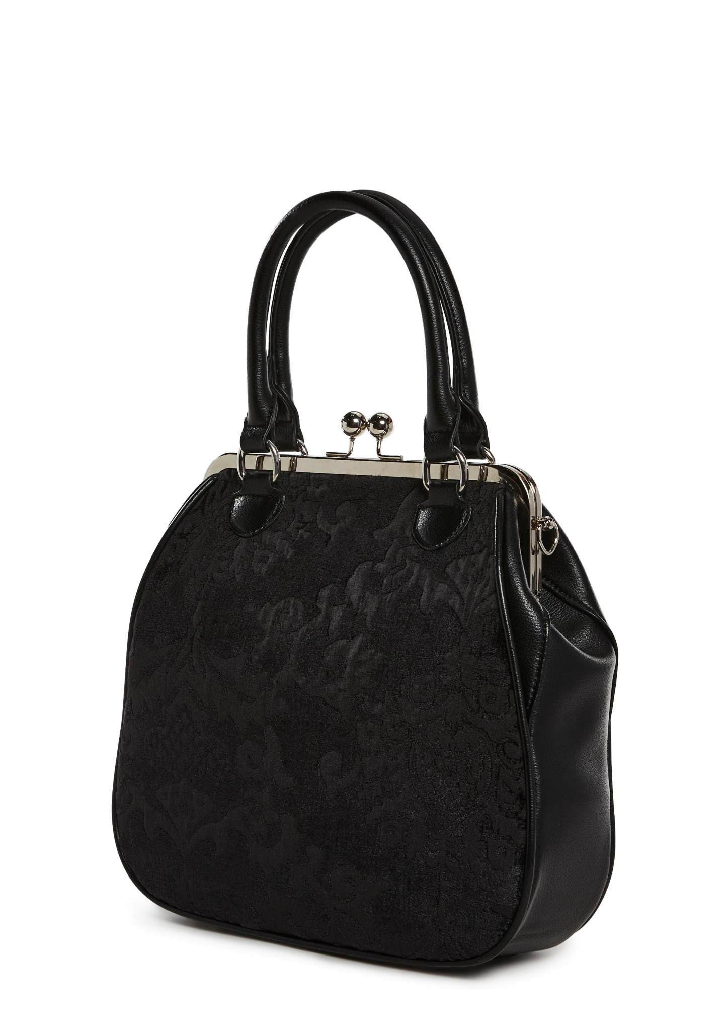 Looks can be deceiving with this bag that has a brocade construction, a vegan leather trim, a removable adjustable shoulder strap, top handles, and a kiss lock closure.