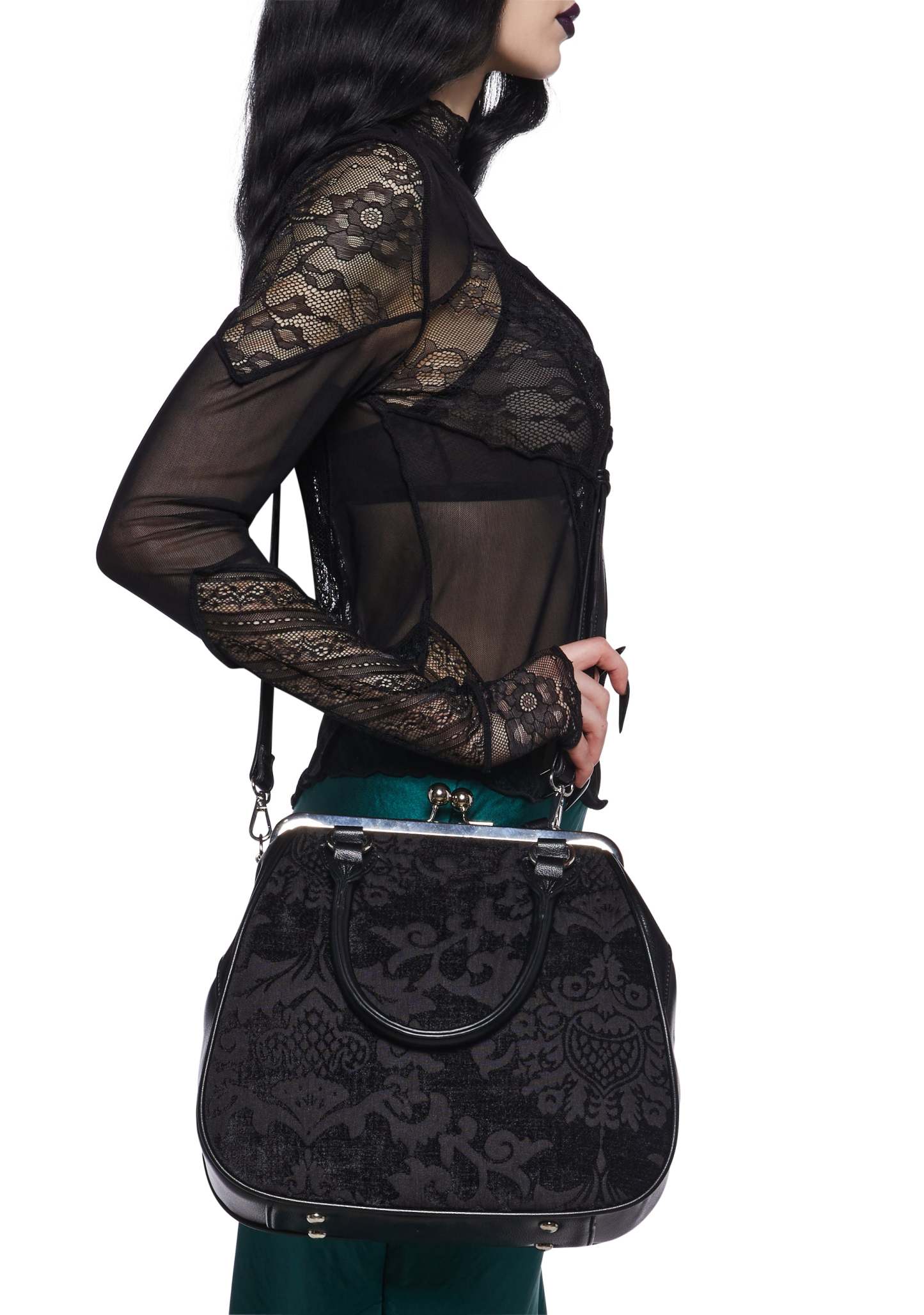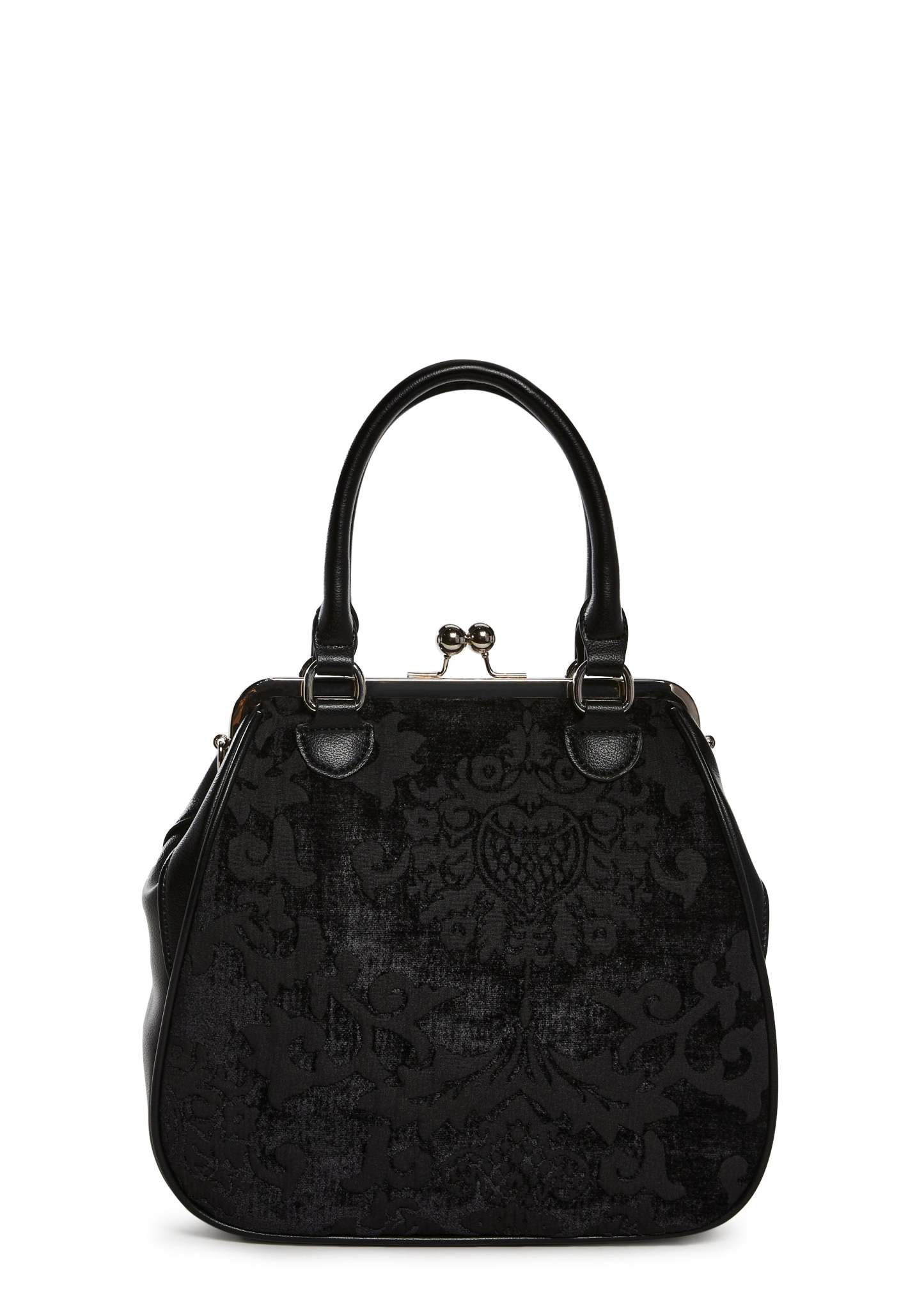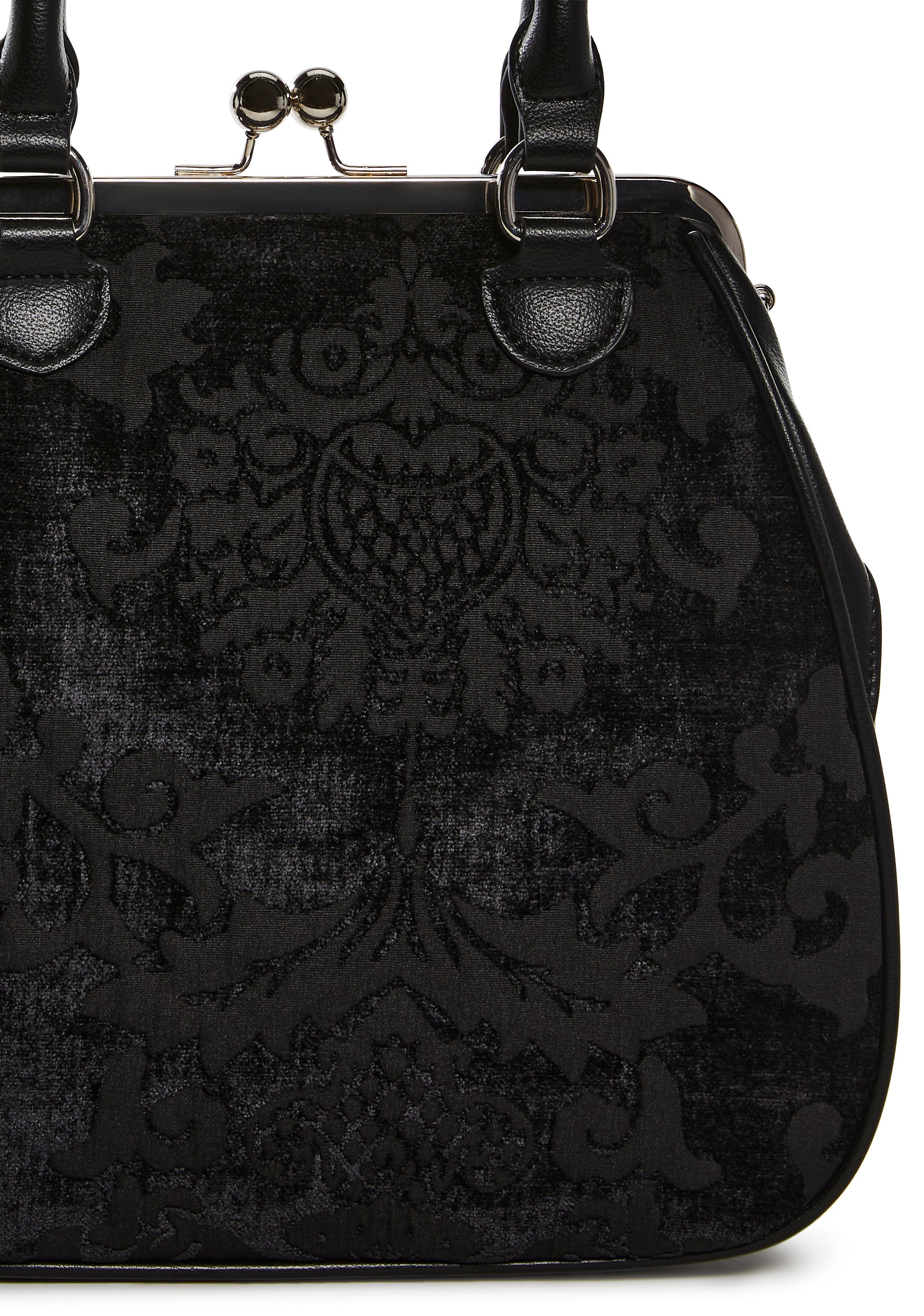 Looks can be deceiving with this bag that has a brocade construction, a vegan leather trim, a removable adjustable shoulder strap, top handles, and a kiss lock closure.