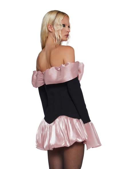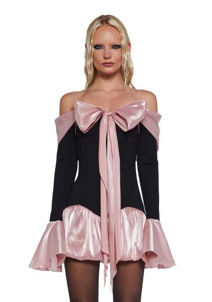 This mini dress has a stretchy knit construction with organza trim finished with a metallic sheen, a bubbled hem design, an off-the-shoulder neckline, draped detailing with a self-tie bow in front, long sleeves with bell cuffs, and a back hook and zipper closure.