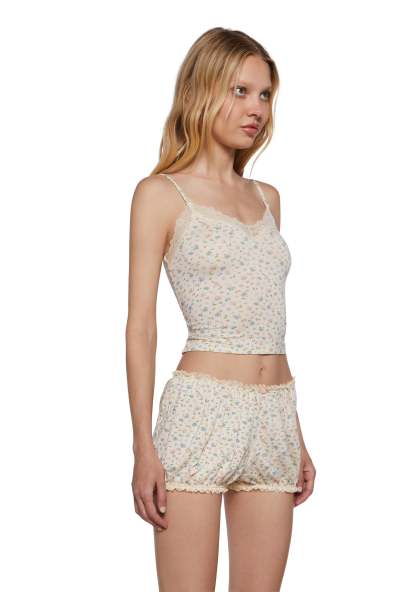 Greet the spring with this lingerie set that includes a cami top that has a stretchy ribbed construction, an all over floral print, a lace trim along the neckline, adjustable shoulder straps, and matching shorts with an elastic waistband and lace trim.