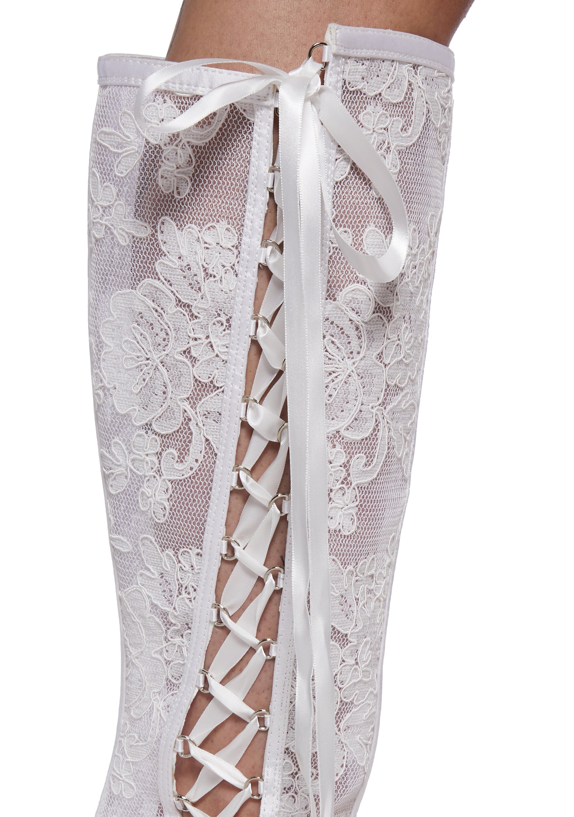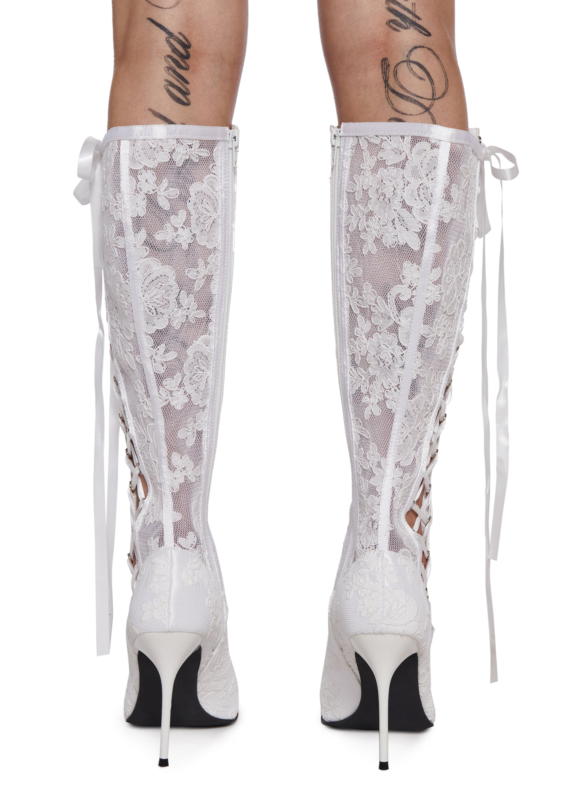 These boots have a sheer lace construction, ribbon lace-ups on the sides, a pointed toe design, stiletto heels, and side zipper closures.