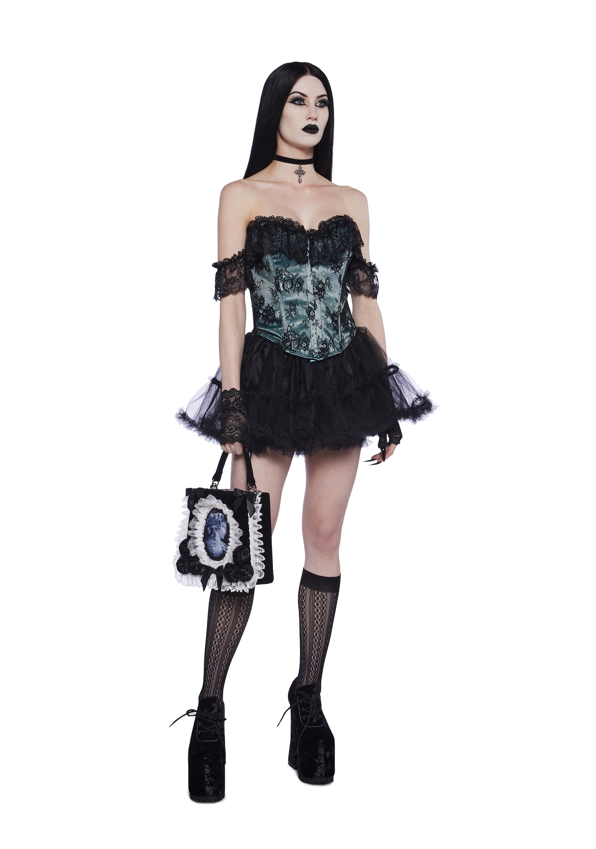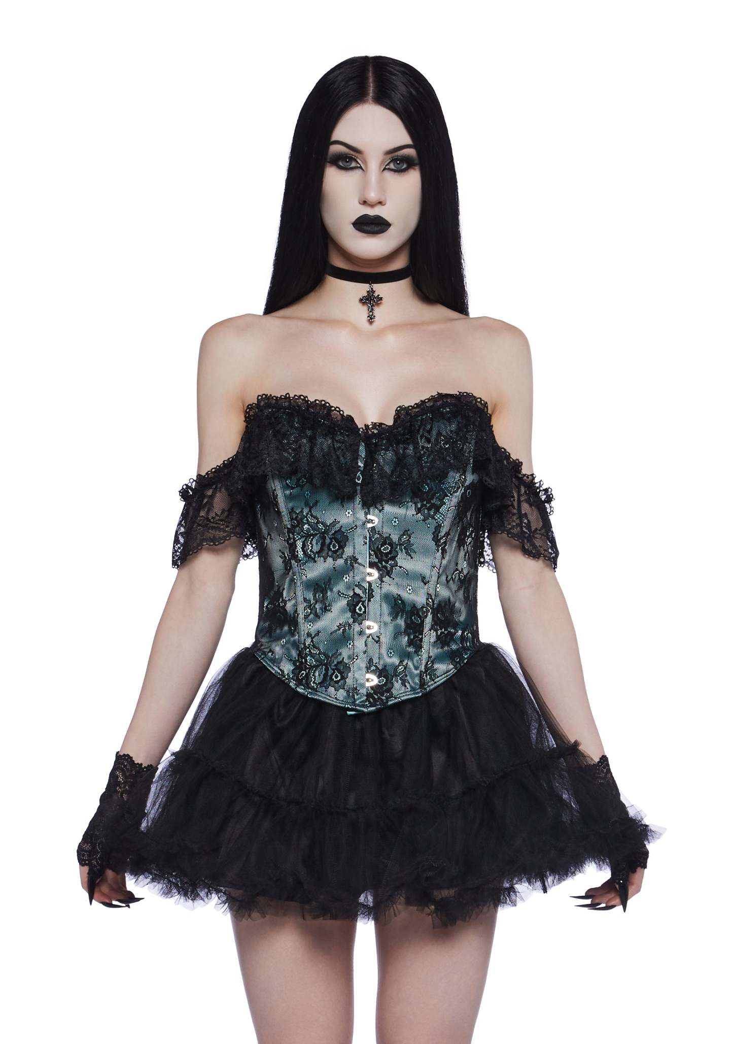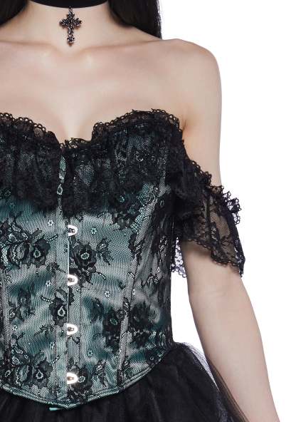 cuz beauty is what they see. This corset top has a satin construction with a lace overlay, structured boning, lace detailing, lace off-the-shoulder straps, front hook and eye closures, and a back lace-up closure with a self-tie ribbon.