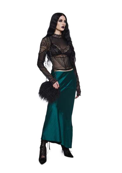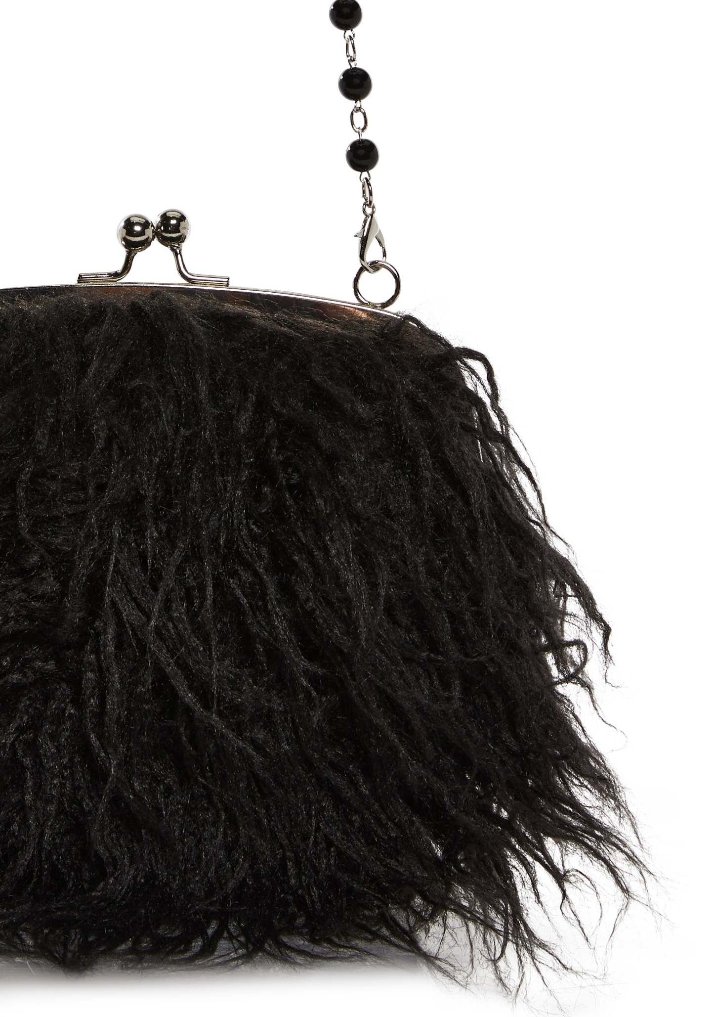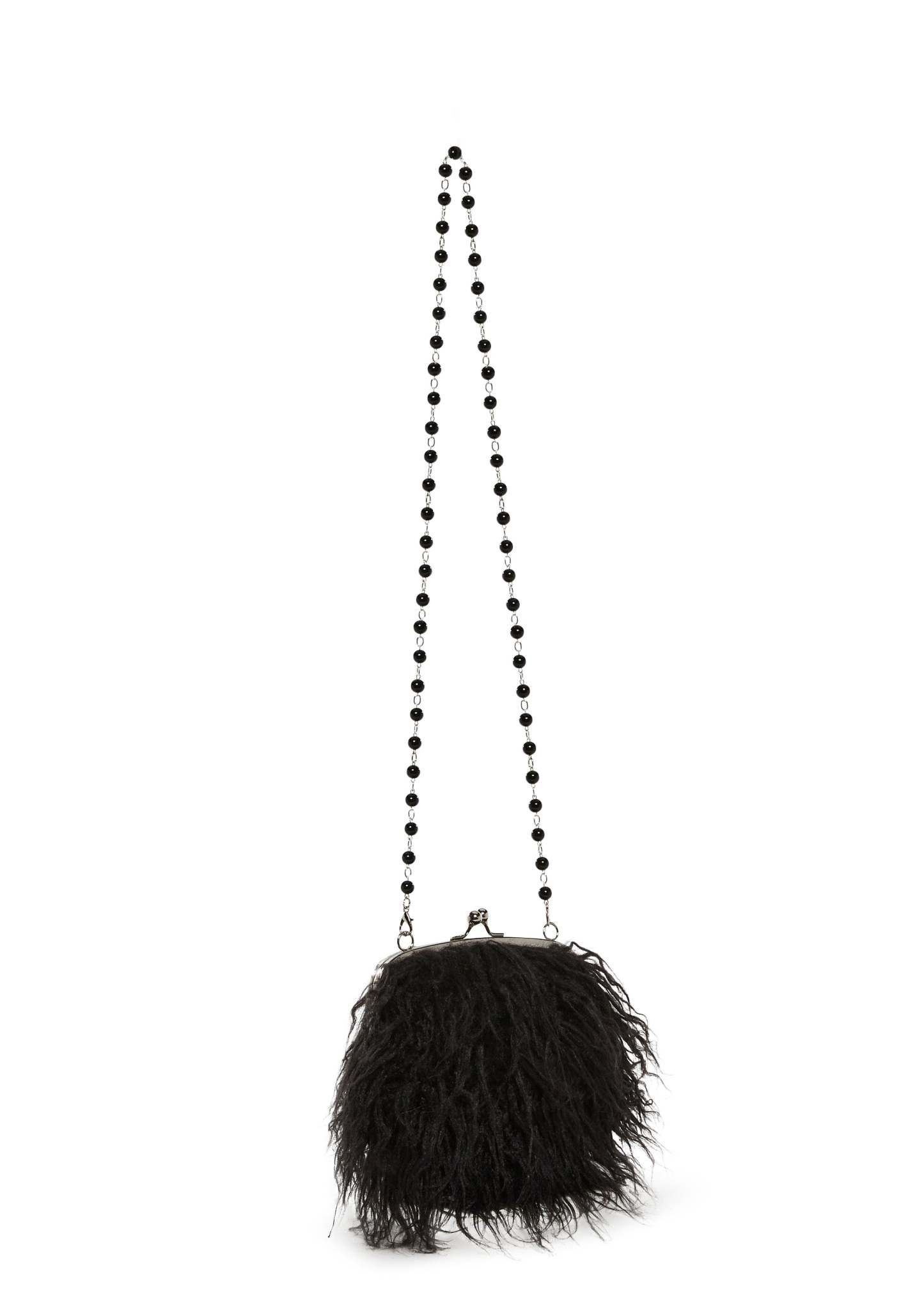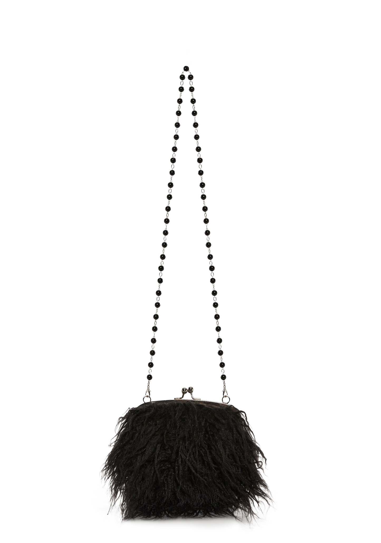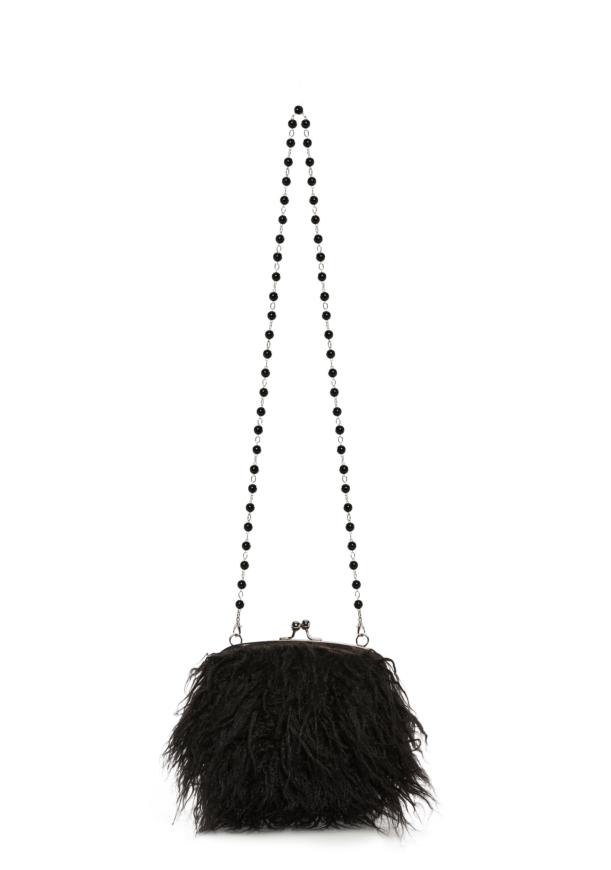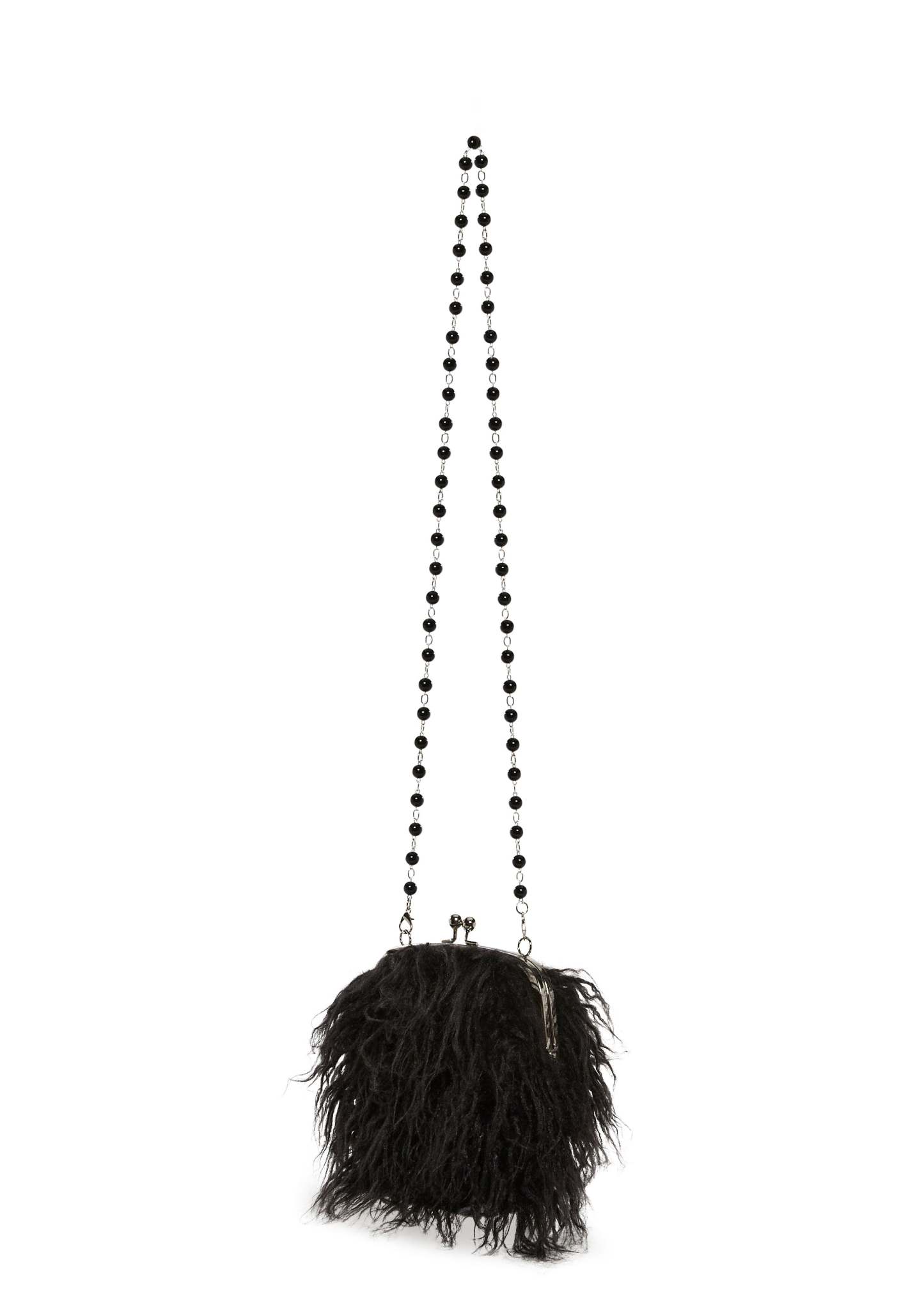 Look the part with this shoulder bag that has a long faux fur construction, a removable rosary bead shoulder strap, and a kiss lock closure.