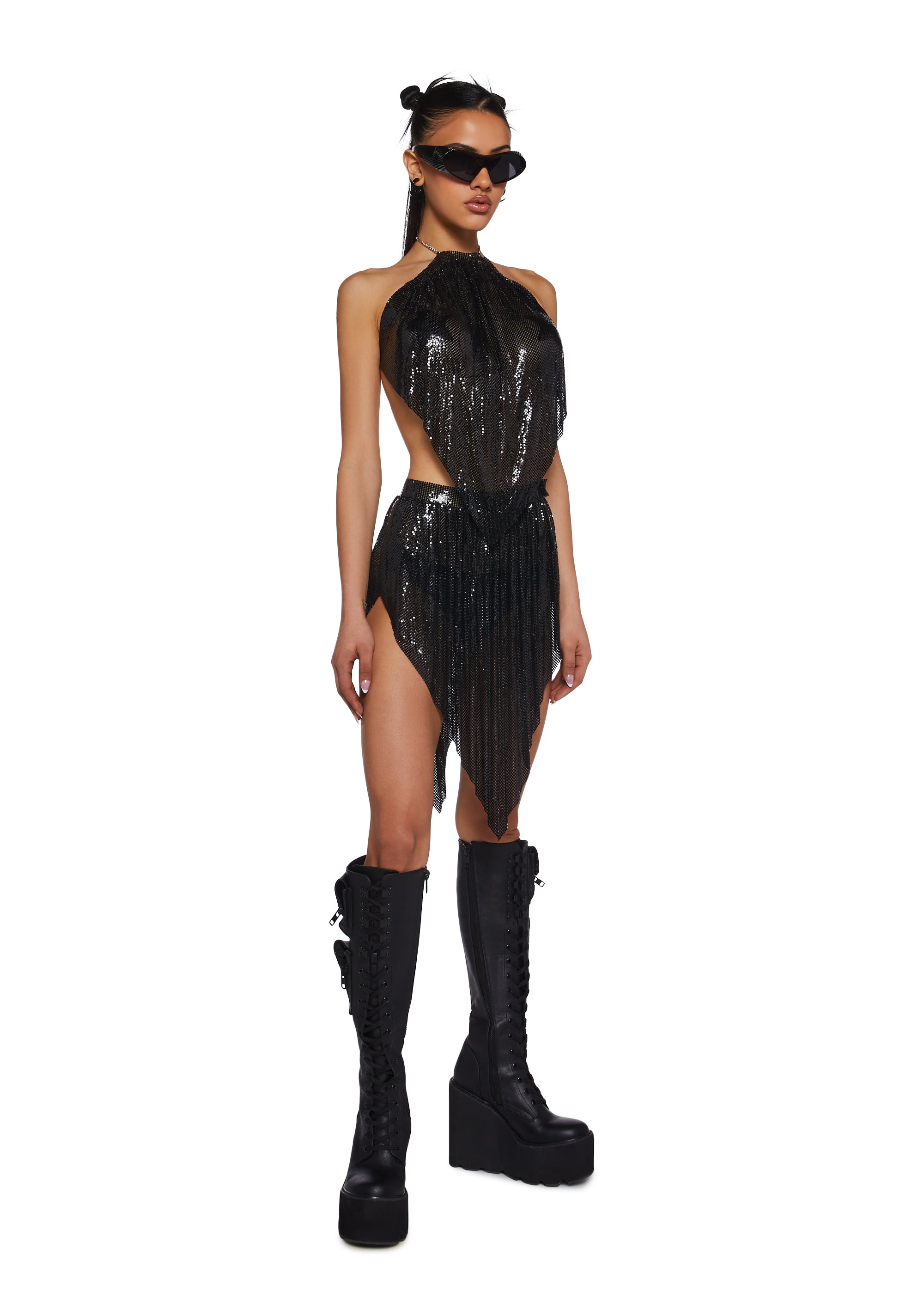 Welcome to the future with this mini skirt that has a sheer chainmail fabric construction, a handkerchief hem, and a snap button closure on the waistband.