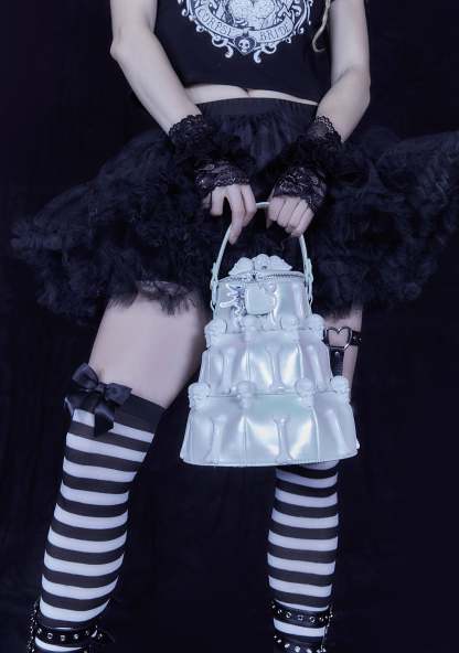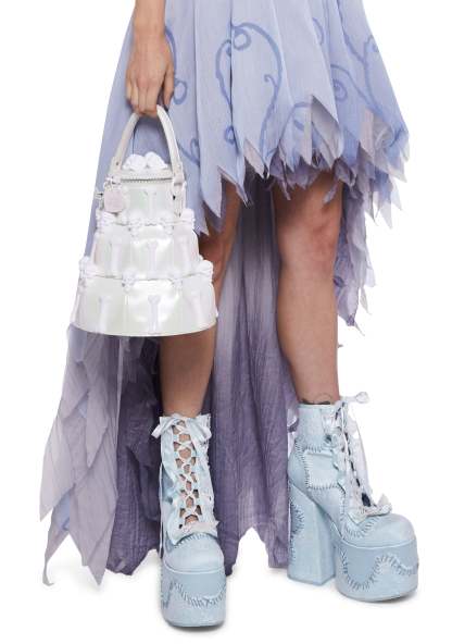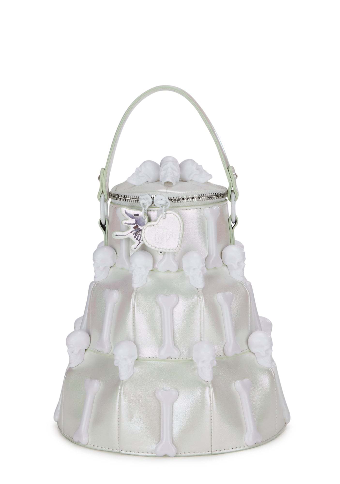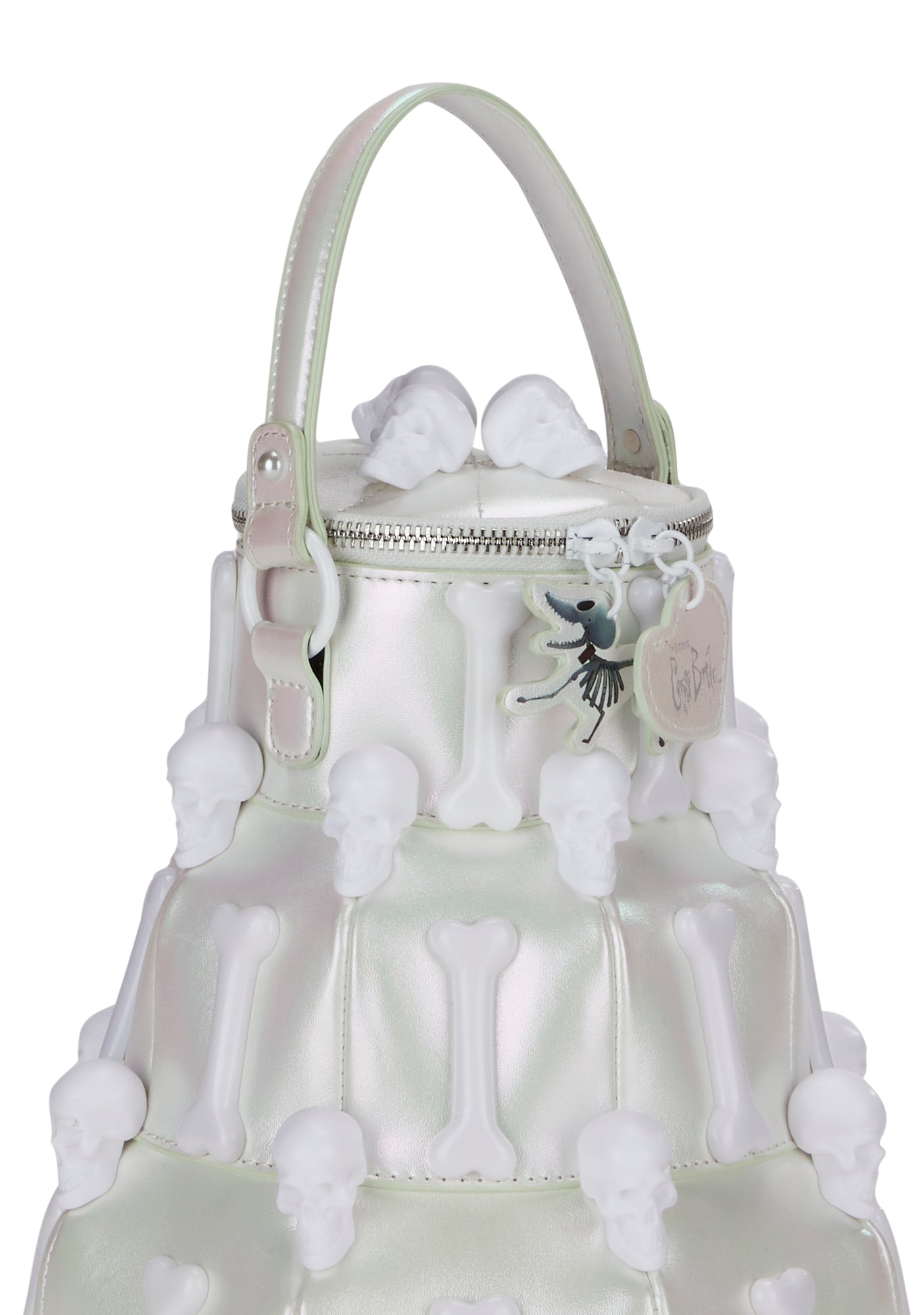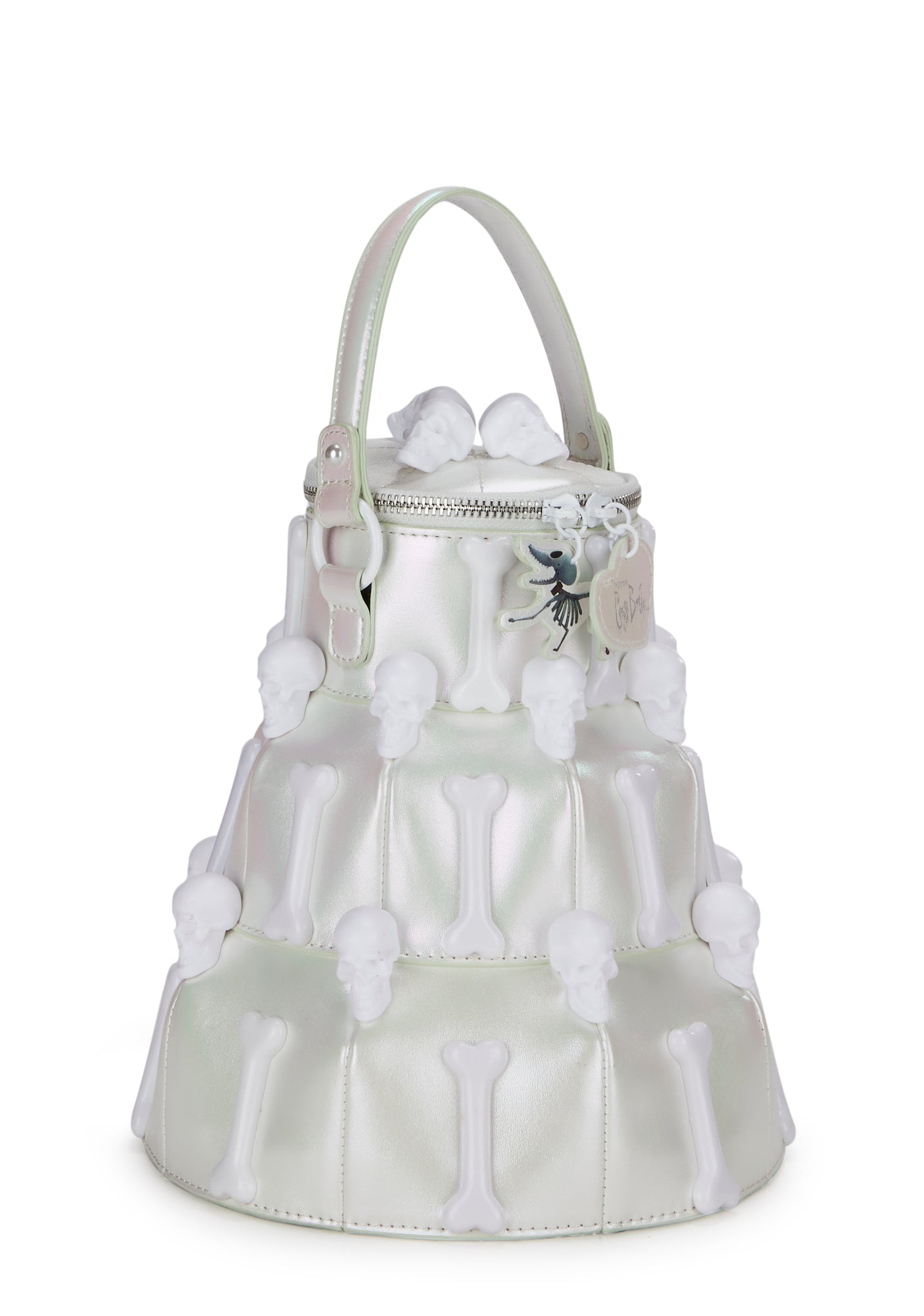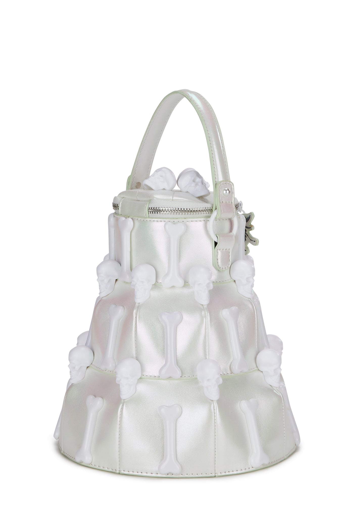 cuz have a slice. This wedding cake shaped bag has a vegan leather iridescent construction, skull and bone appliques, a top handle, and double zipper closures with keychains of a heart and Scraps the dog.