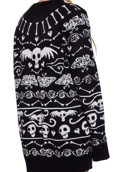 cuz rise from the dead or not. This sweater has a knit construction, an intarsia graphic design, a crew neckline, long sleeves, and an oversized fit.