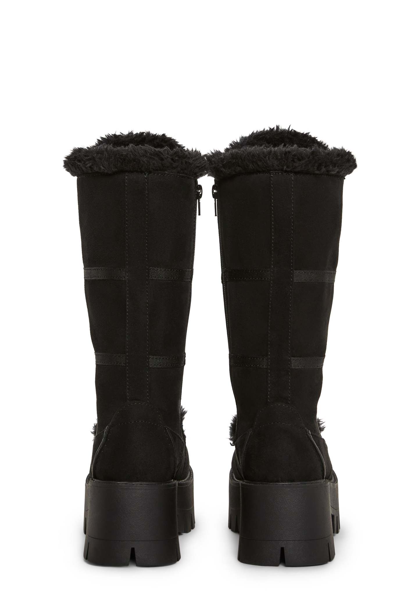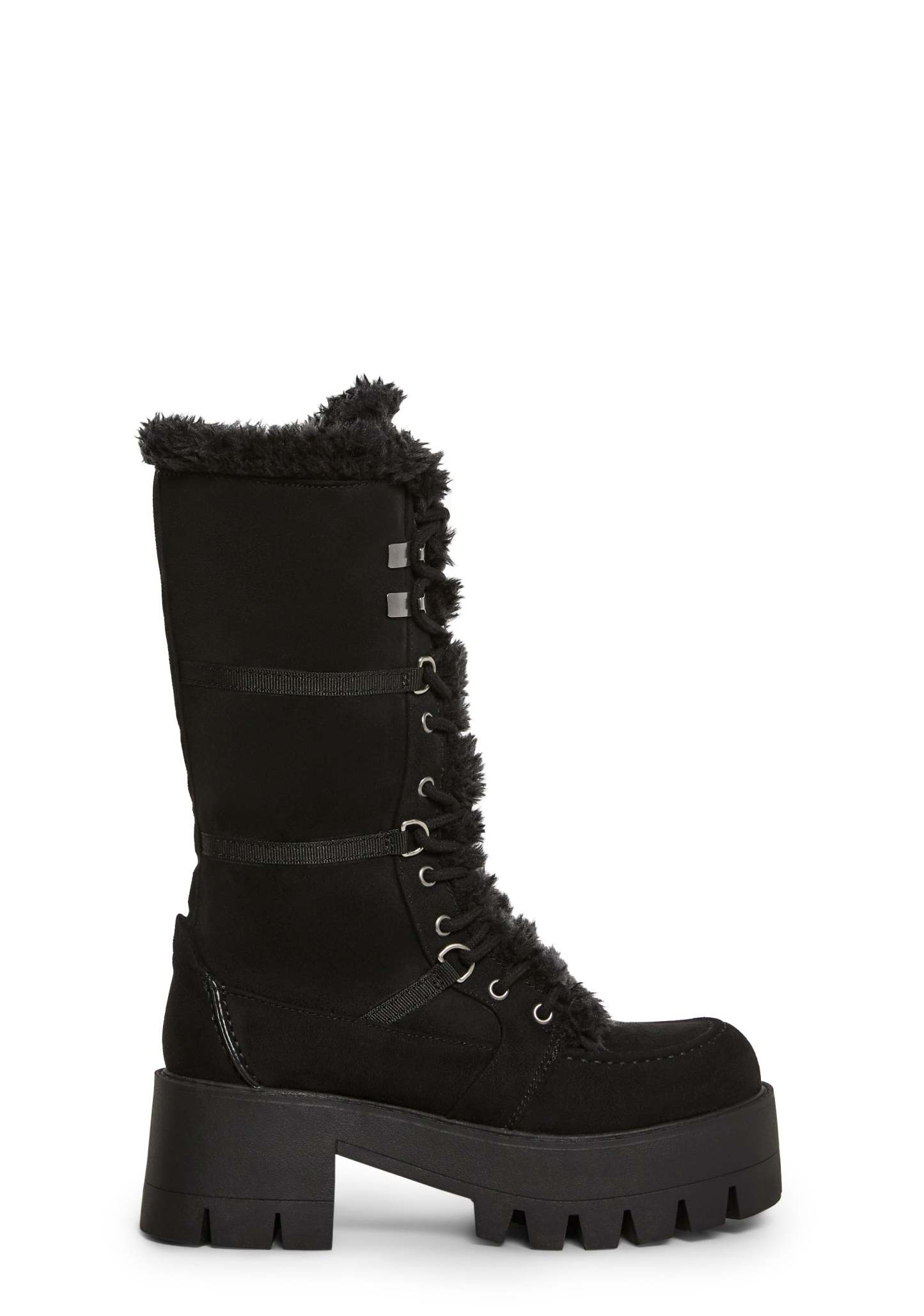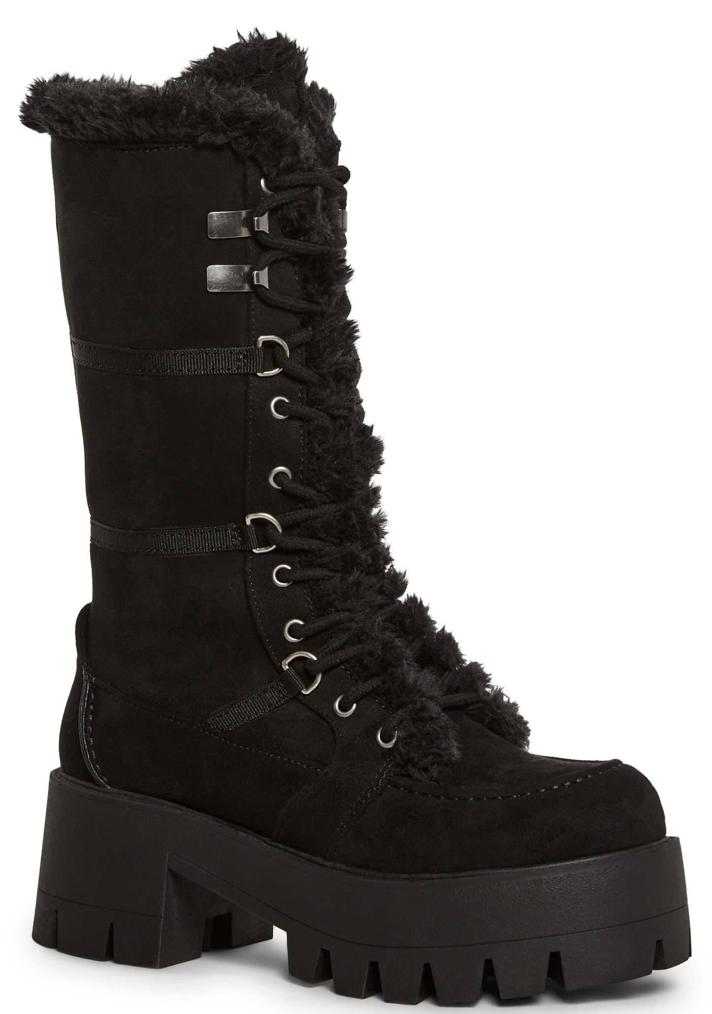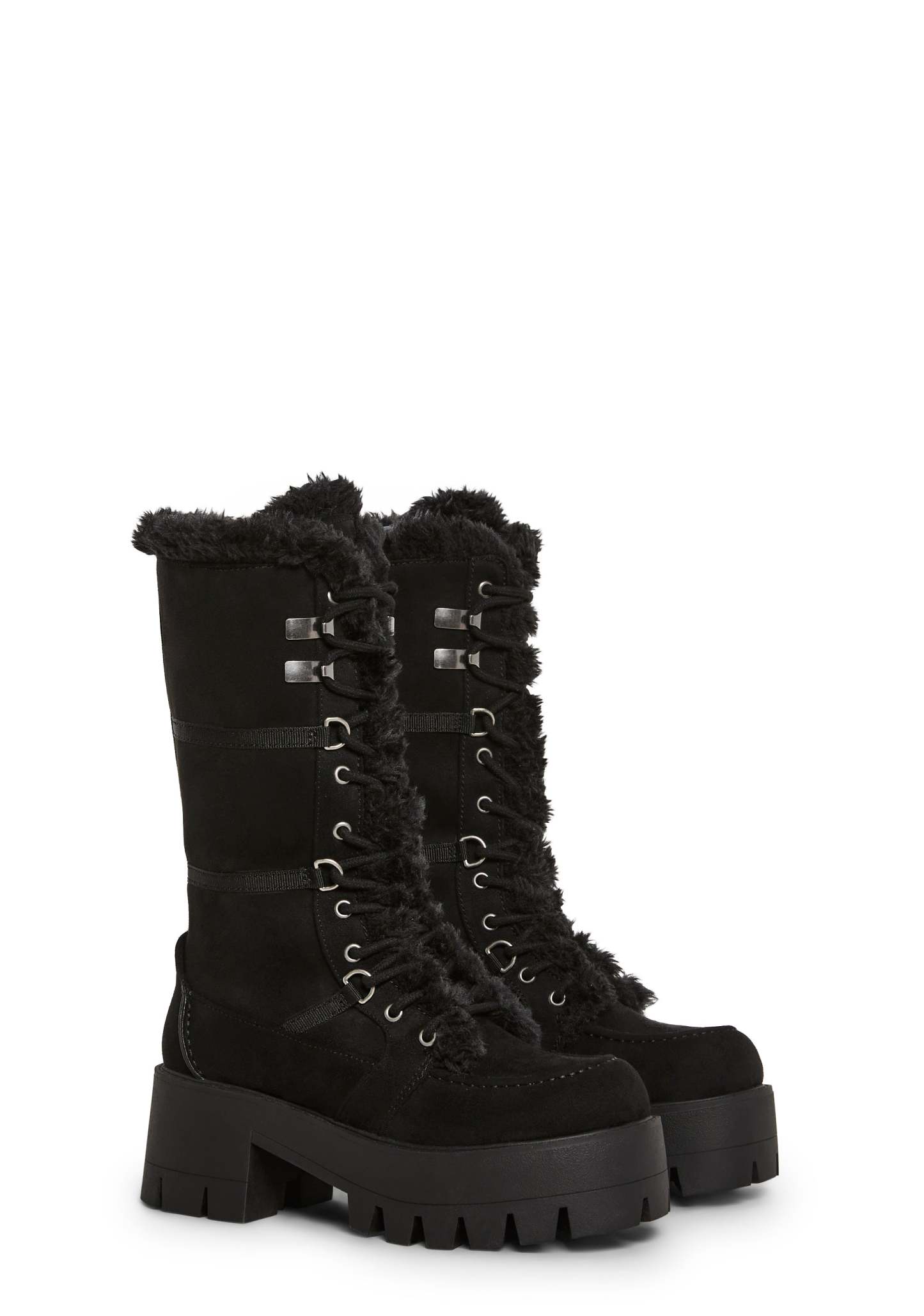 Think about that mysterious guy while hiking wearing these boots that have a faux suede construction, a faux fur trim, treaded soles, D-ring hardware, front-lace ups, and a side zipper closure.