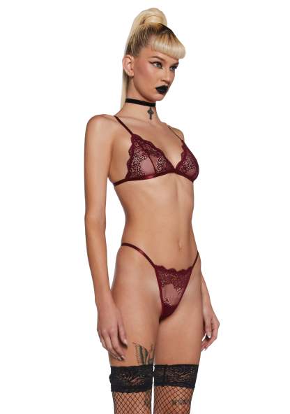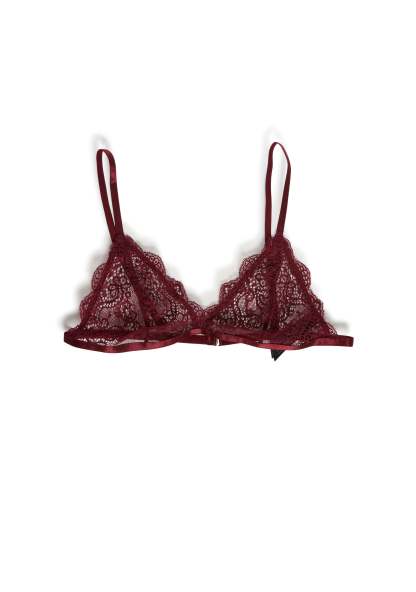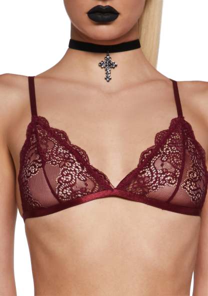 This bra top has a sheer lace construction, a scallop trim, adjustable shoulder straps, and back hook closures.