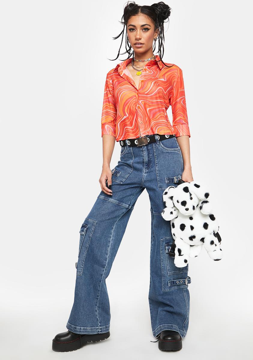 cuz you live life to the fullest. This shirt has an abstract print all over, a collared neckline, mid sleeves, and a button up closure.