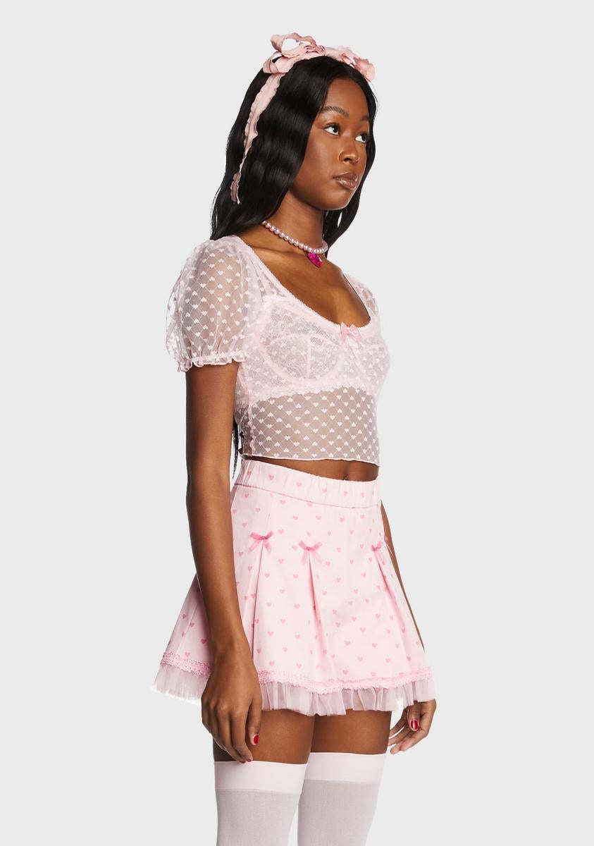 handle with care. This top comes in a sheer mesh construction, with short puff sleeves, a scoop neckline, satin bow detail, and a heart print all over.