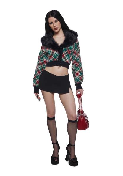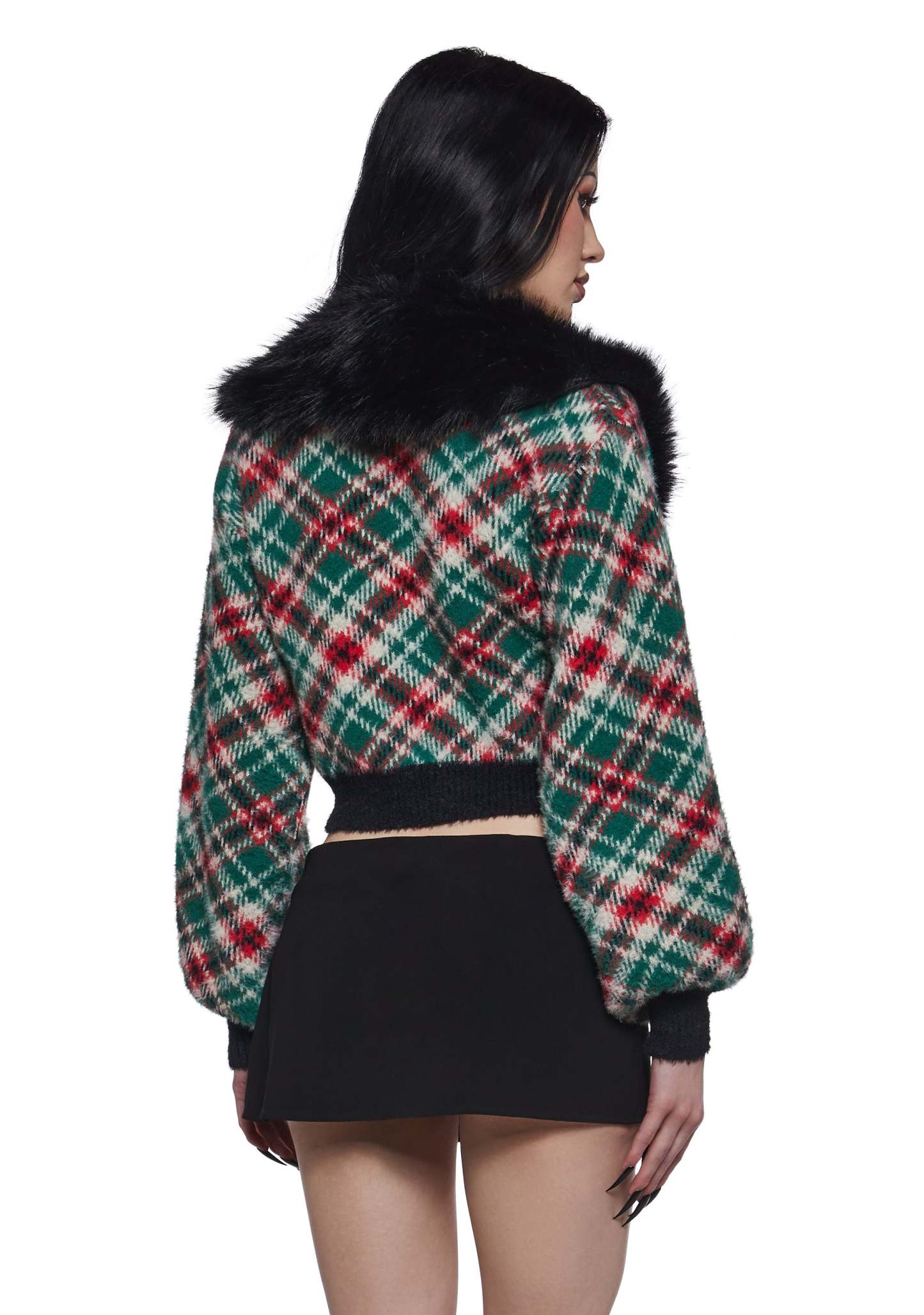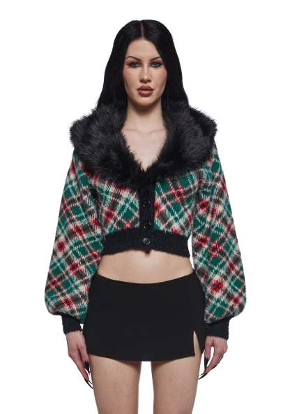 cuz you’re ready to win best dressed. This cardigan has a soft intarsia construction, a faux fur collar, a plaid design, and front button up closure.