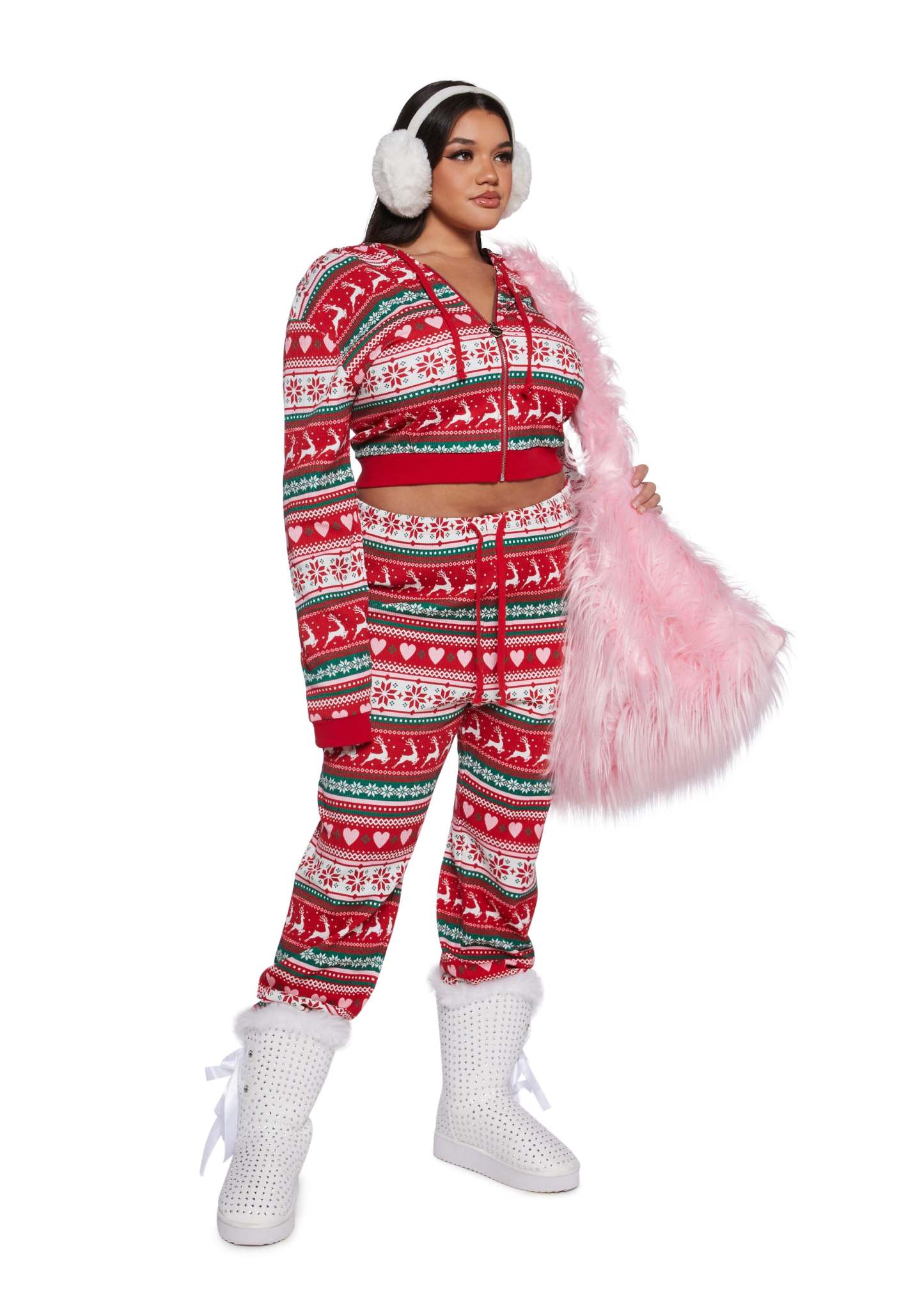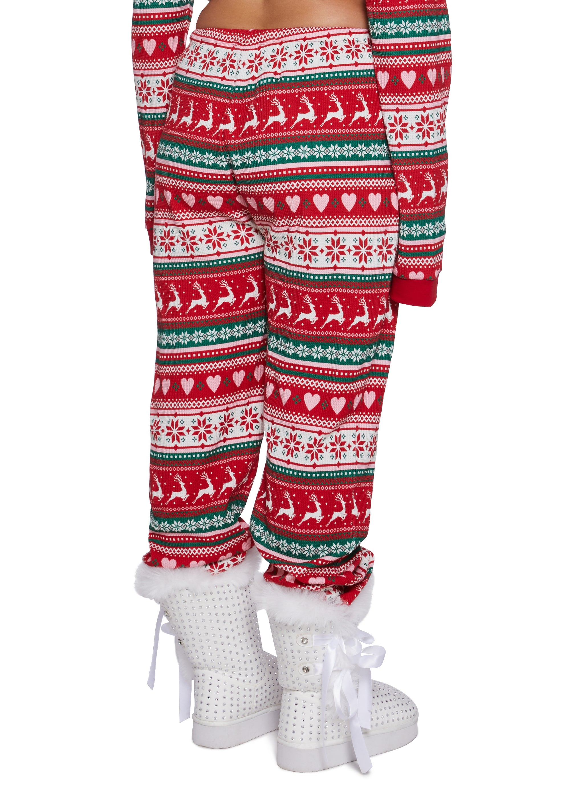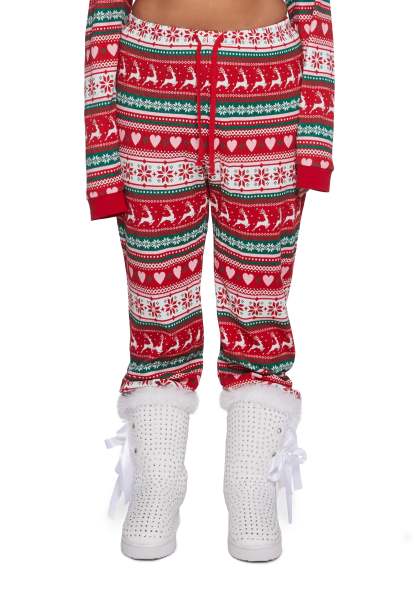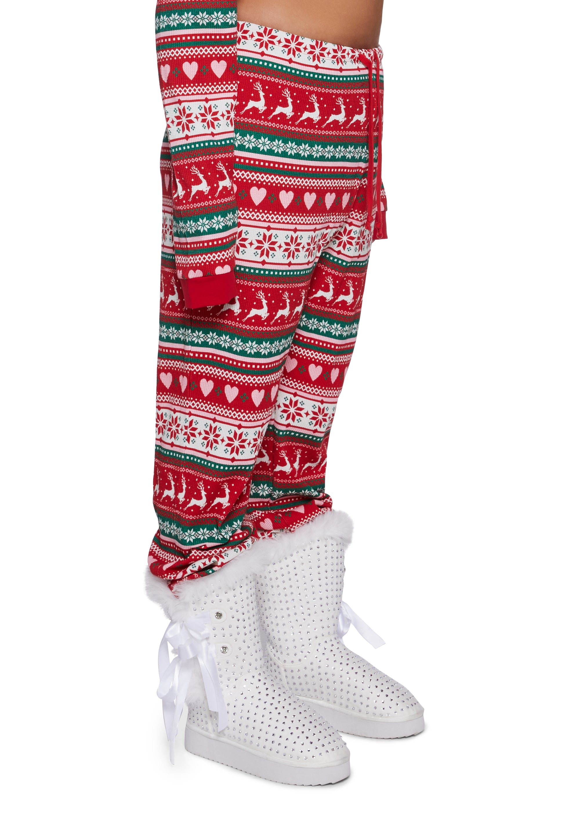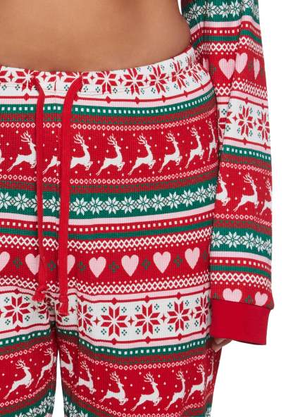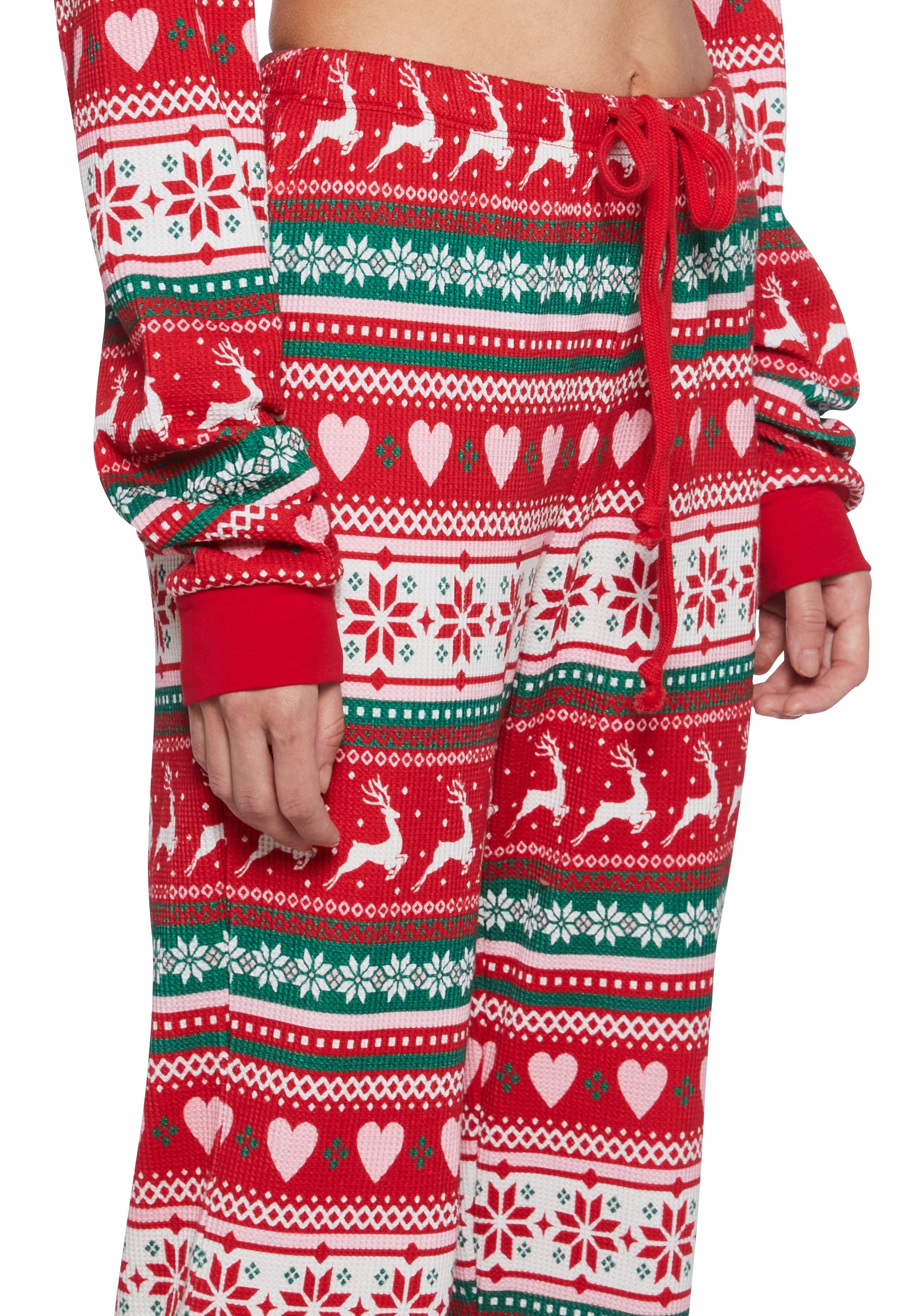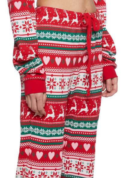 Cozy up by the fireside in these lounge pants, featuring a waffle knit construction, an intarsia design of reindeer, snowflakes and hearts, an elastic waistband, and an adjustable drawstring closure.