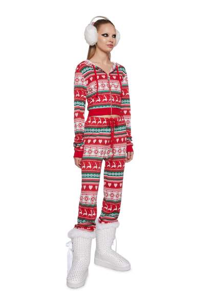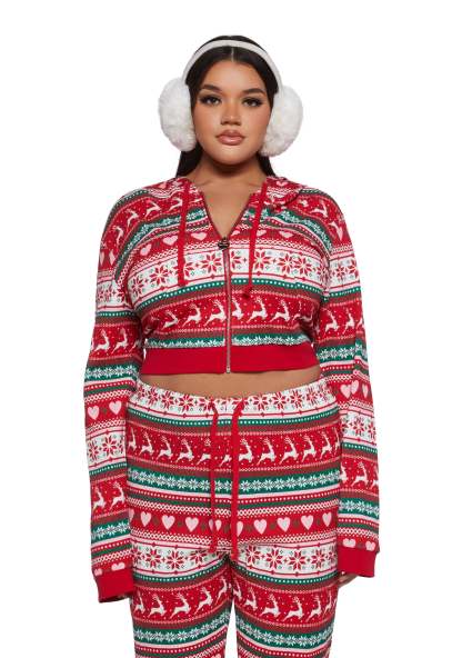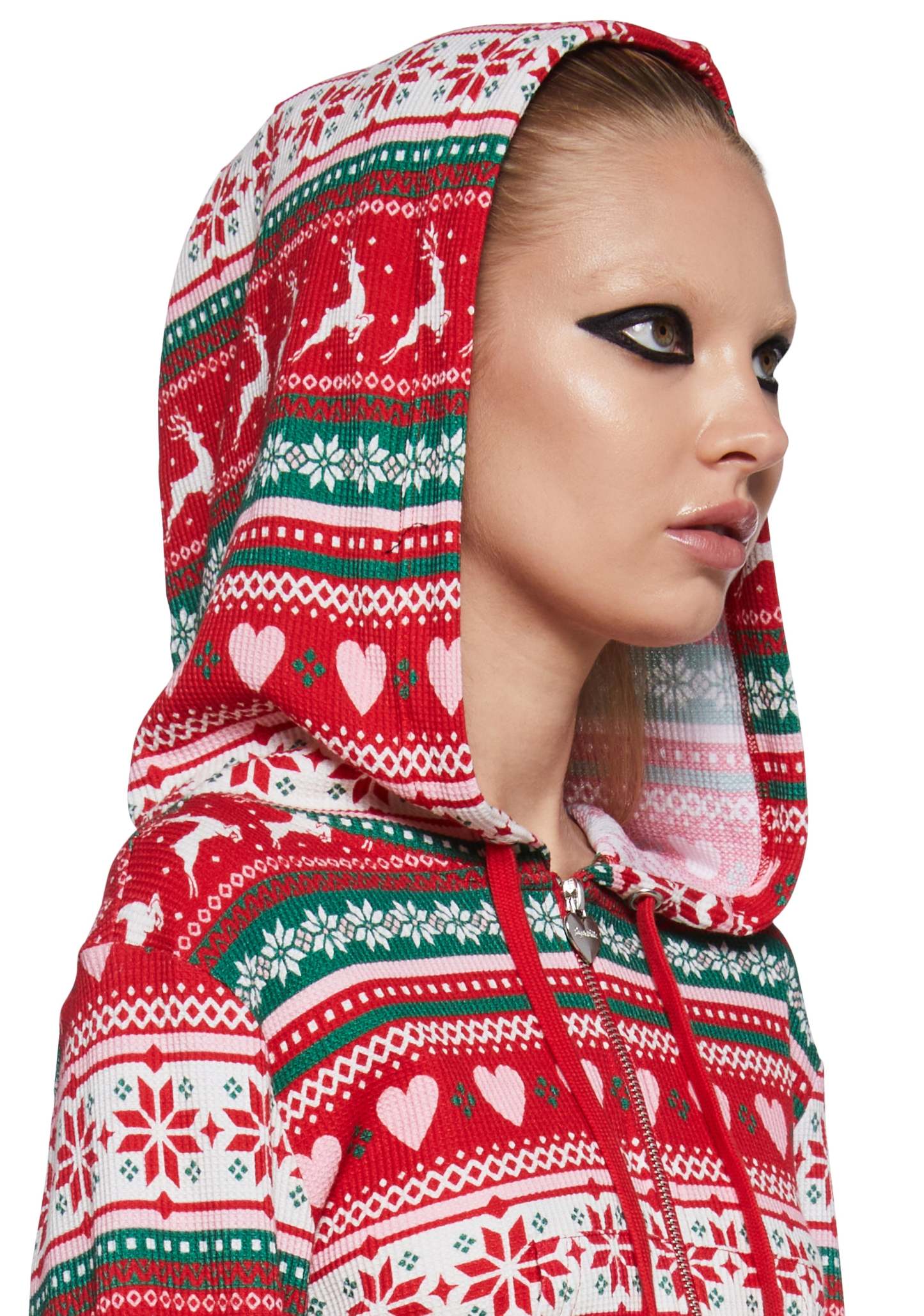 Cozy up by the fireside in this hoodie, featuring a waffle knit construction, an intarsia design of reindeer, snowflakes, and hearts, an attached hood with adjustable drawstrings, kangaroo front pockets, and a front zipper closure with a heart-shaped pull.