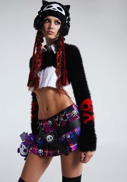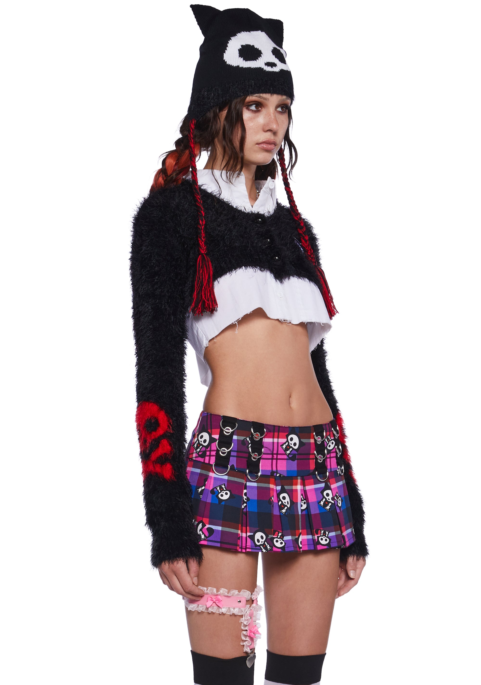 This cardigan has a fuzzy construction, a Kit Skelanimal embroidered patch on front, skull graphics embroidered on the sleeves, a button down front closure, and a cropped fit.