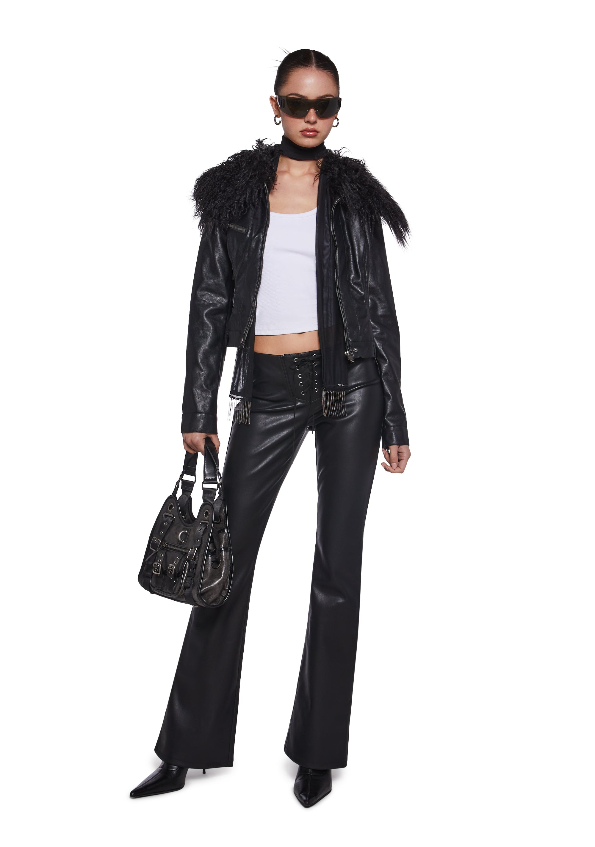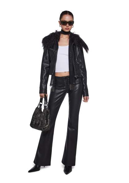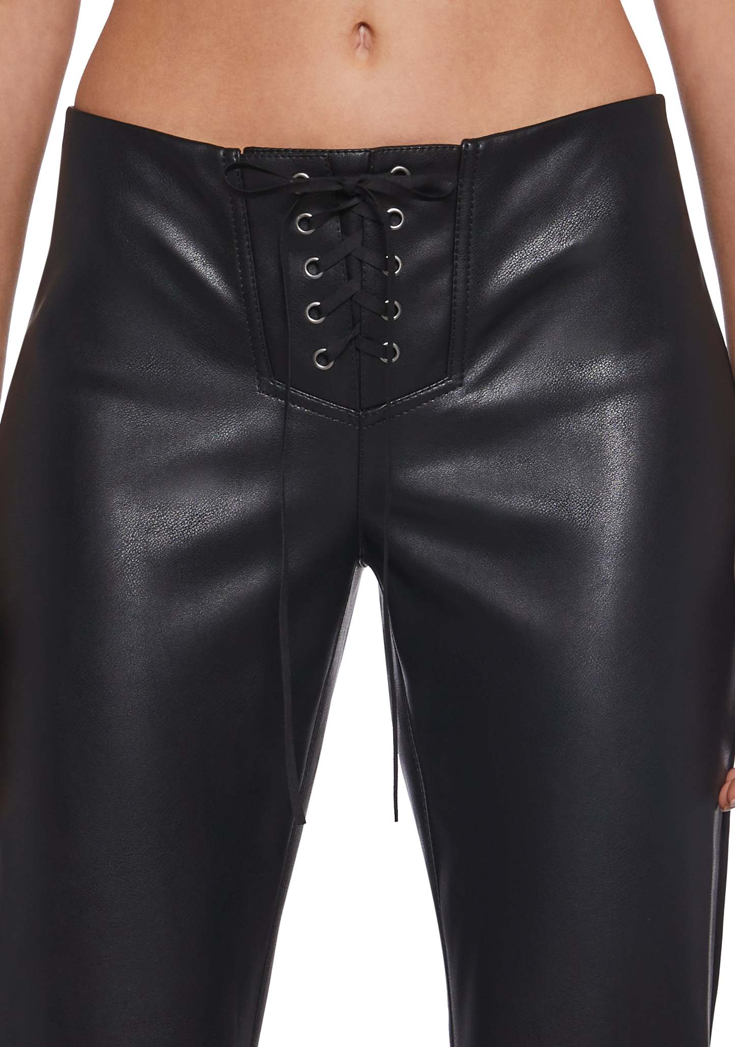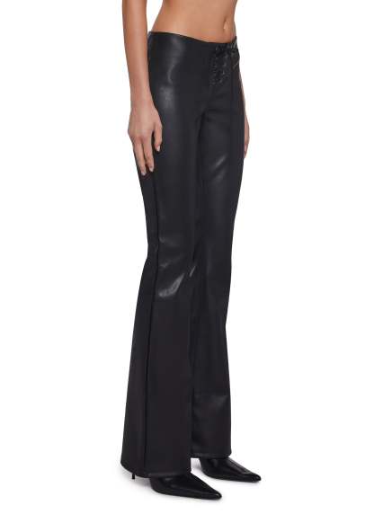 These pants have a vegan leather construction, a flared leg silhouette, and front lace-up closures.