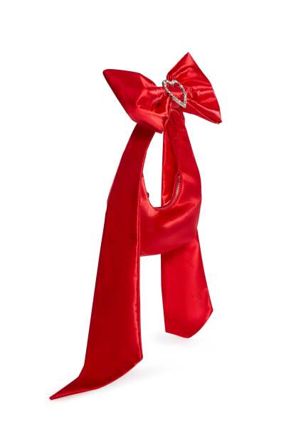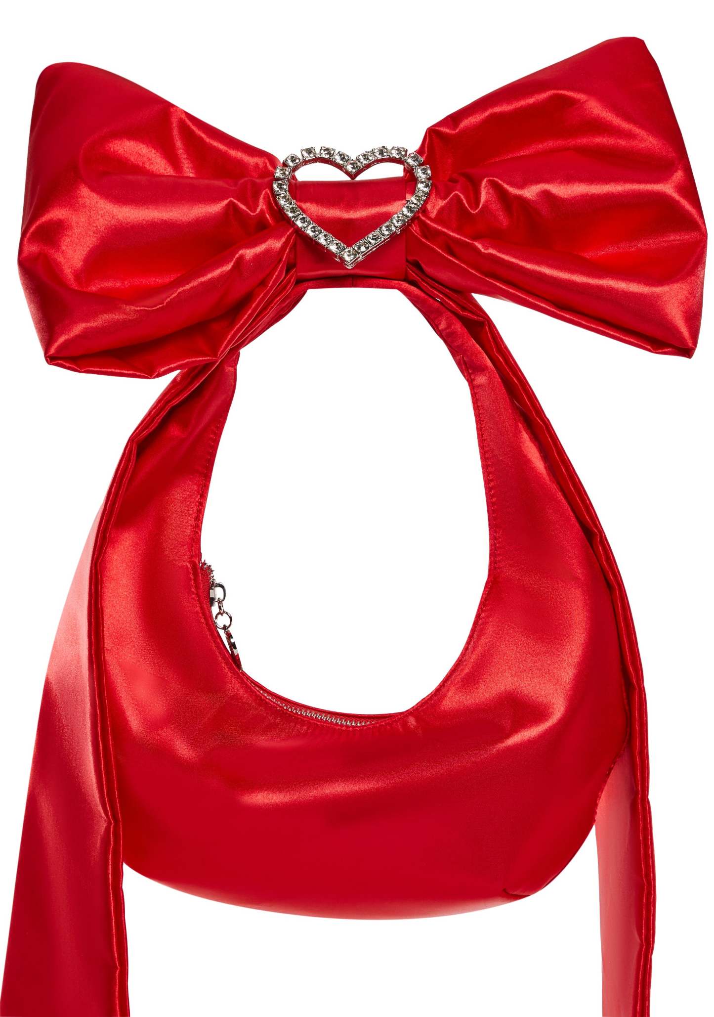 cuz everyone wants to be you. This bag has a satin construction, a ribbon handle with rhinestones, a centered heart adornment, and top zipper closure.