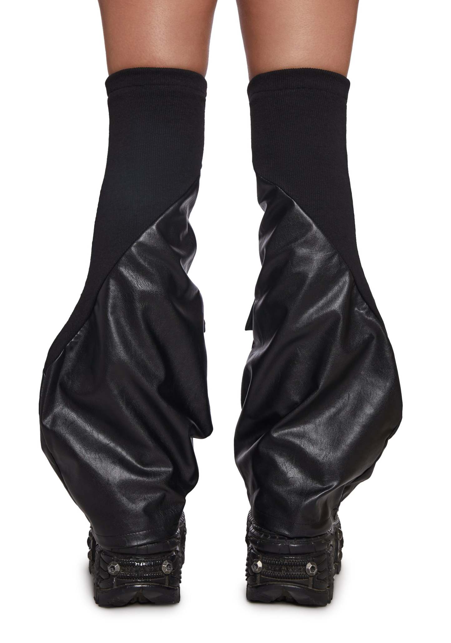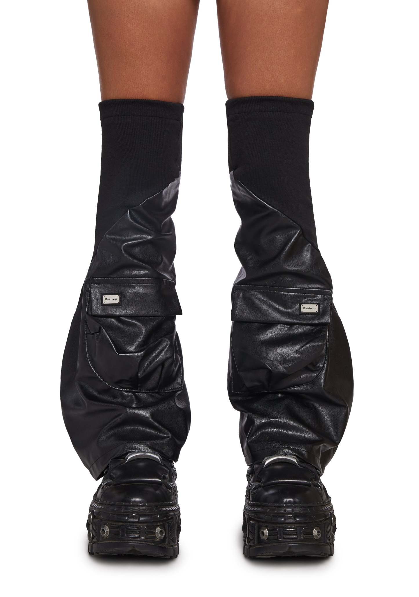 These leg warmers have a vegan leather construction, a cargo pocket on the front, metal hardware, and a knit ribbed trim.