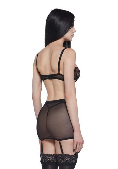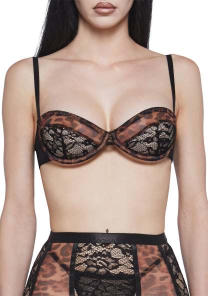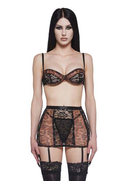 This lingerie set includes a bra top that has a lace and leopard print construction, an underwire bust, back hook and eye closures, mathing thong panty and skirt with attached garter straps.