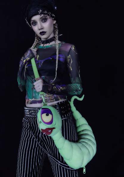 cuz omg what is that. This Maggot bag has a plush construction, an embroidered face design on the front, a removable shoulder strap, and two zippered pocket closures in the head and side.