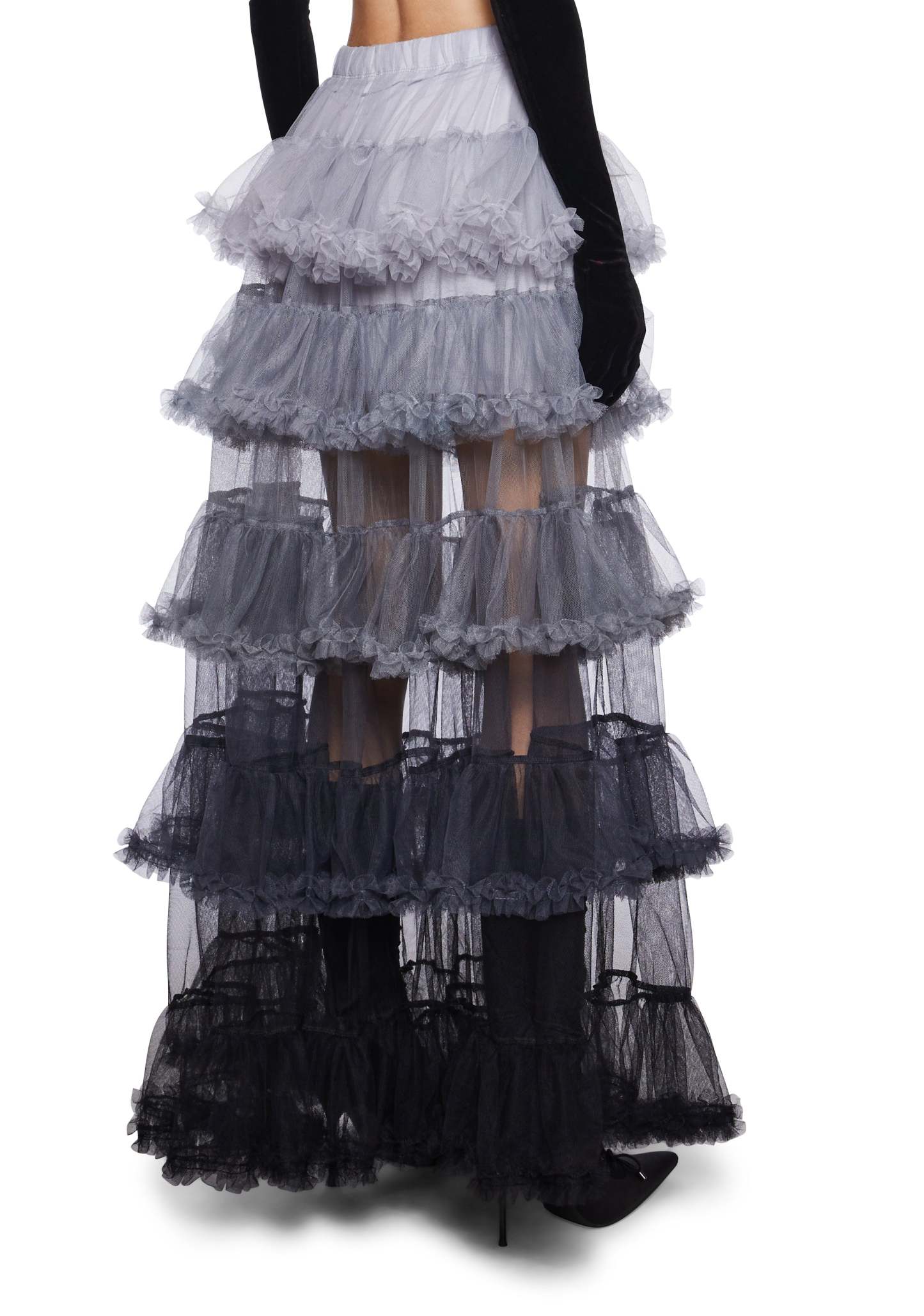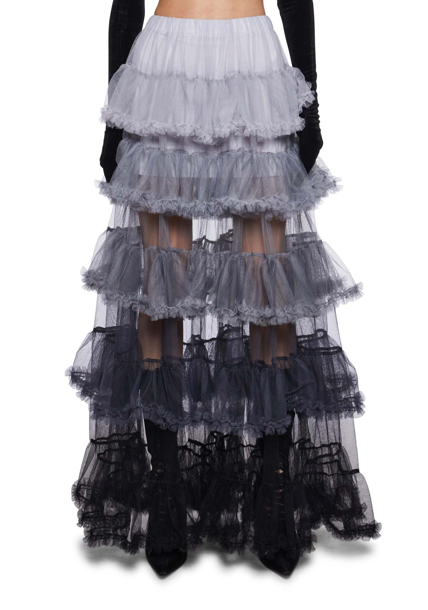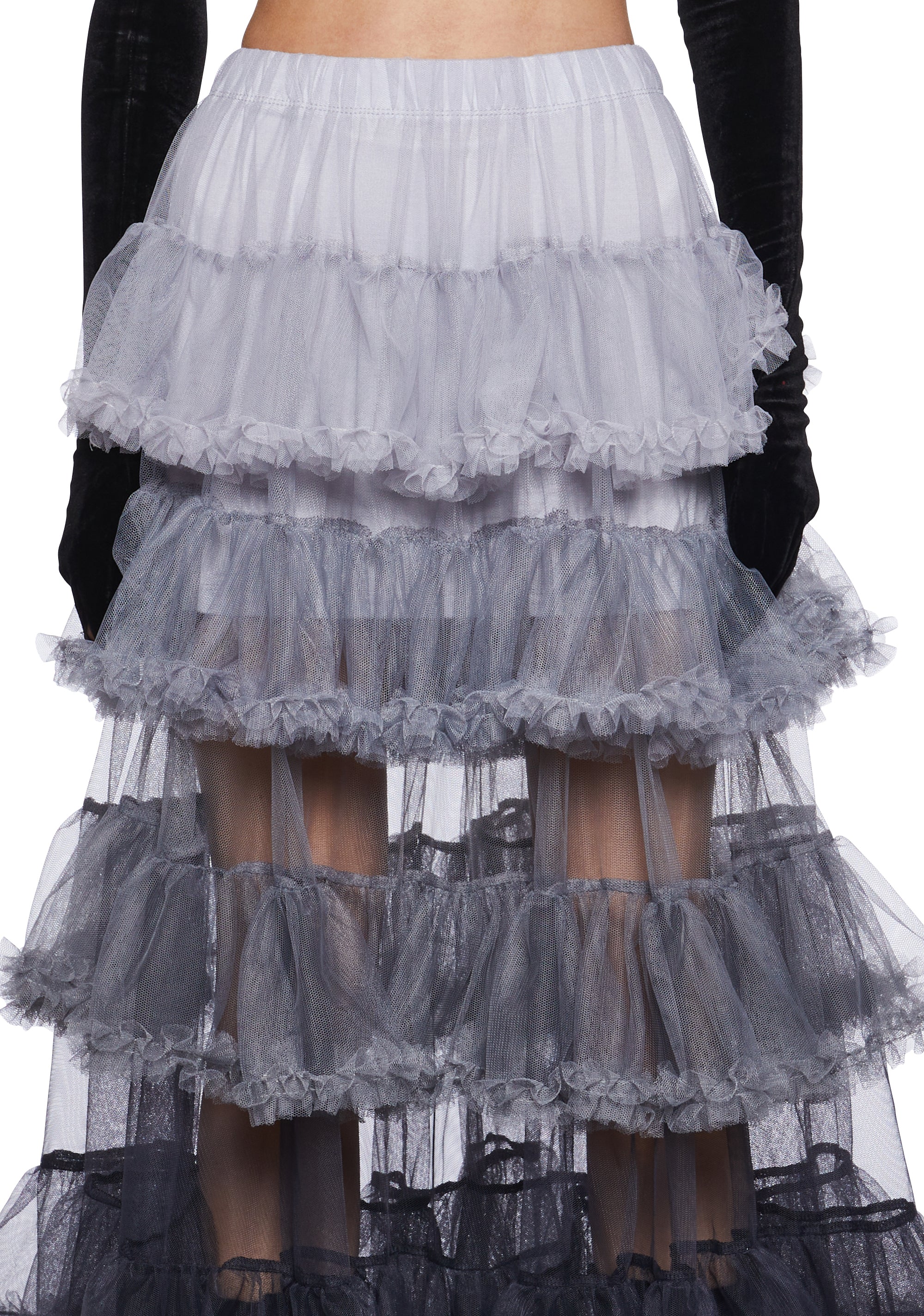 This maxi skirt has a tulle construction, a mini skirt lining, an ombre colored tiered design, an elastic waistband, and a ruffled trim.