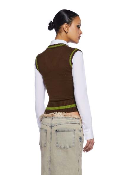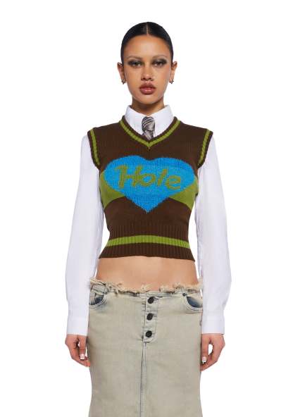 cuz go and part the sea. This sweater vest has a knit construction, a v-neckline, a striped ribbed trim, and a contrast colored heart in the center with the band Hole logo on the front.