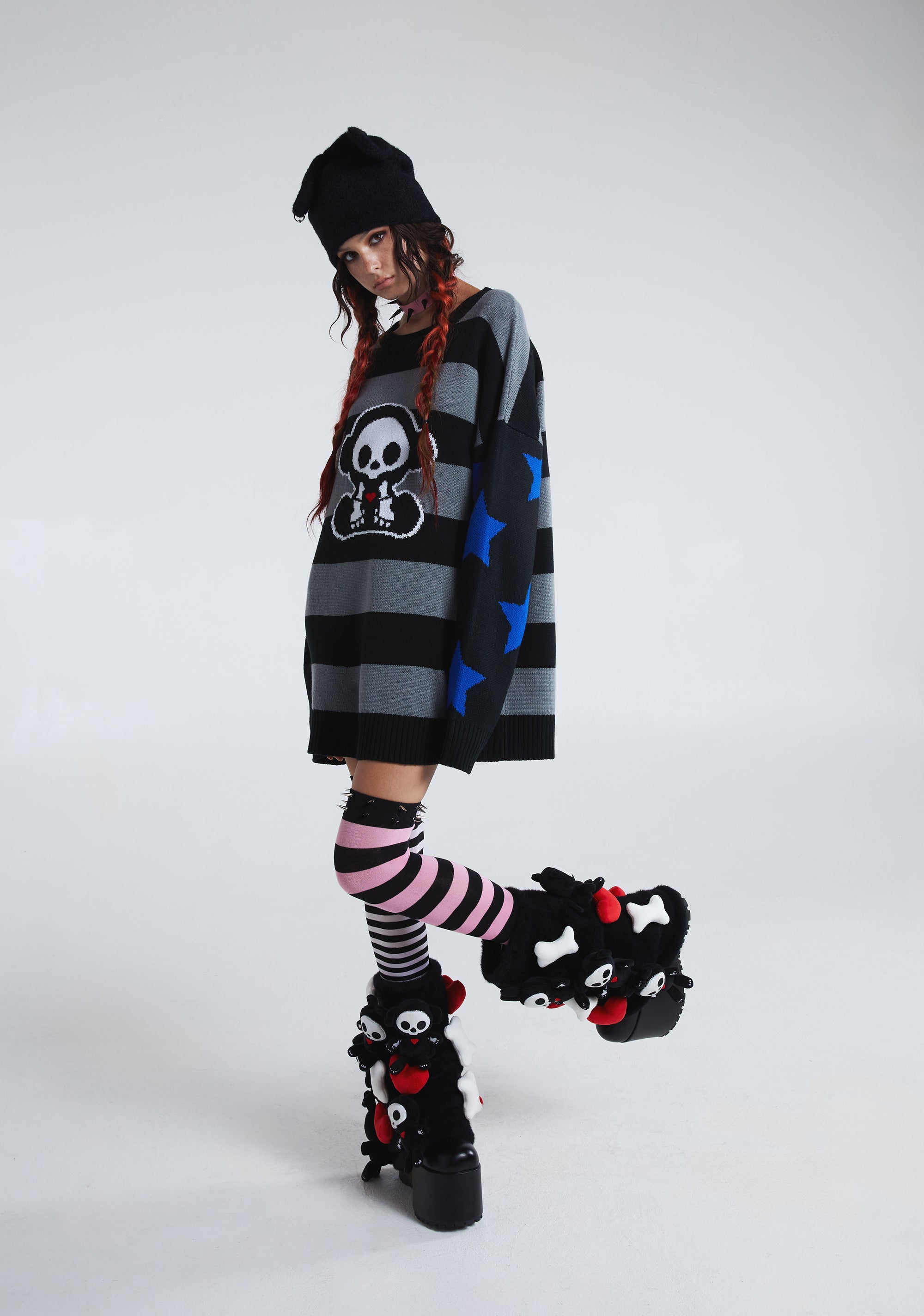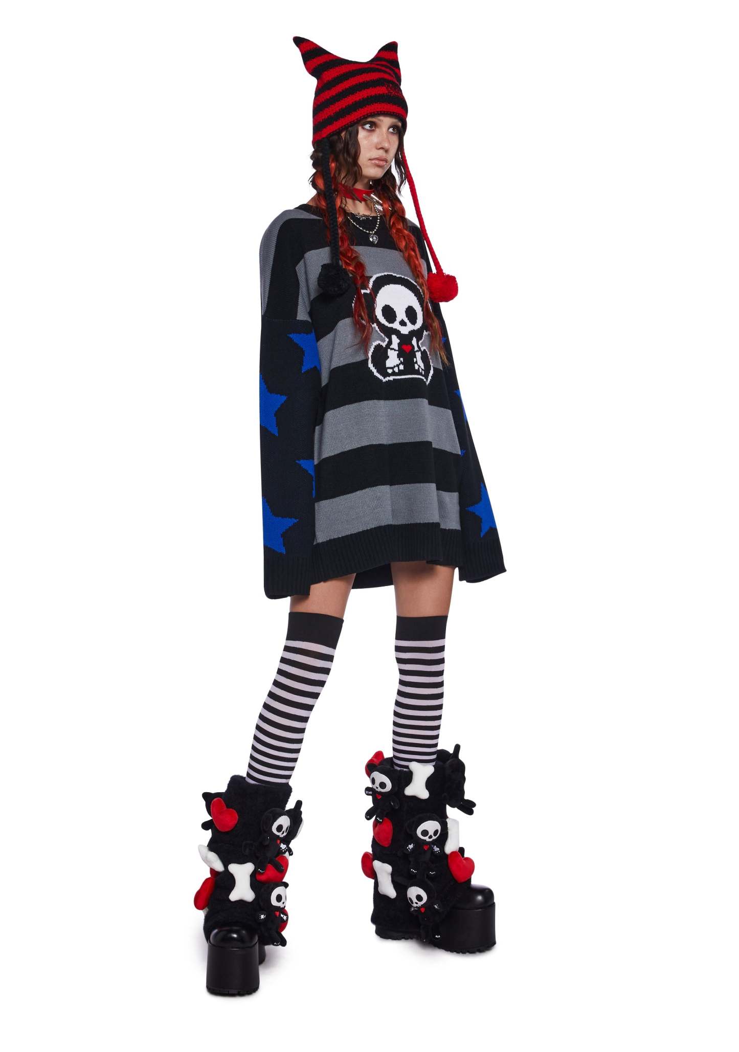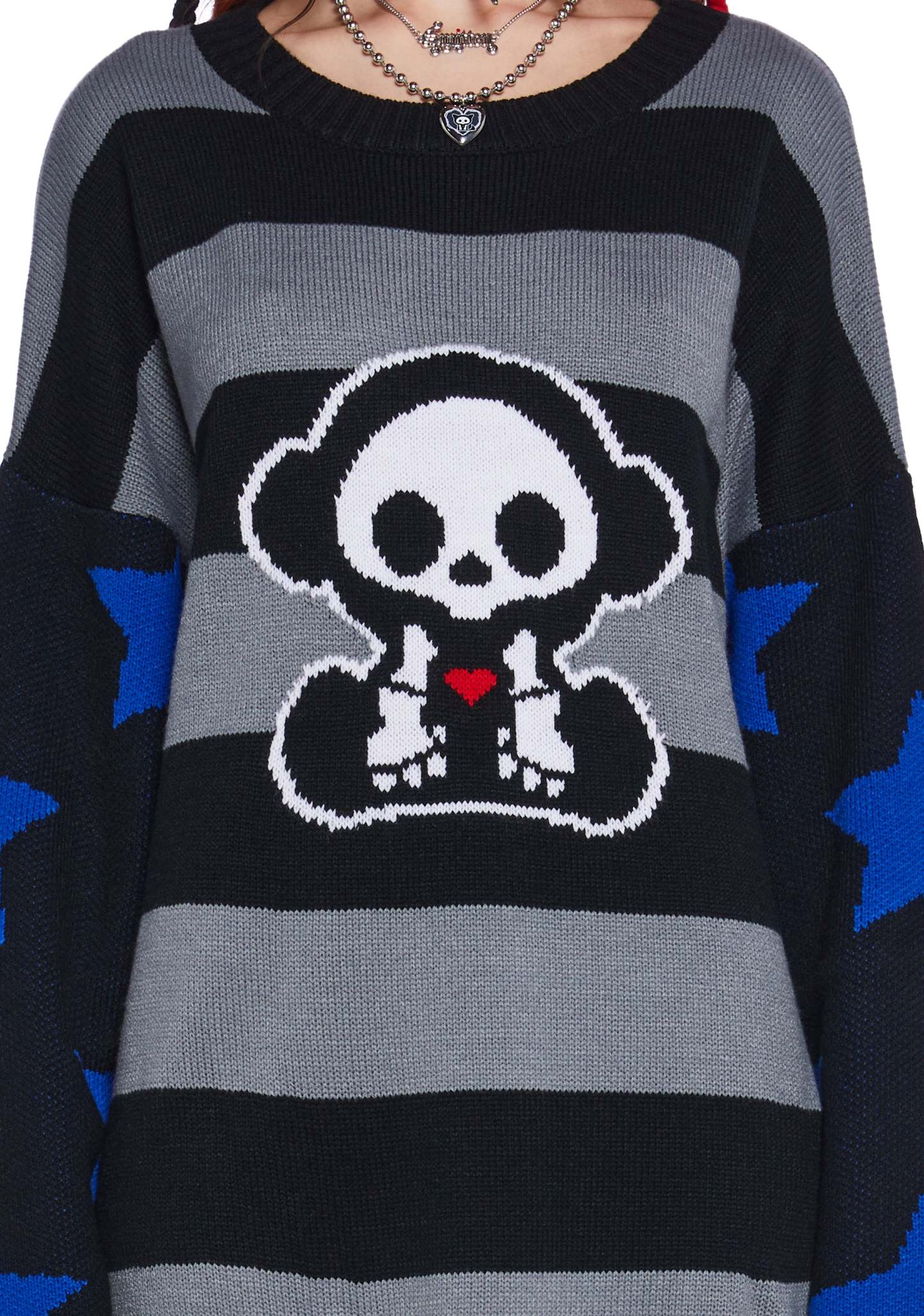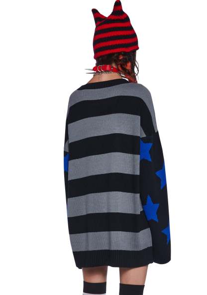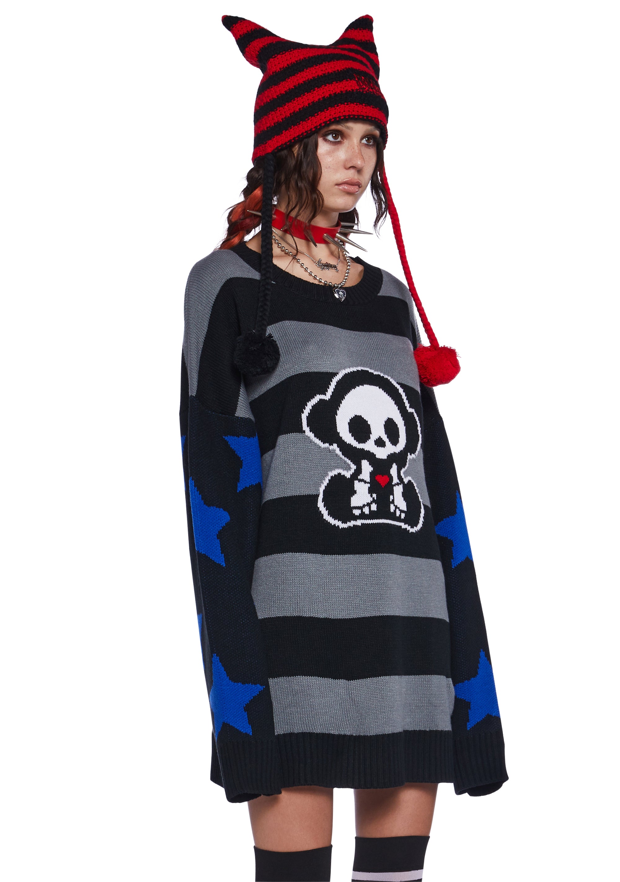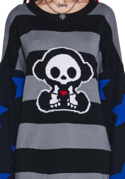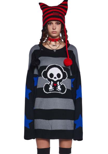 This sweater has a stretchy ribbed knit construction, an intarsia embroidered striped design with Marcy Skelanimal on the front, stars embroidered on the sleeves, and an oversized fit.
