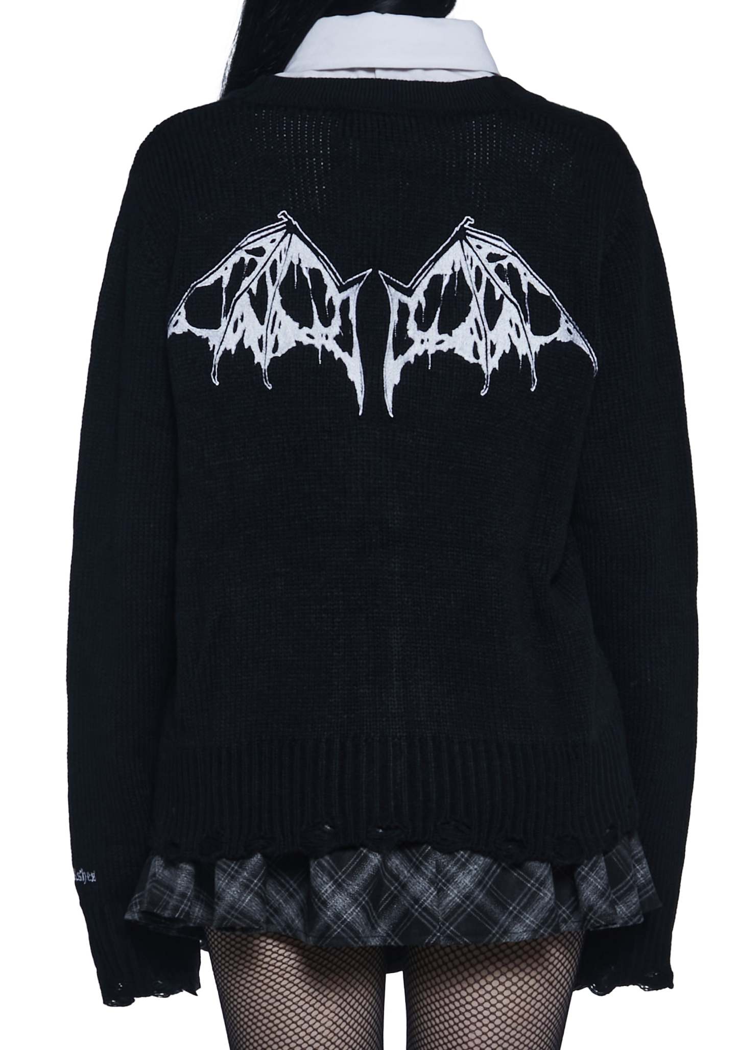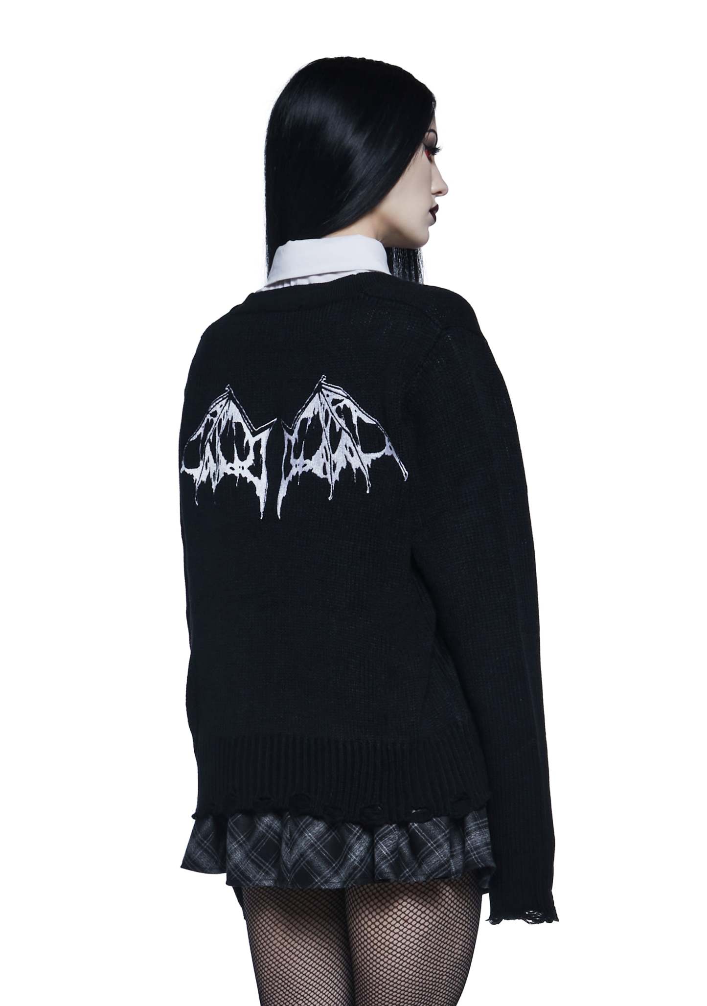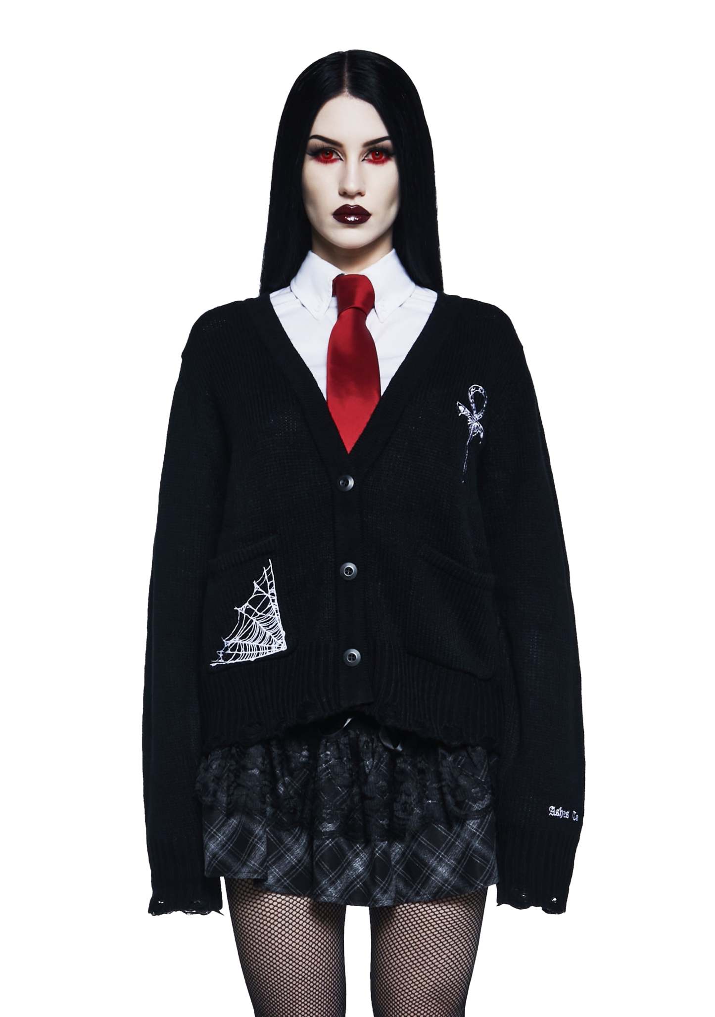 This cardigan has an acrylic knit construction with ribbed knit cuffs and hem, a distressed design, front pockets, an embroidered spider web on the front pocket, an embroidered ankh symbol on the chest, embroidered bat wings on the back, and front button closures.
