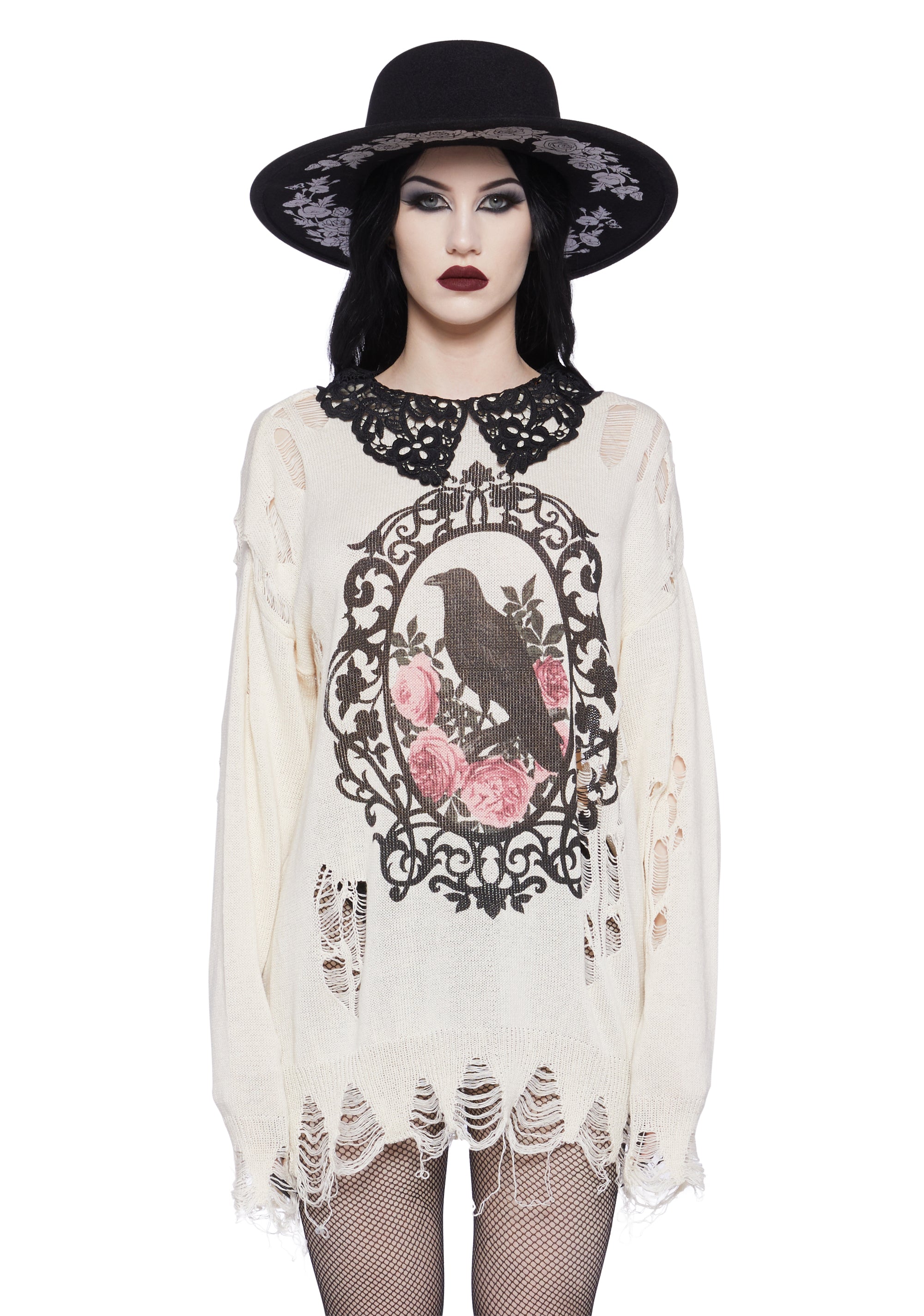 cuz the night is endless. This distressed sweater features a crow cameo print on the front with an embroidered lace collar and button closure.