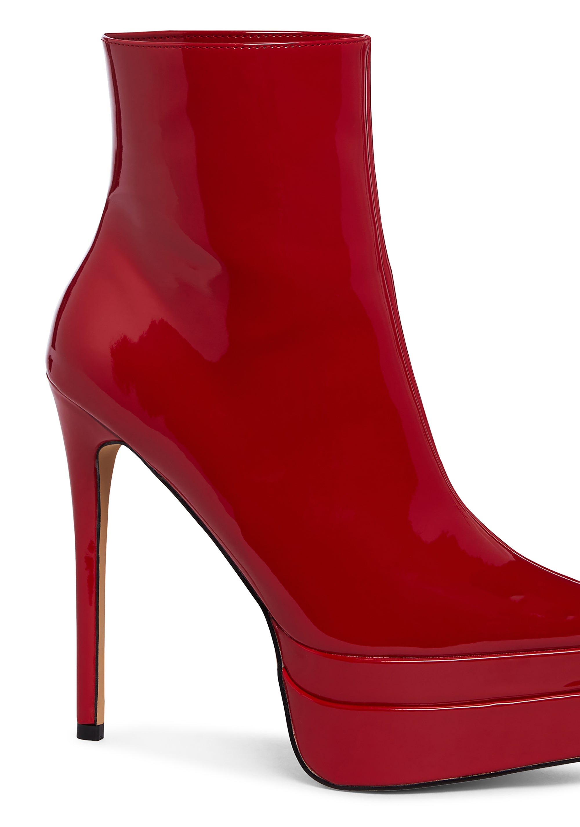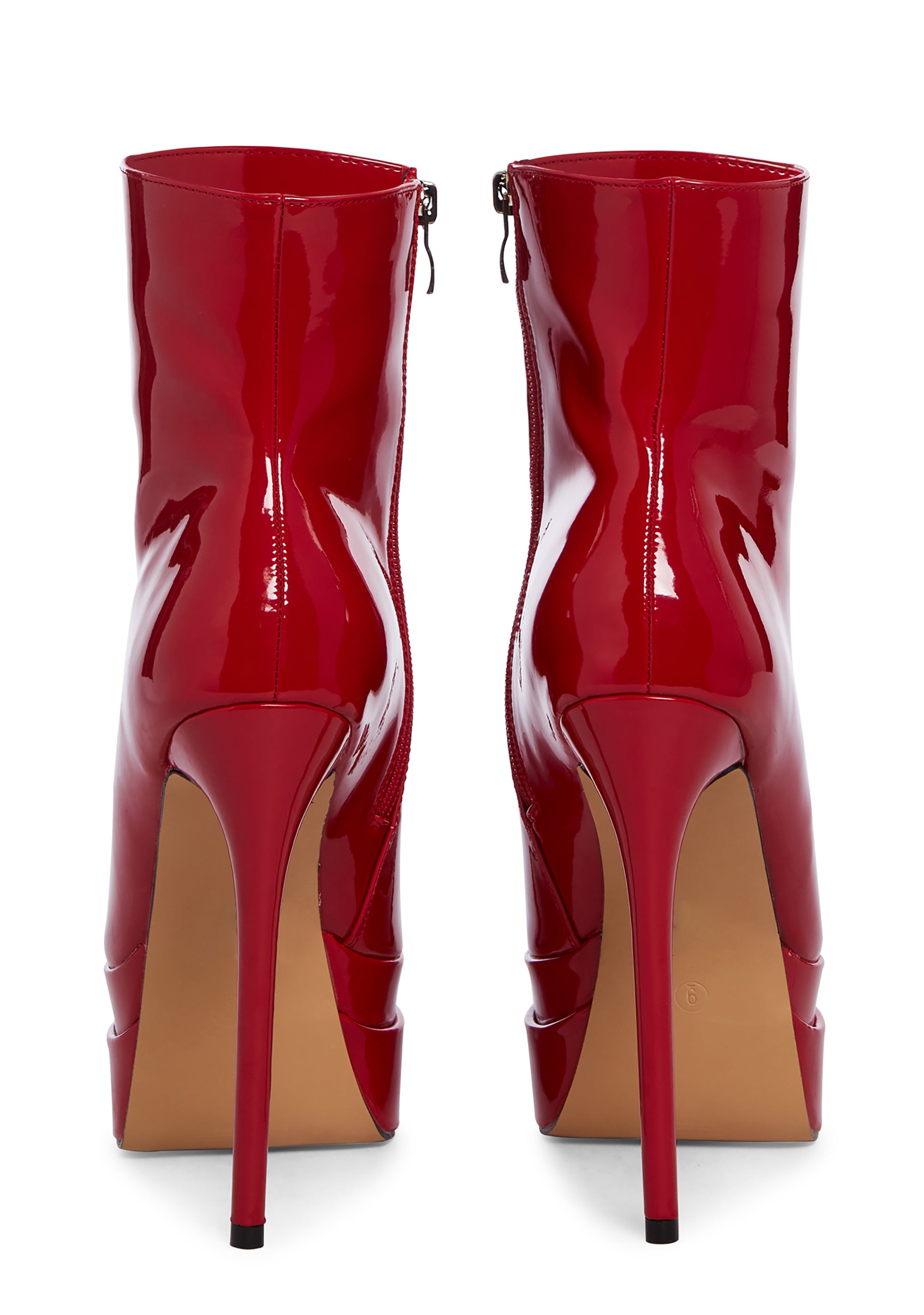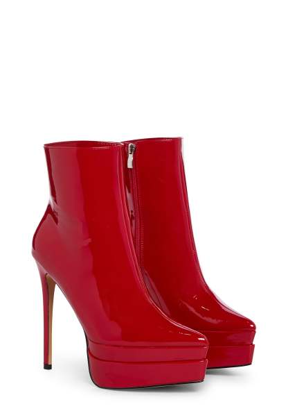 you’re the head chic in charge. These heeled boots have a patent vegan leather construction, stiletto heels, platform soles, and side zipper closure.