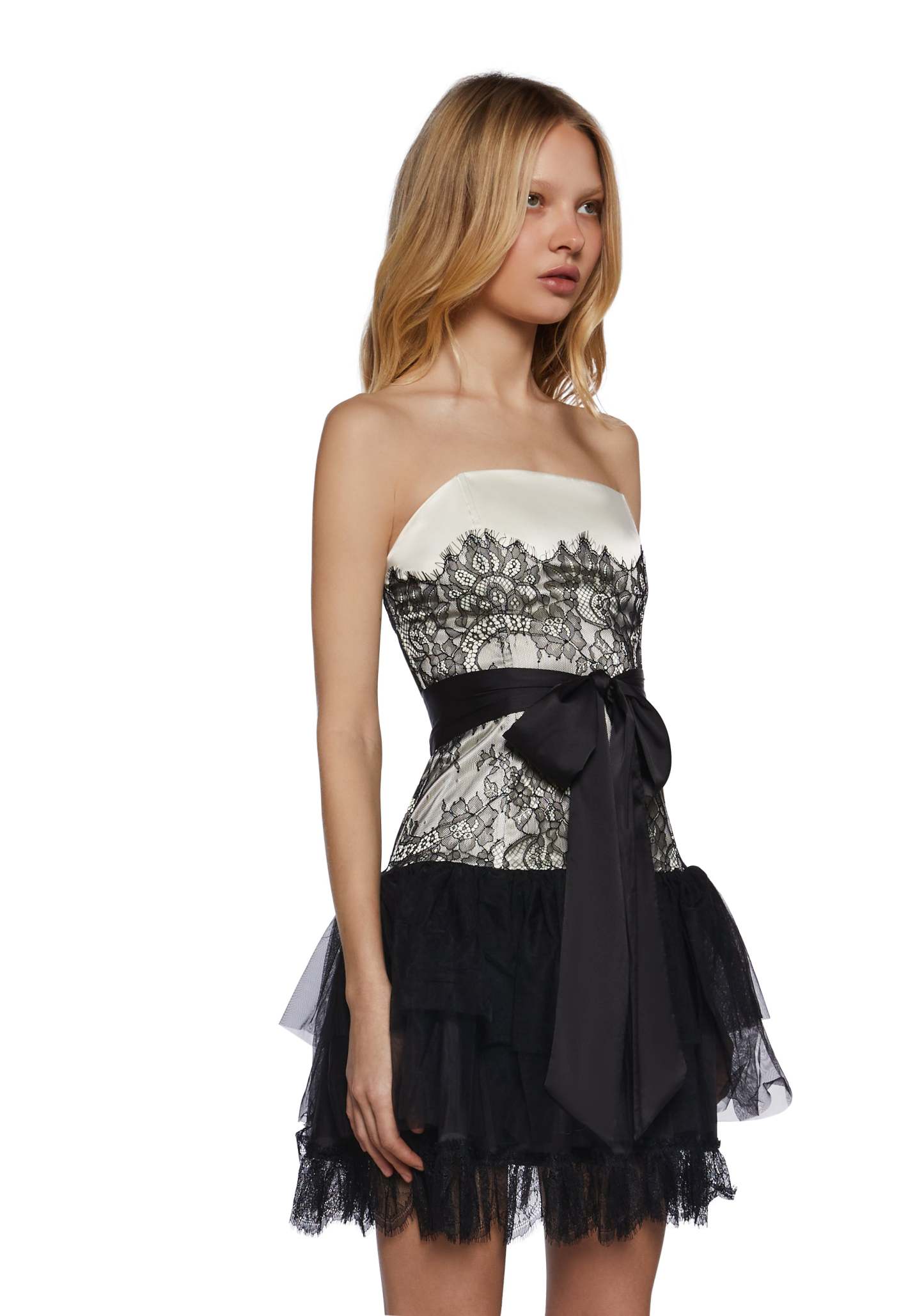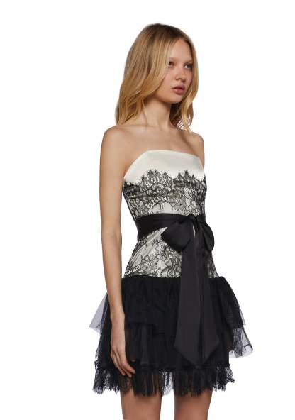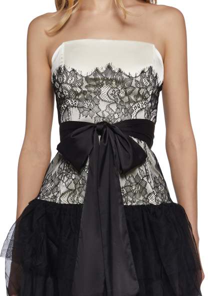This fully lined strapless dress has a sateen construction with a lace overlay, a tulle layered skirt with lace detailing, structured boning, a self-tie ribbon closure on the waist, and a side zipper closure.