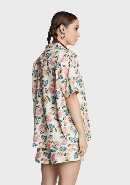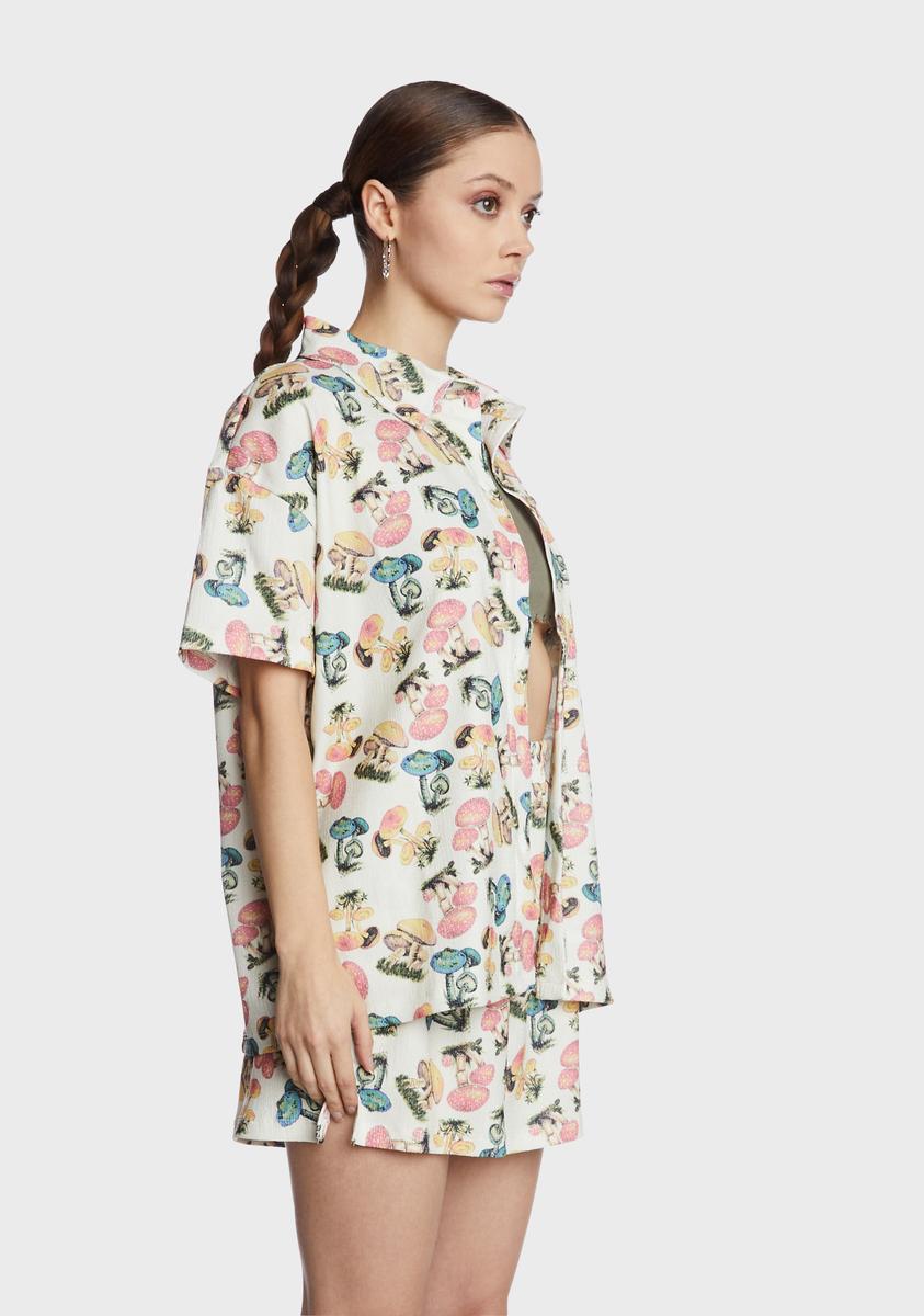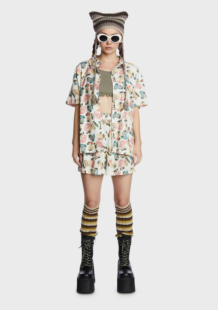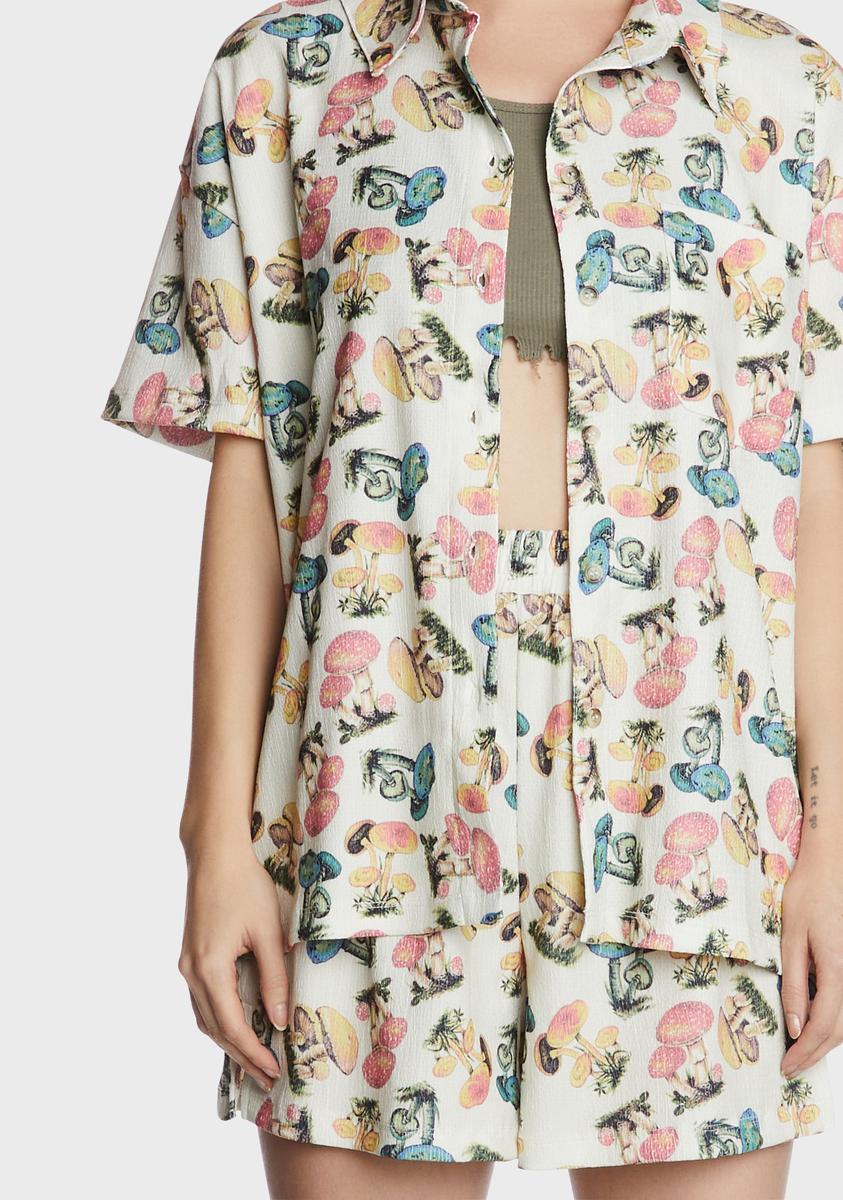cuz pickin' your OOTD has never been easier. This short sleeve shirt has a velour construction, a mushroom print all over, a collared neckline, front button closures, and a chest patch pocket.