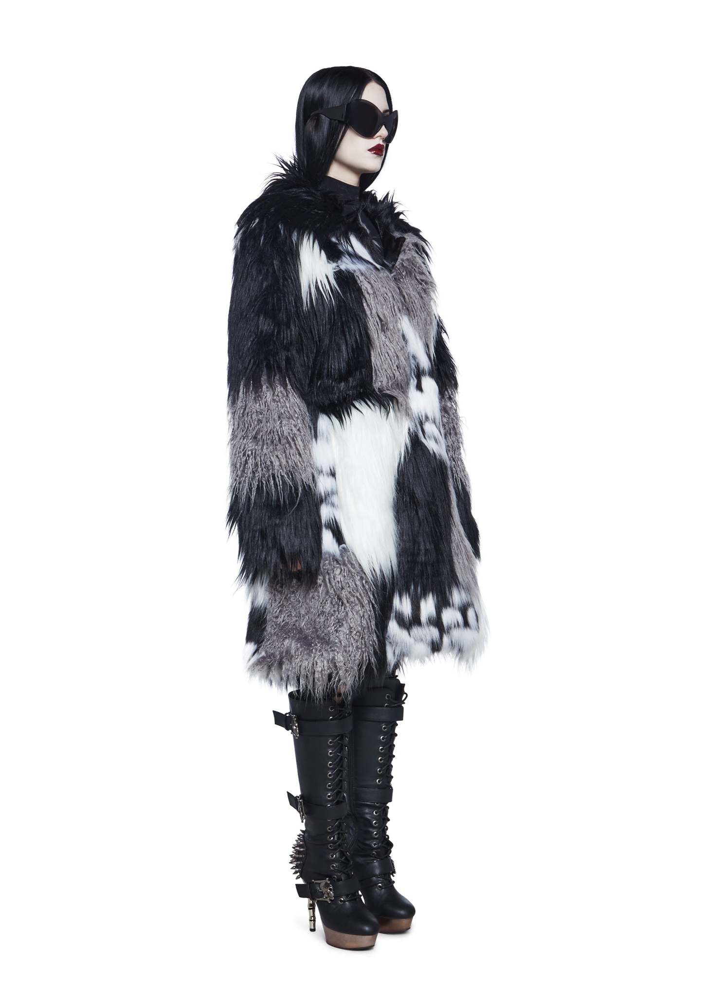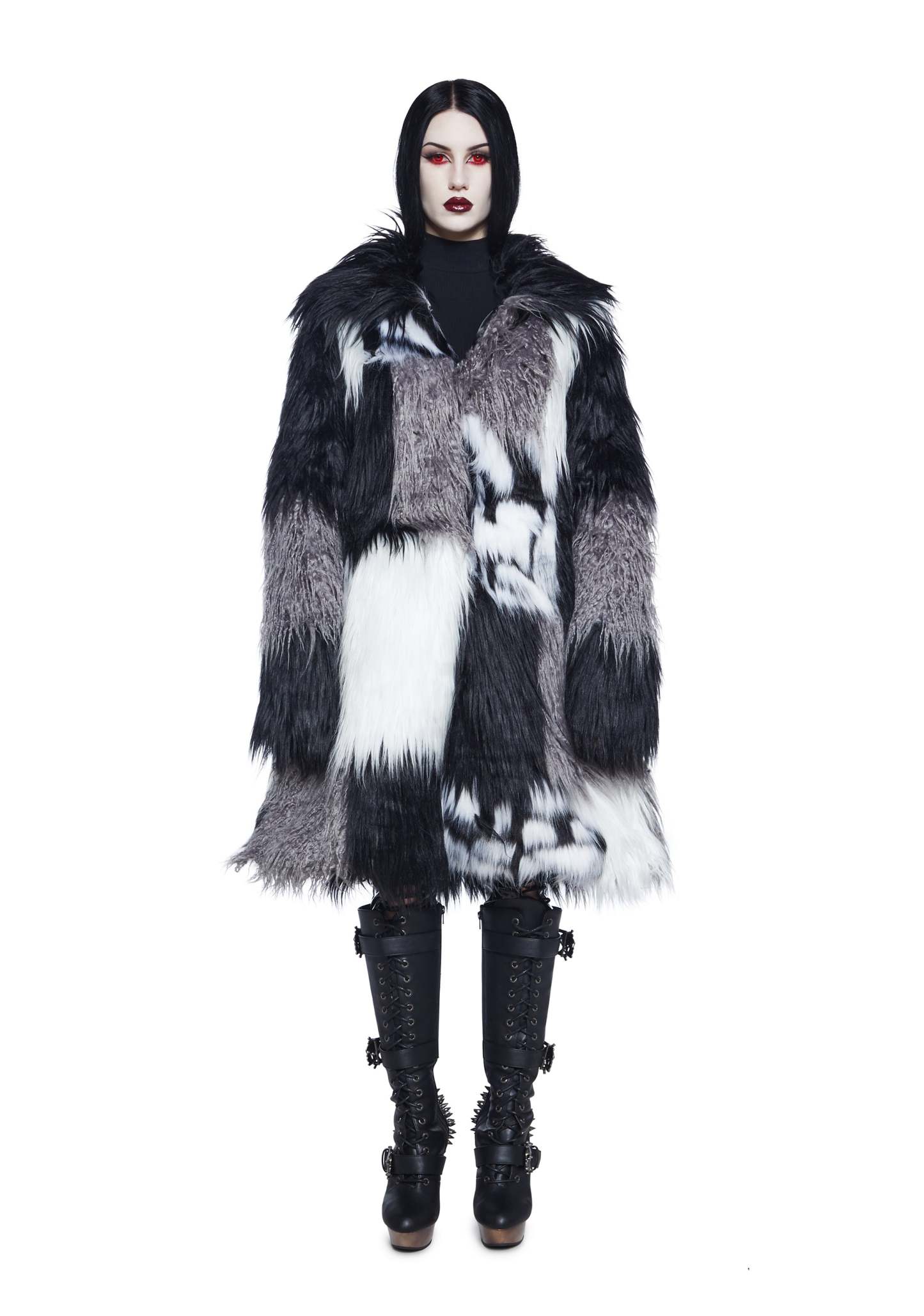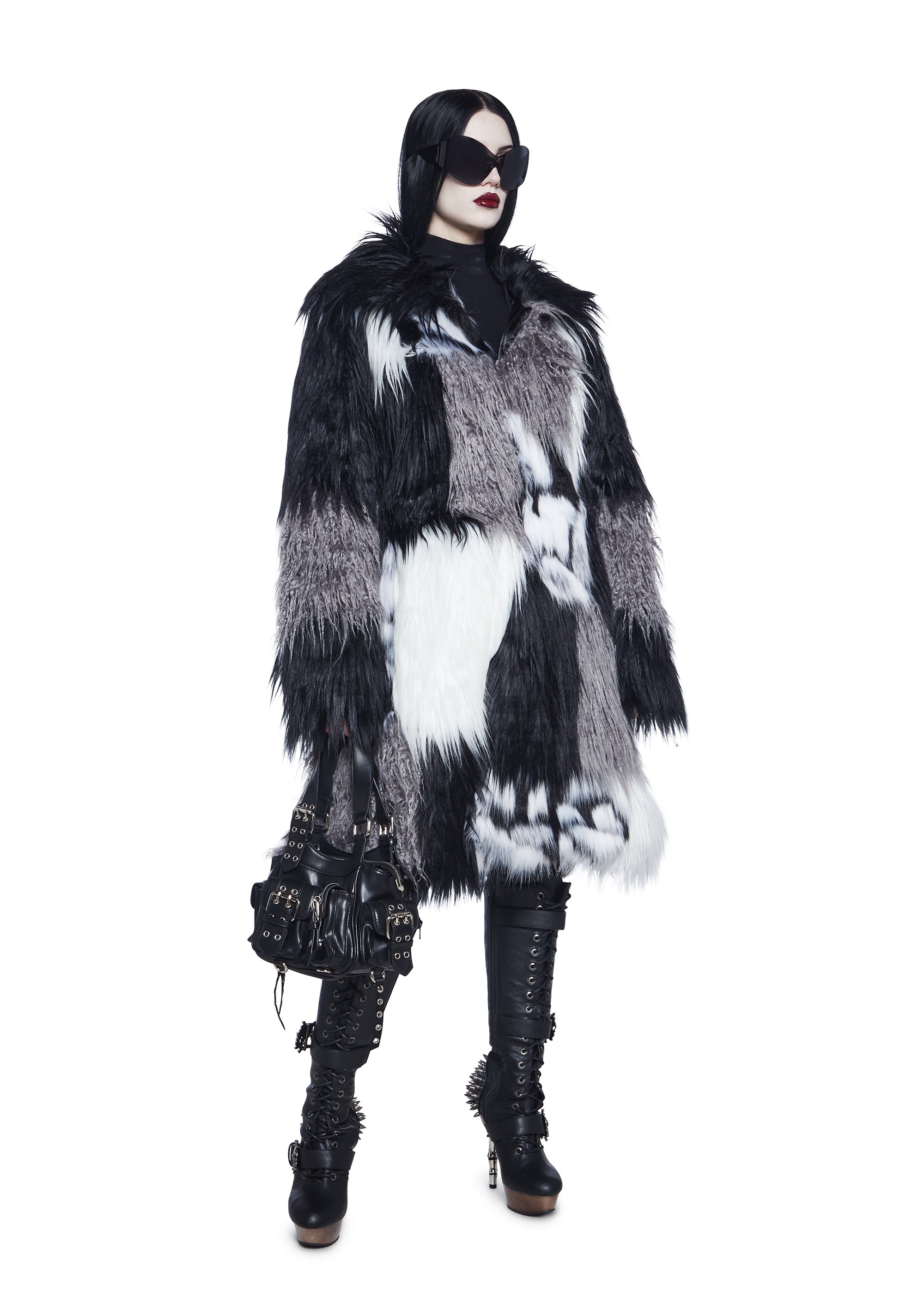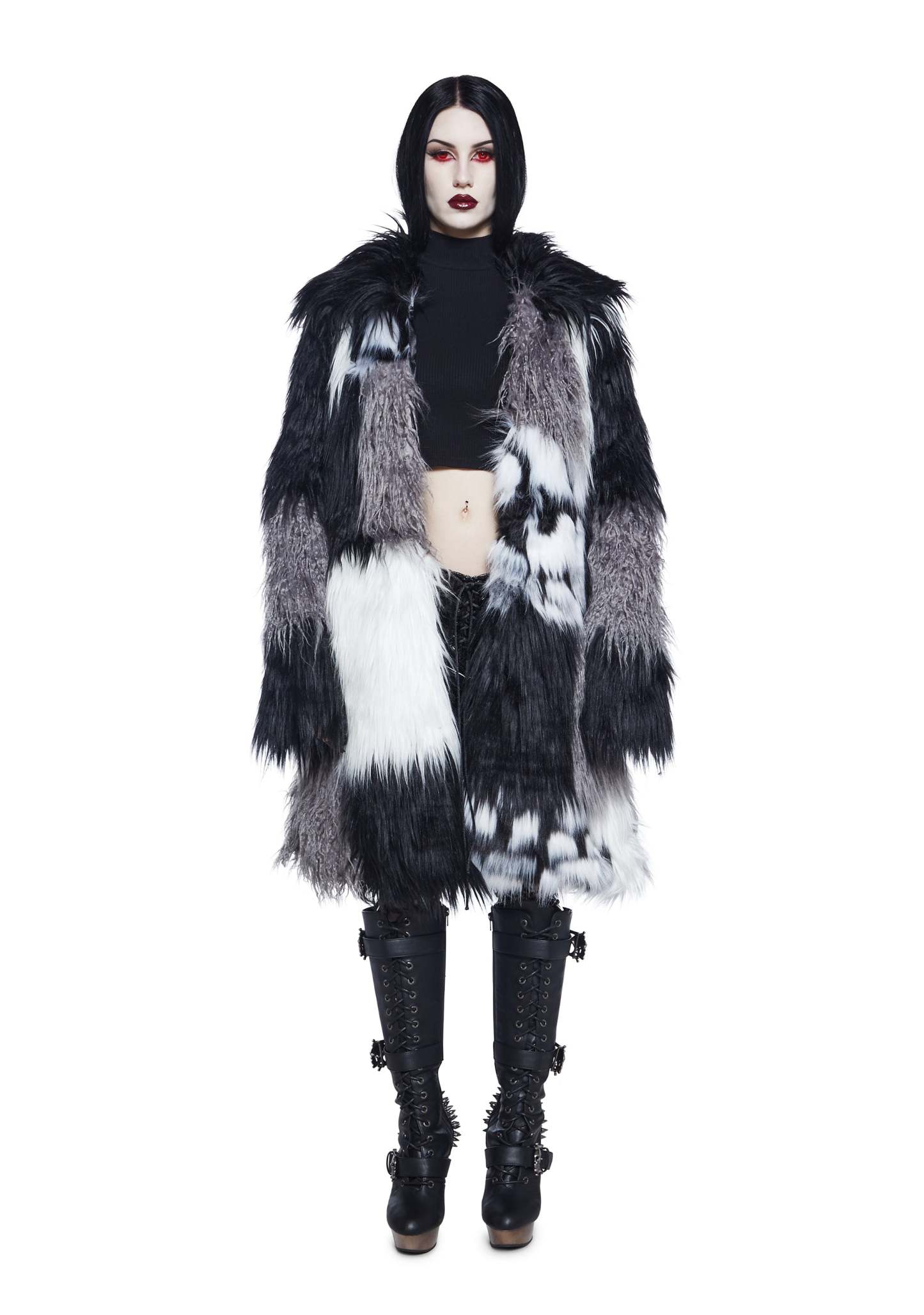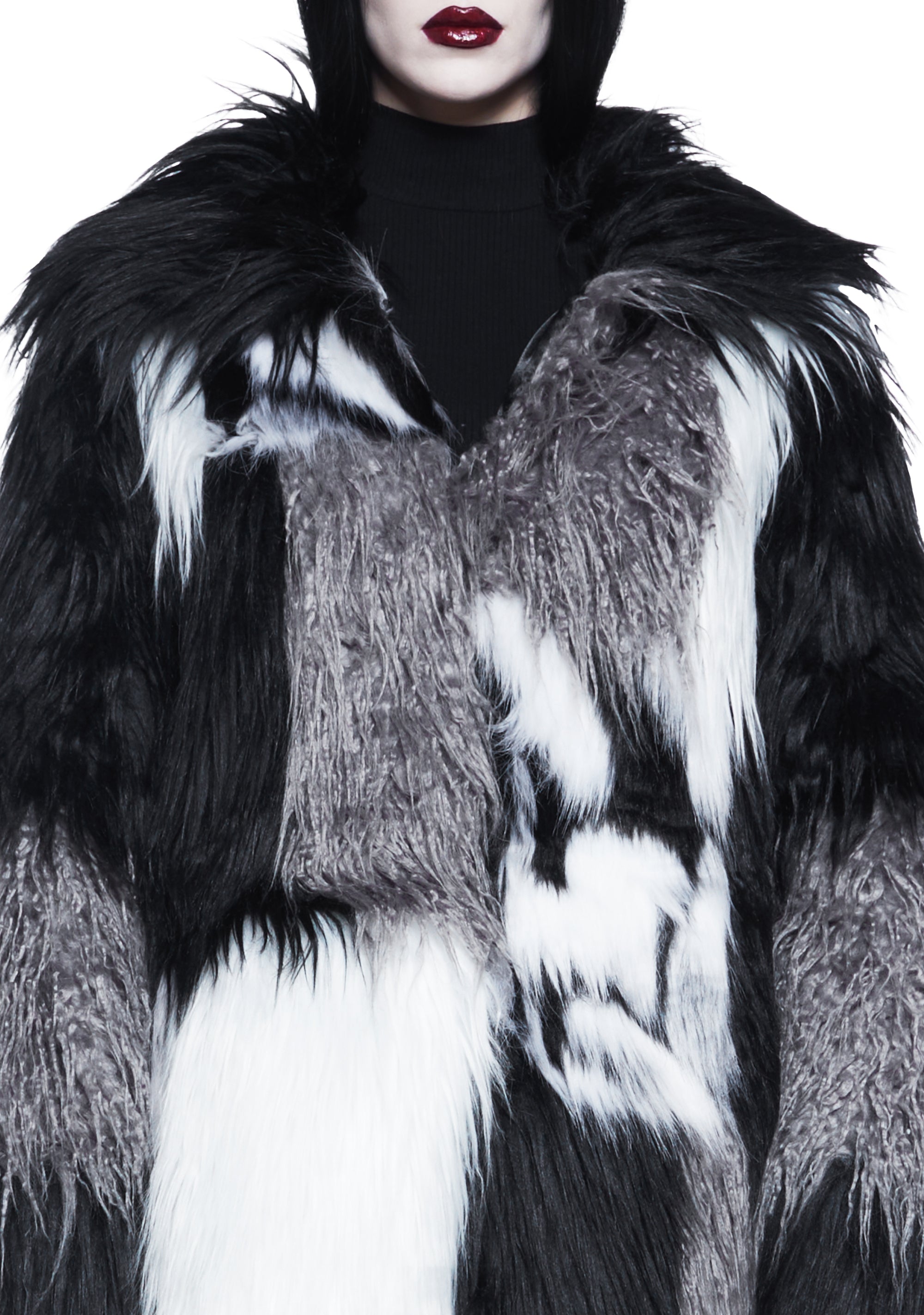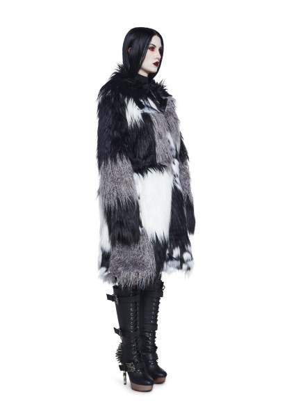 Blend in with the mortals in this midi coat that has a fuzzy faux fur construction, a patchwork design, a collared neckline, side pockets, and front hook and eye closures.