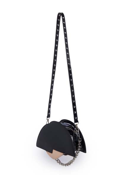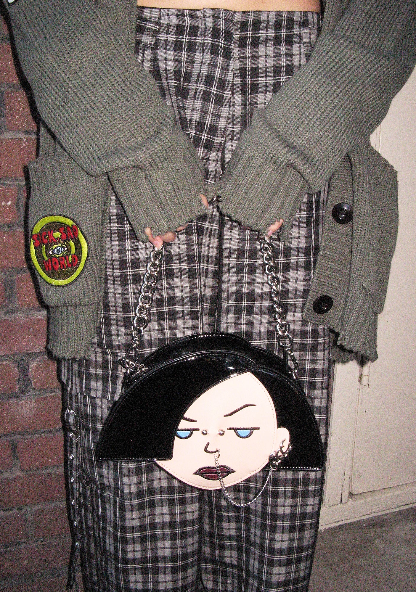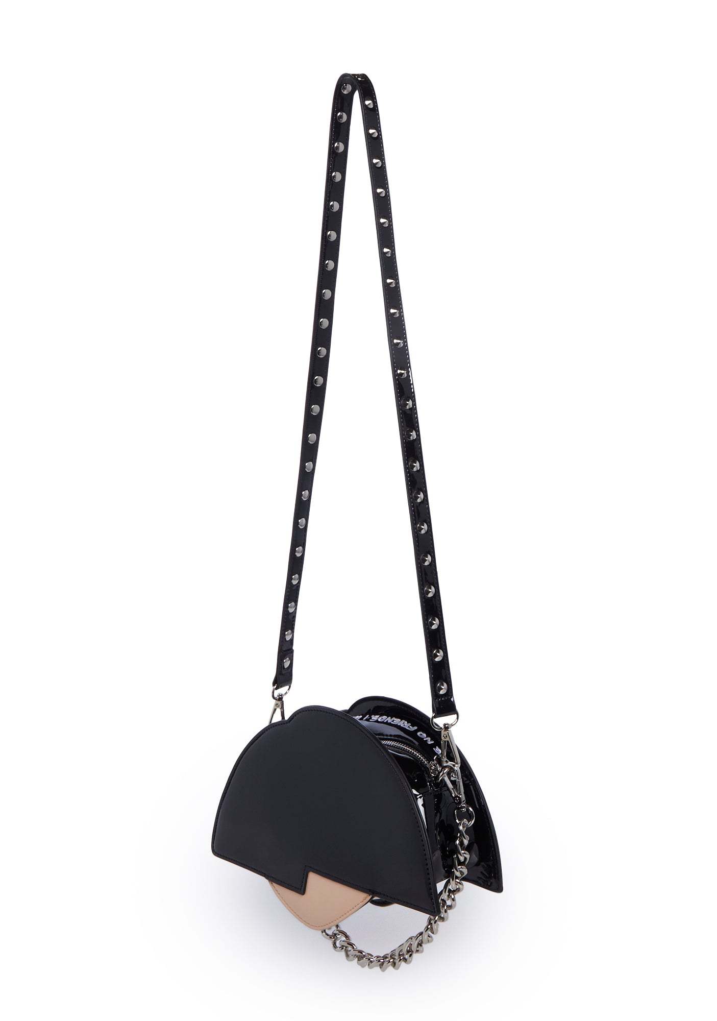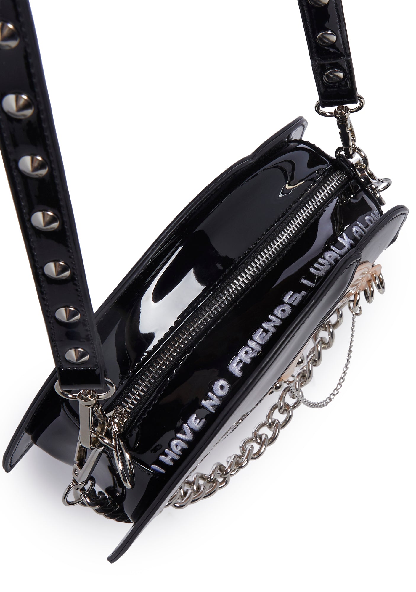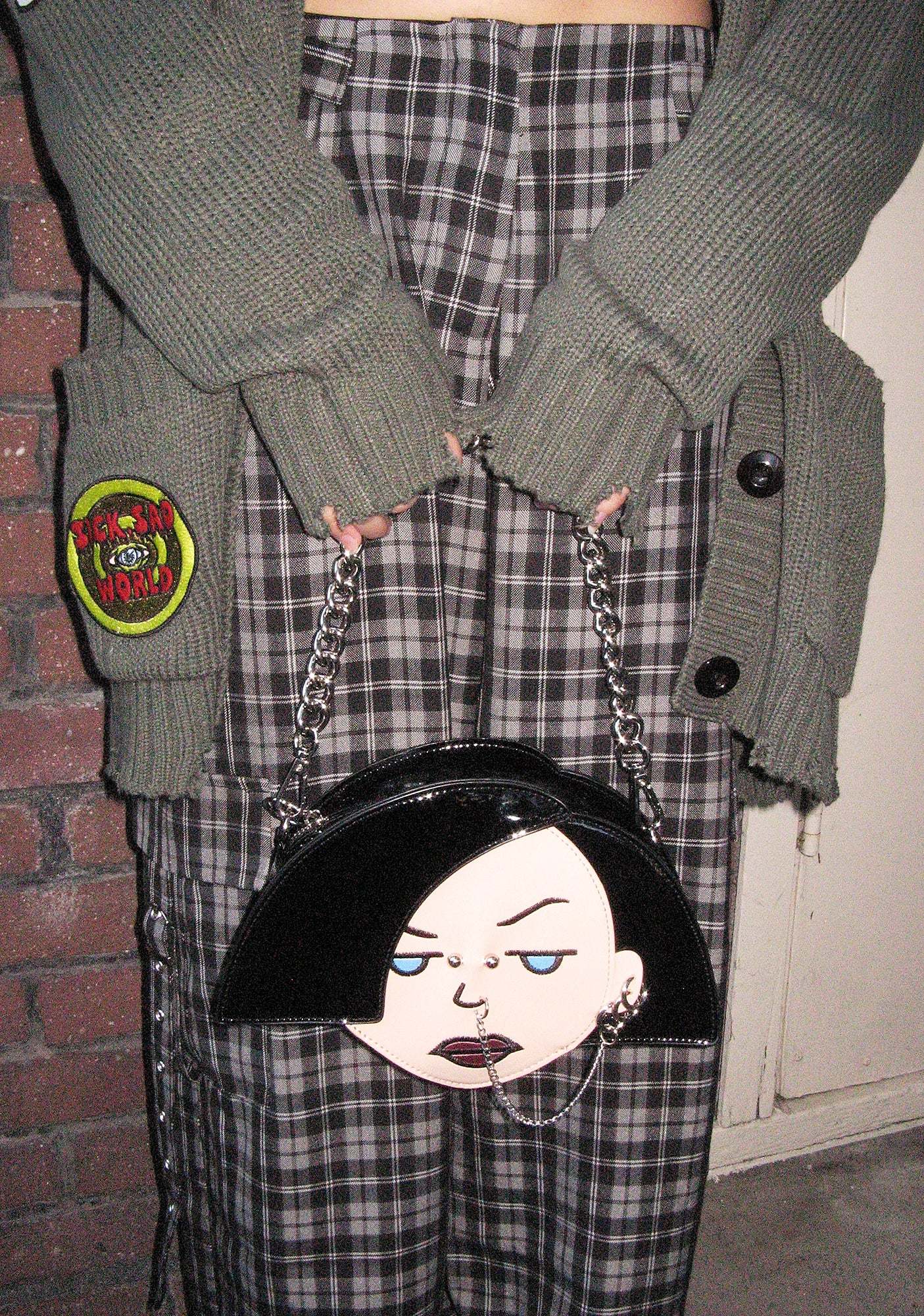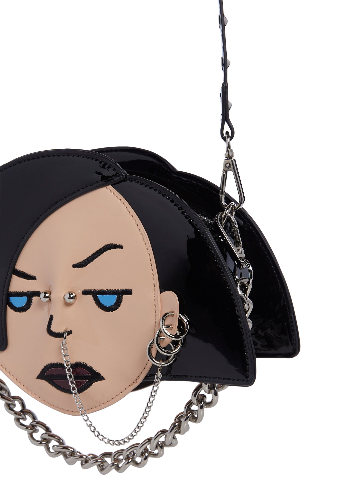cuz she’s anything but. This bag has a patent vinyl construction, is shaped like Jane’s head with embroidered detailing and various piercings attached to her face, an embroidered saying at the top, a removable chain link strap, and a removable studded shoulder strap.