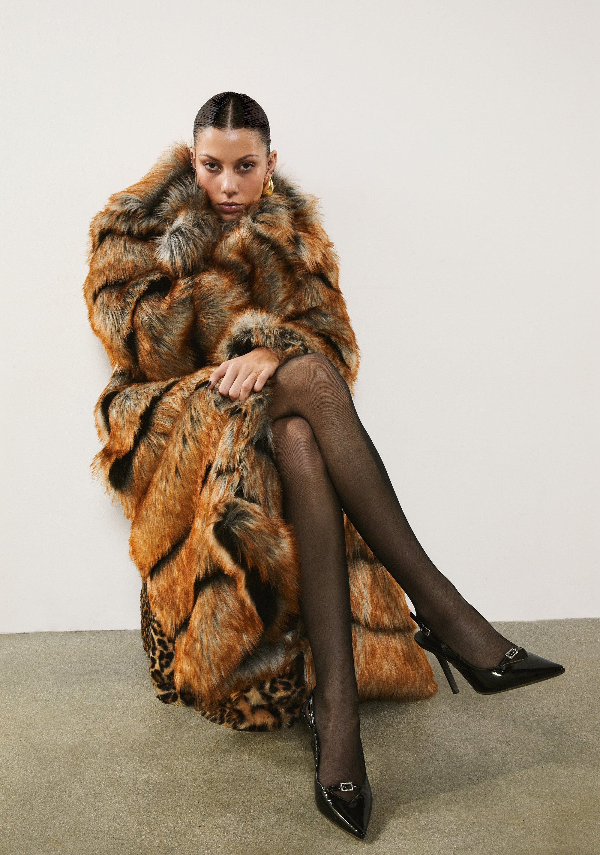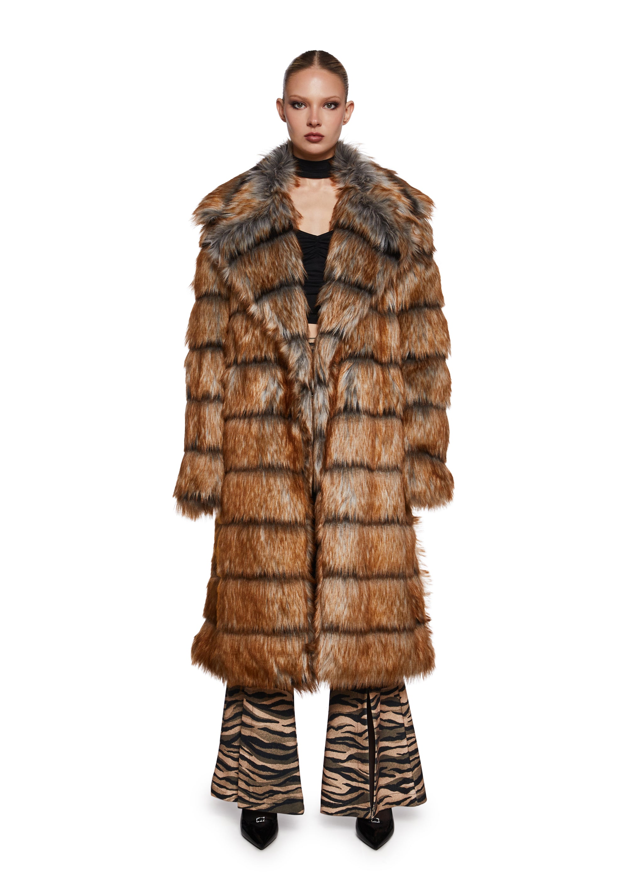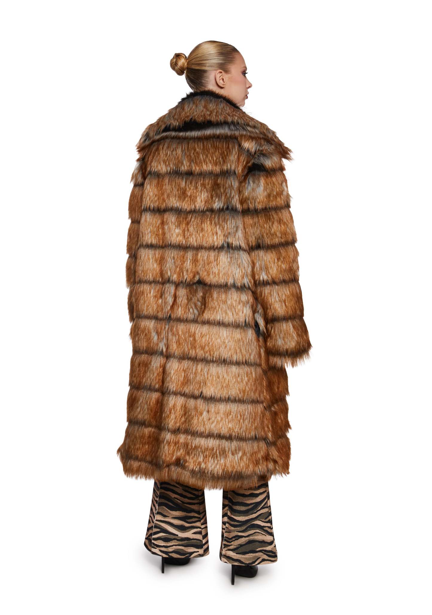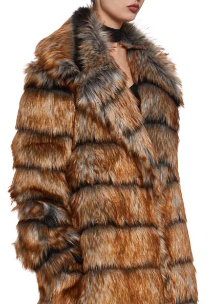 Take the reins while wearing this coat that has a fuzzy faux fur construction, a tiered design, a large notched lapel collar, a quilted padded lining, inner pockets, side pockets, and front hook closures.