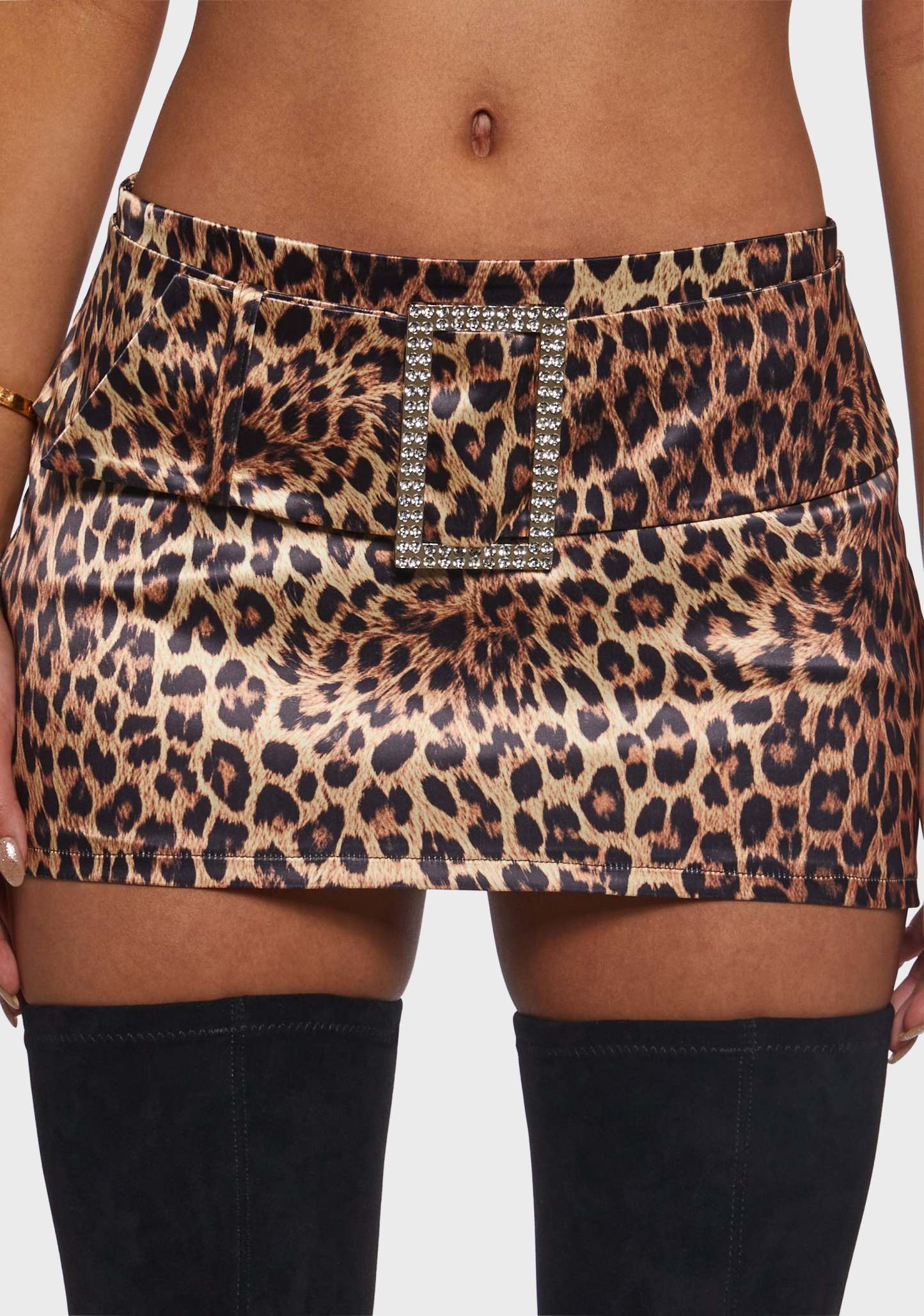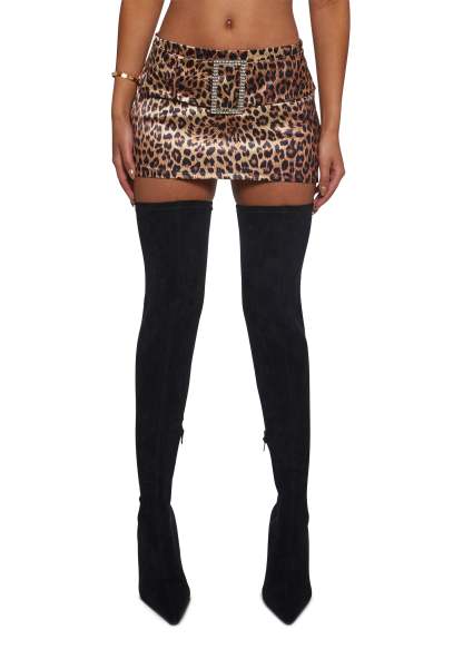 Roar away with this skort that has a satin construction, an all over leopard print, and a belt closure with a rhinestone buckle. Details:-Satin skort design-All-over leopard print-Belt closure with a rhinestone buckleStyle with: Pair with over-the-knee boots and a crossbody bag for a casual look, or add sleek heels and a clutch for a chic evening outfit.